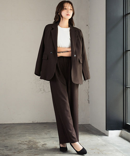 テーラージャケットとワイドパンツの2点セットアップスーツ。