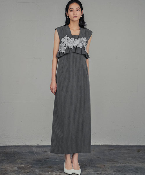 マニッシュなピンストライプに繊細な刺繍レースのビスチェを重ねたセットドレス。