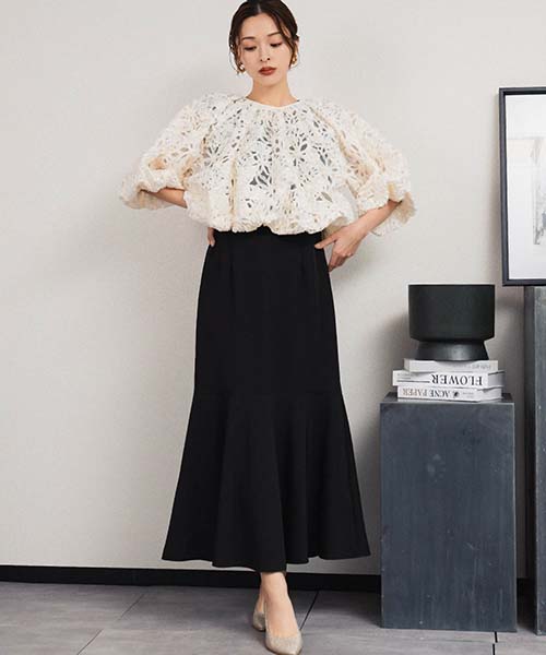 マーメイドラインの縦長効果とナロー丈の足首見せが華奢なイメージを与えてくれます。
