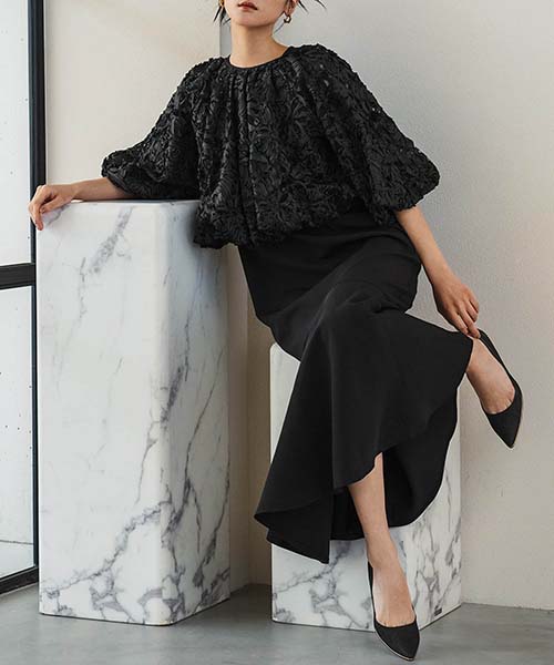 結婚式の二次会やパーティーなどのフォーマルシーンのお呼ばれはもちろん、お食事会や謝恩会、プライベートからオケージョンまで幅広いシーンで活躍するパーティードレスです。