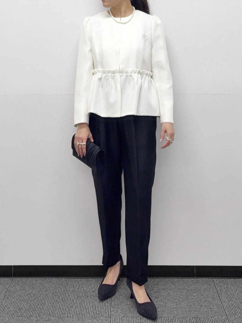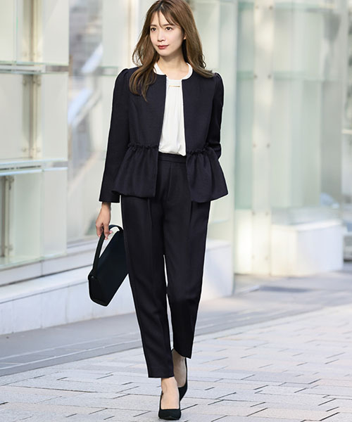 ジャケットはスッキリとしたクルーネックにペプラム部分にギャザーを施した、大人可愛いアイテム。
