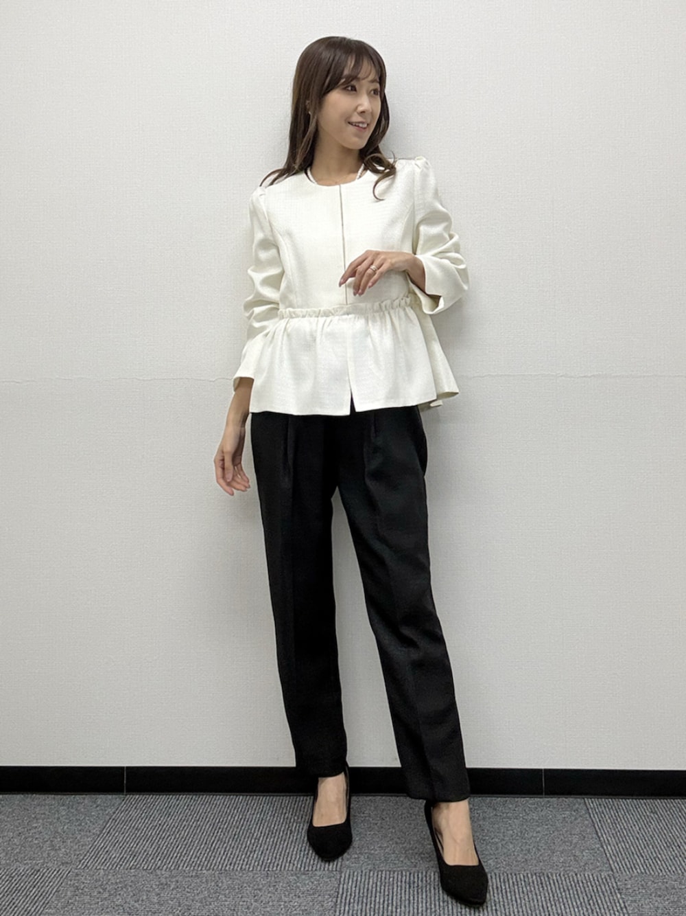 ジャケットの袖は二の腕をカバーし、ペプラムのギャザーデザインが、腰回りをカバーしてくれます。