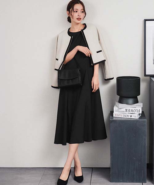 バイカラーラインクルーネックショート丈ジャケットとフレンチスリーブフレアワンピースの2点セット。