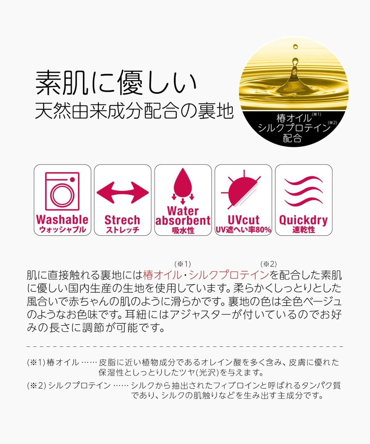 肌に直接触れる裏地には、椿オイル・シルクプロテインを配合した素肌にやさしい国内産の生地を使用。