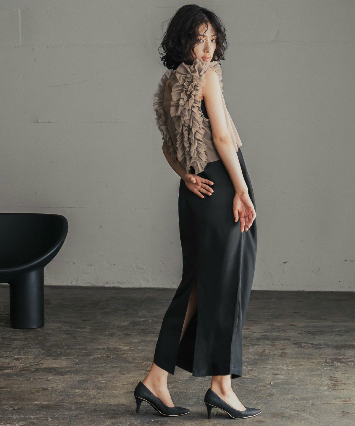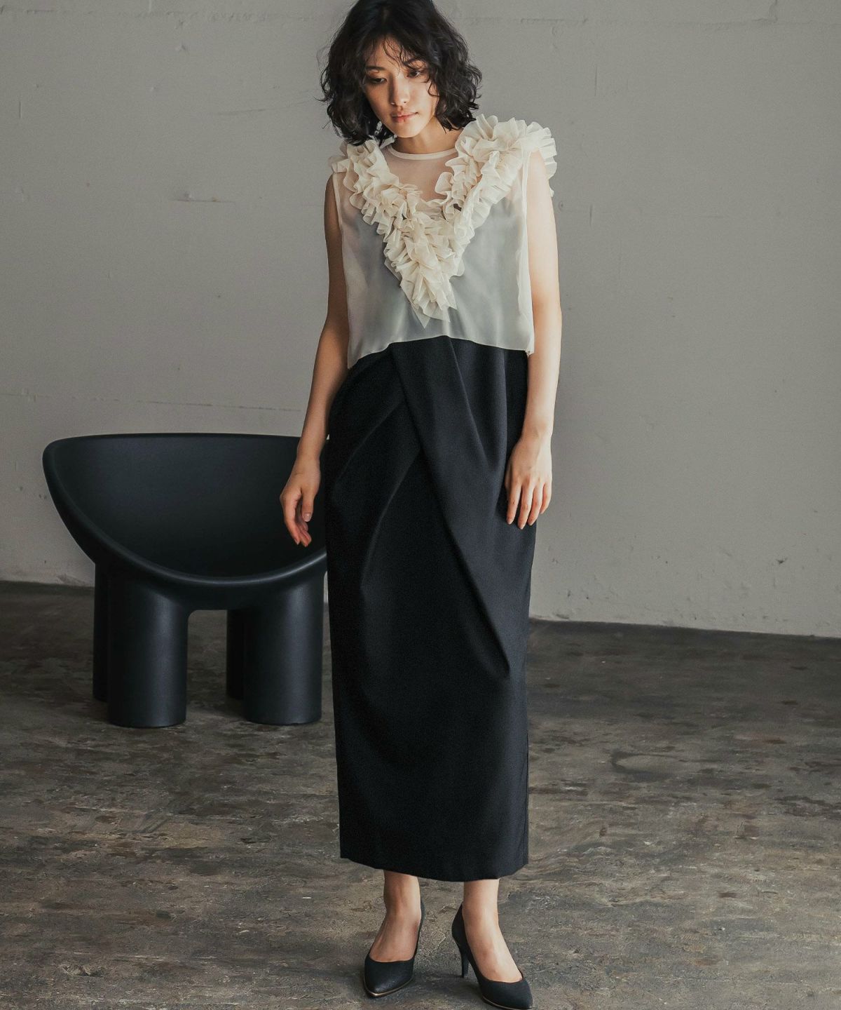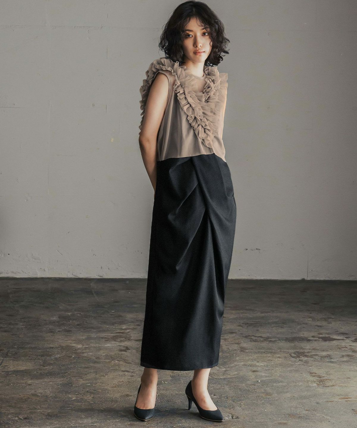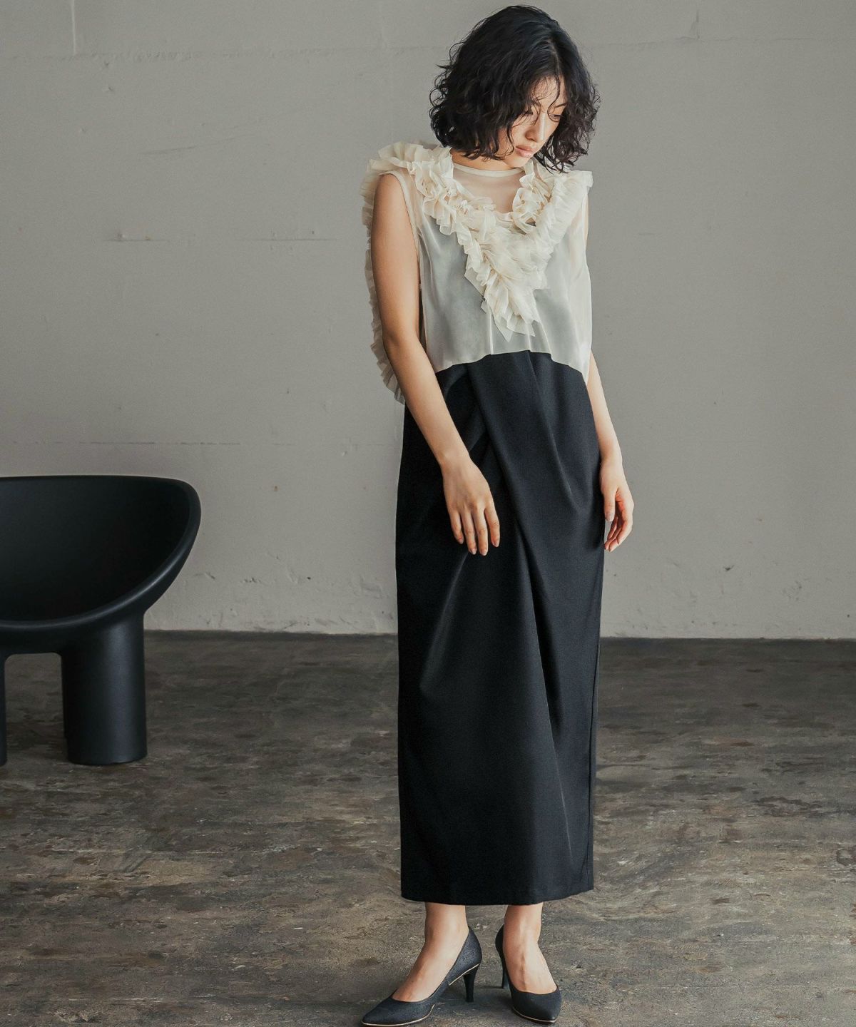 5. チュールフリルベスト&スレンダーワンピースロング結婚式オケージョンお呼ばれワンピースパーティードレス