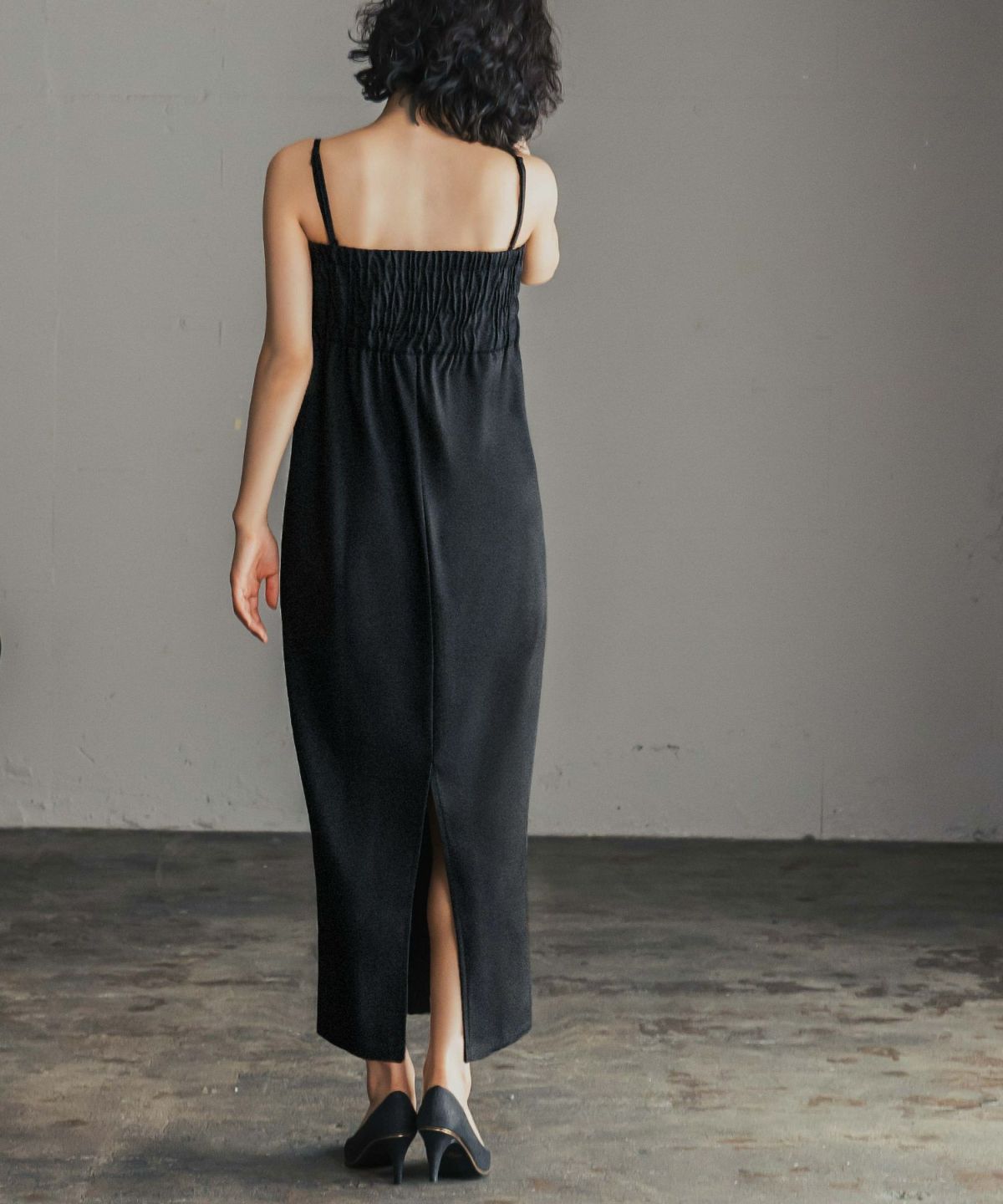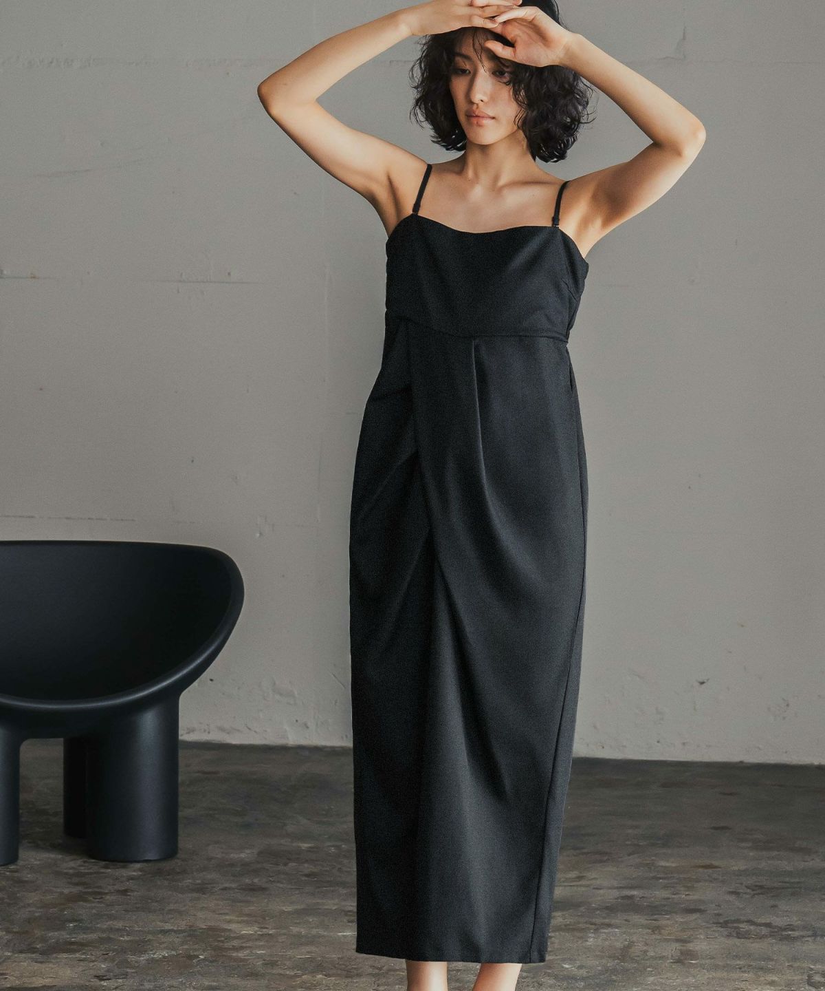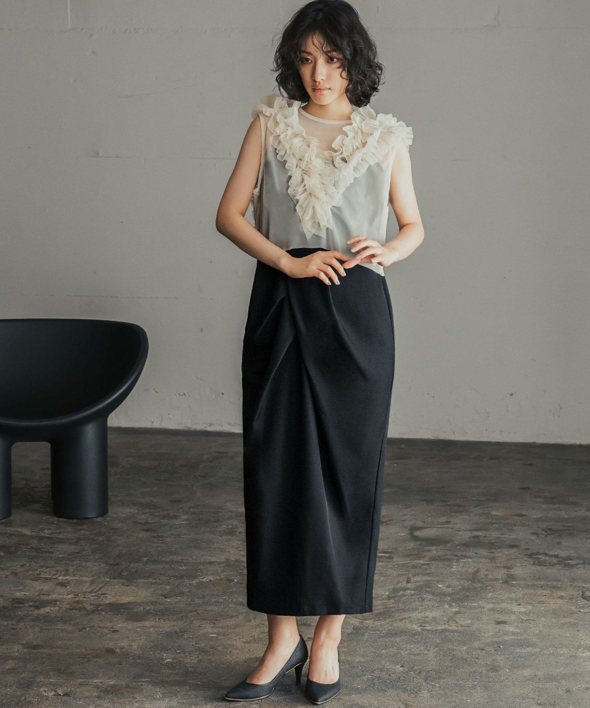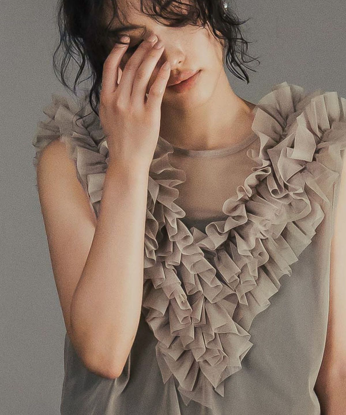 特別なシーンにピッタリなチュールフリルベストとリネンタッチ2wayタックキャミワンピースの華やかなセットアイテム。