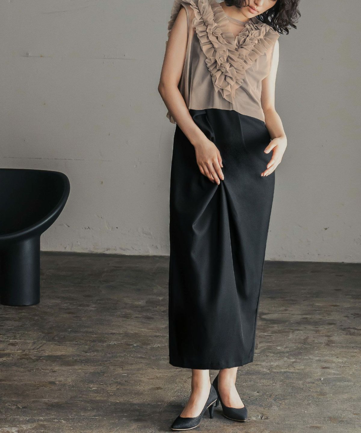 4. チュールフリルベスト&スレンダーワンピースロング結婚式オケージョンお呼ばれワンピースパーティードレス