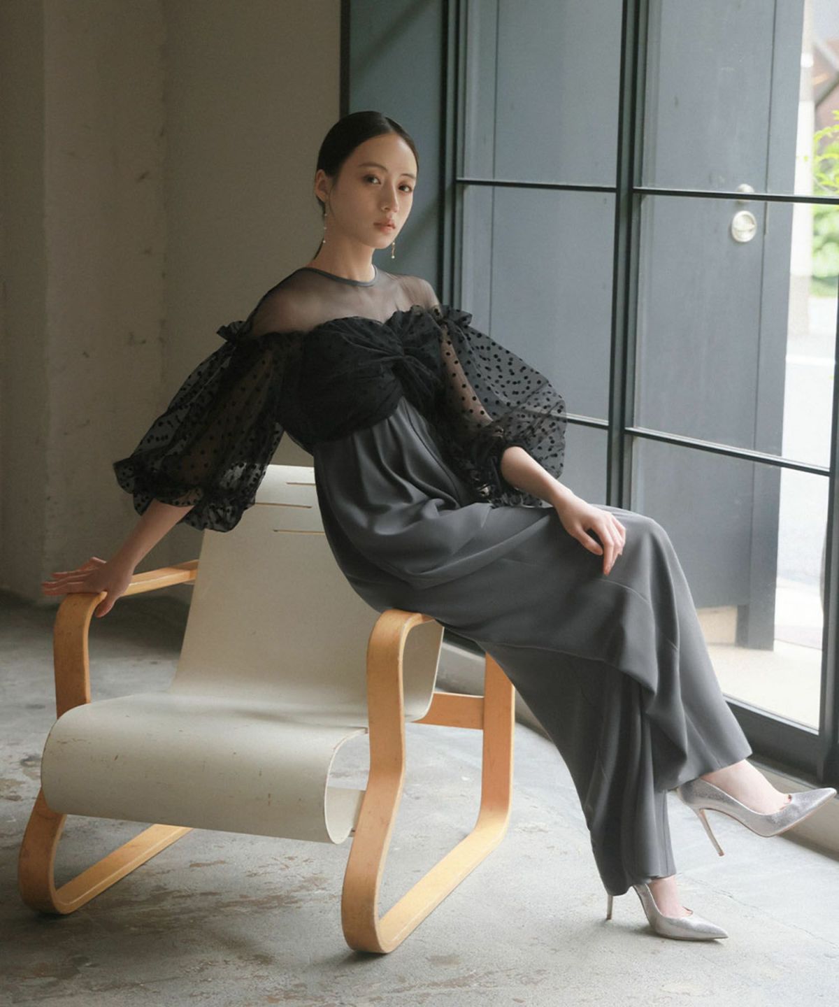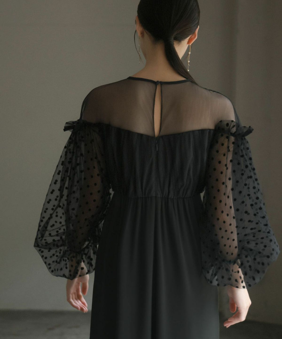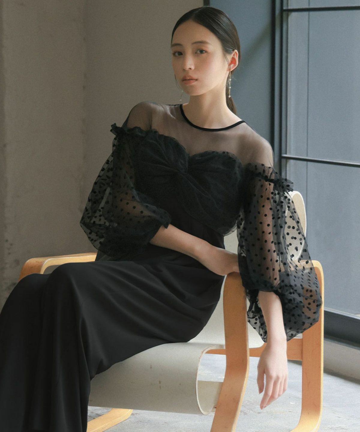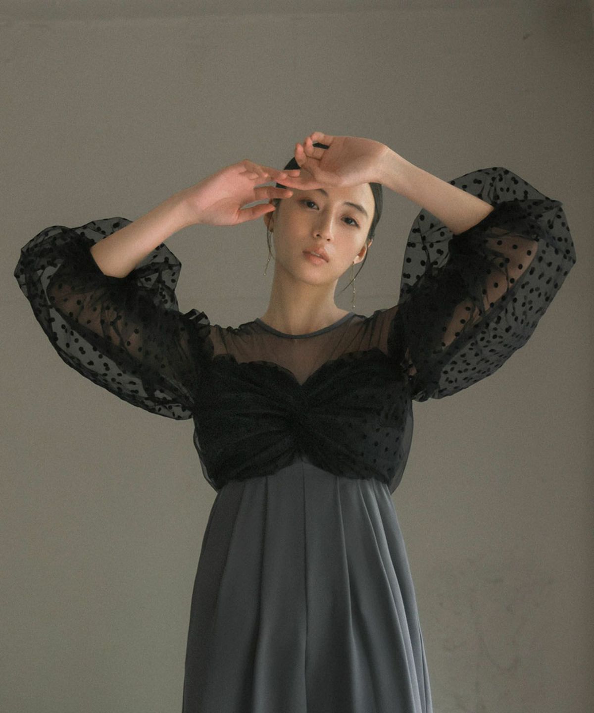 上半身はシアーなデコルテ×エアリーなボリュームを出したフロッキードットで雰囲気たっぷり。