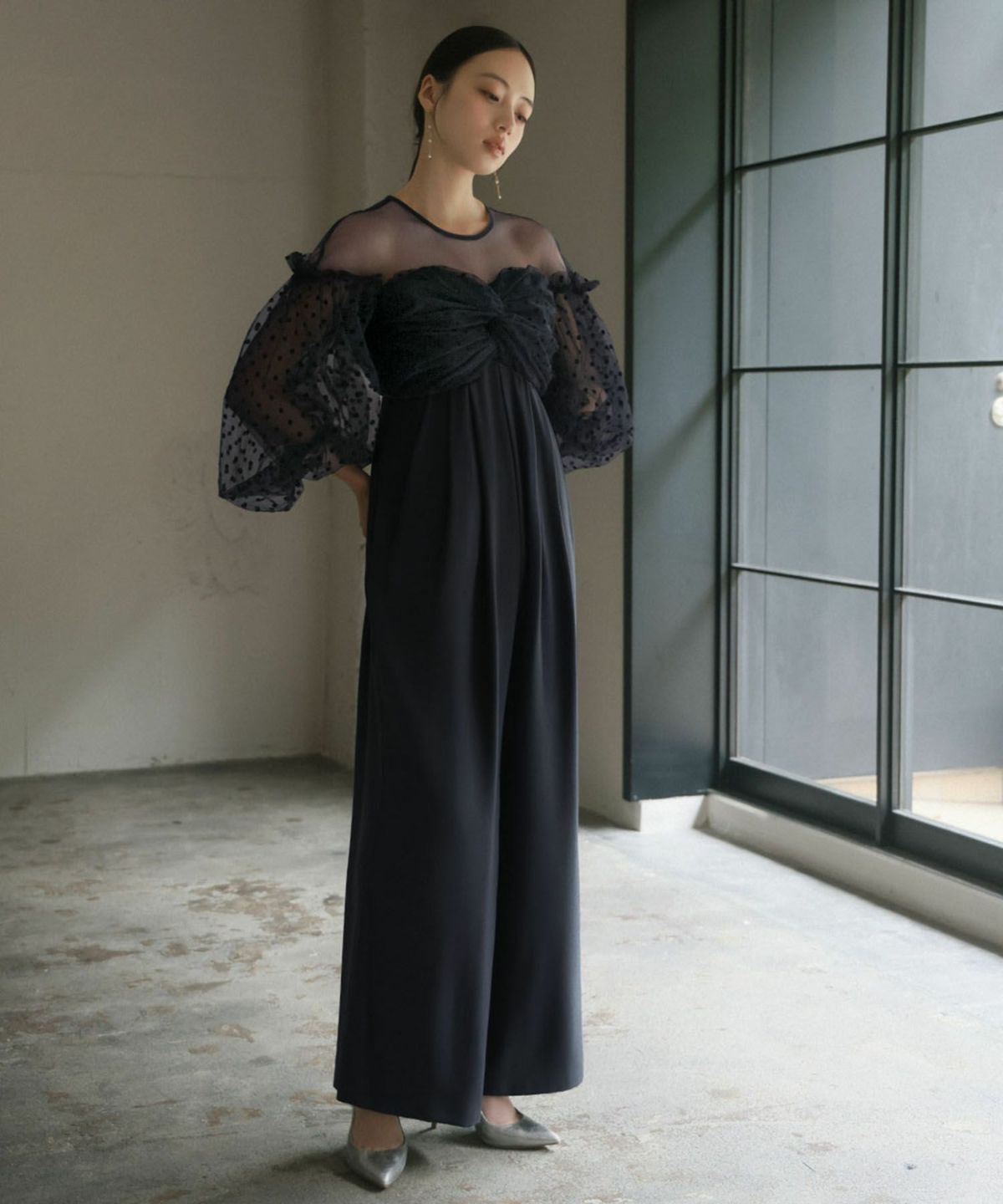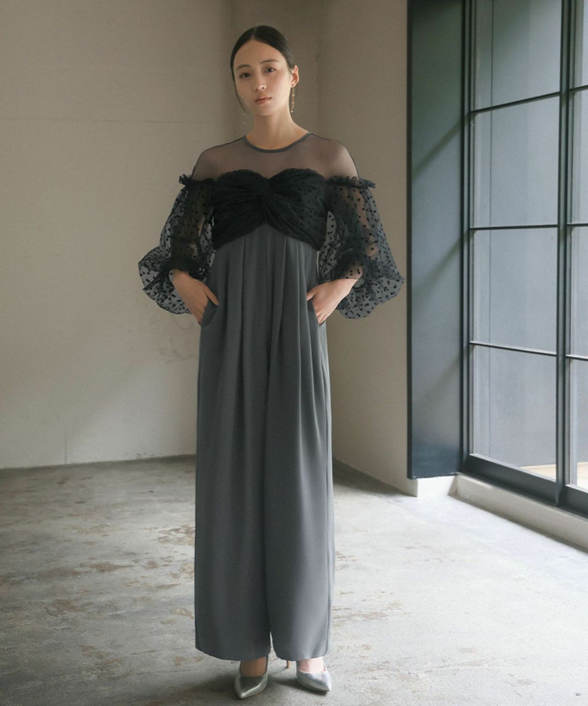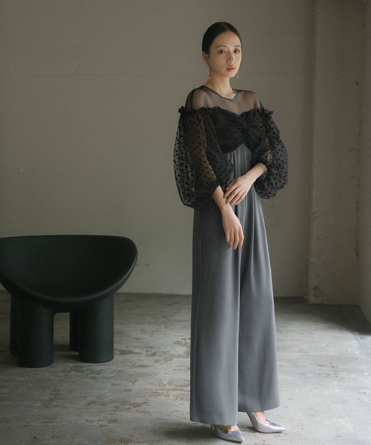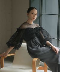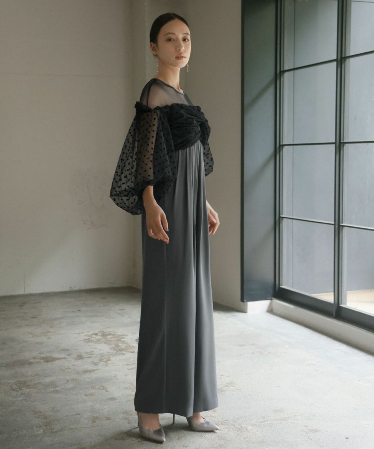 上半身はシアーなデコルテ×エアリーなボリュームを出したフロッキードットで雰囲気たっぷり。