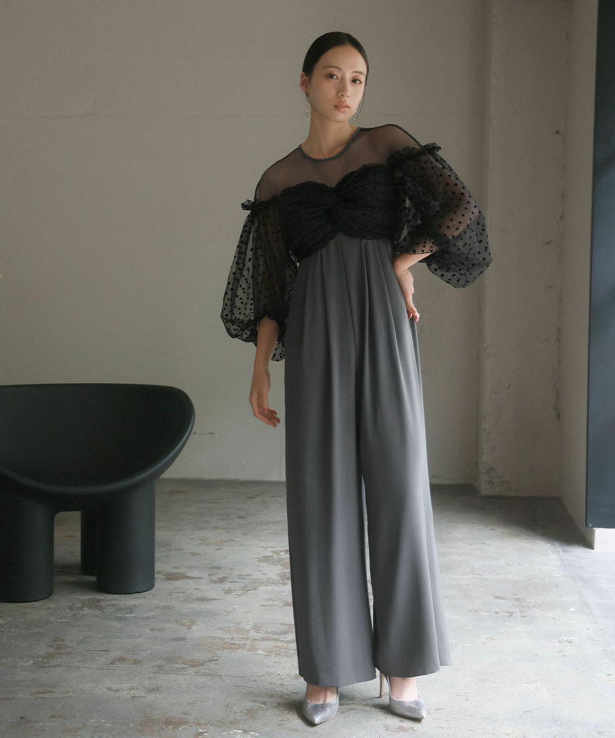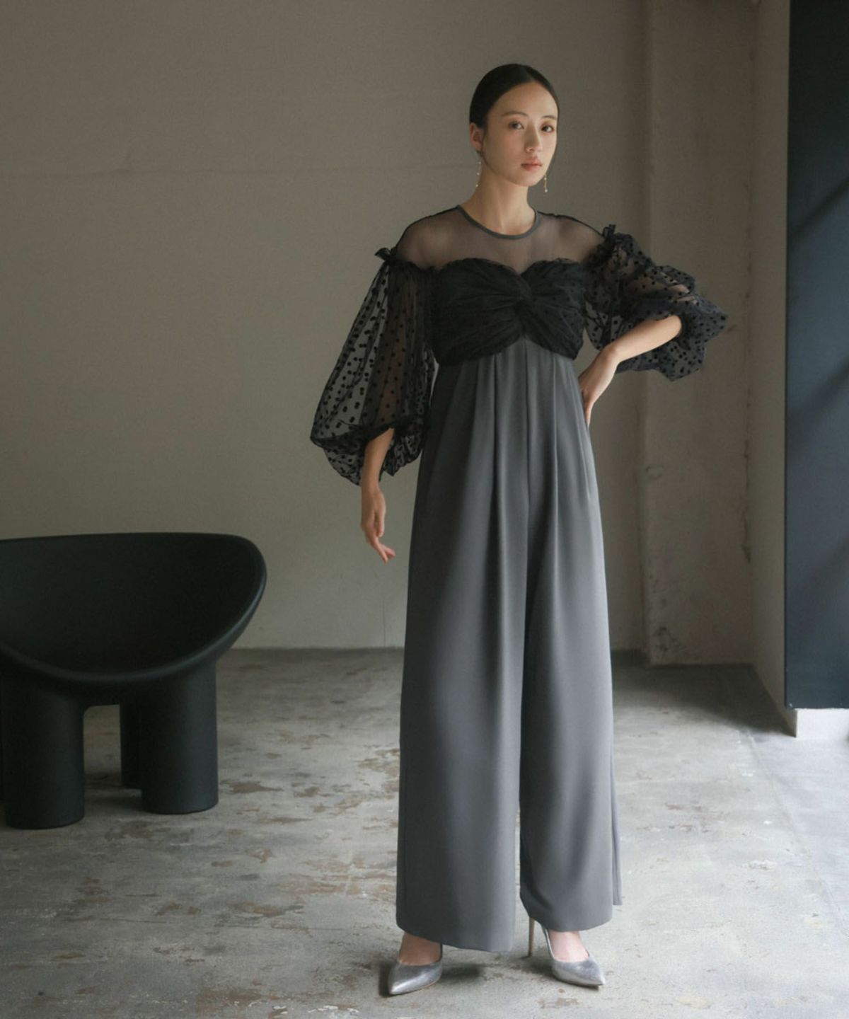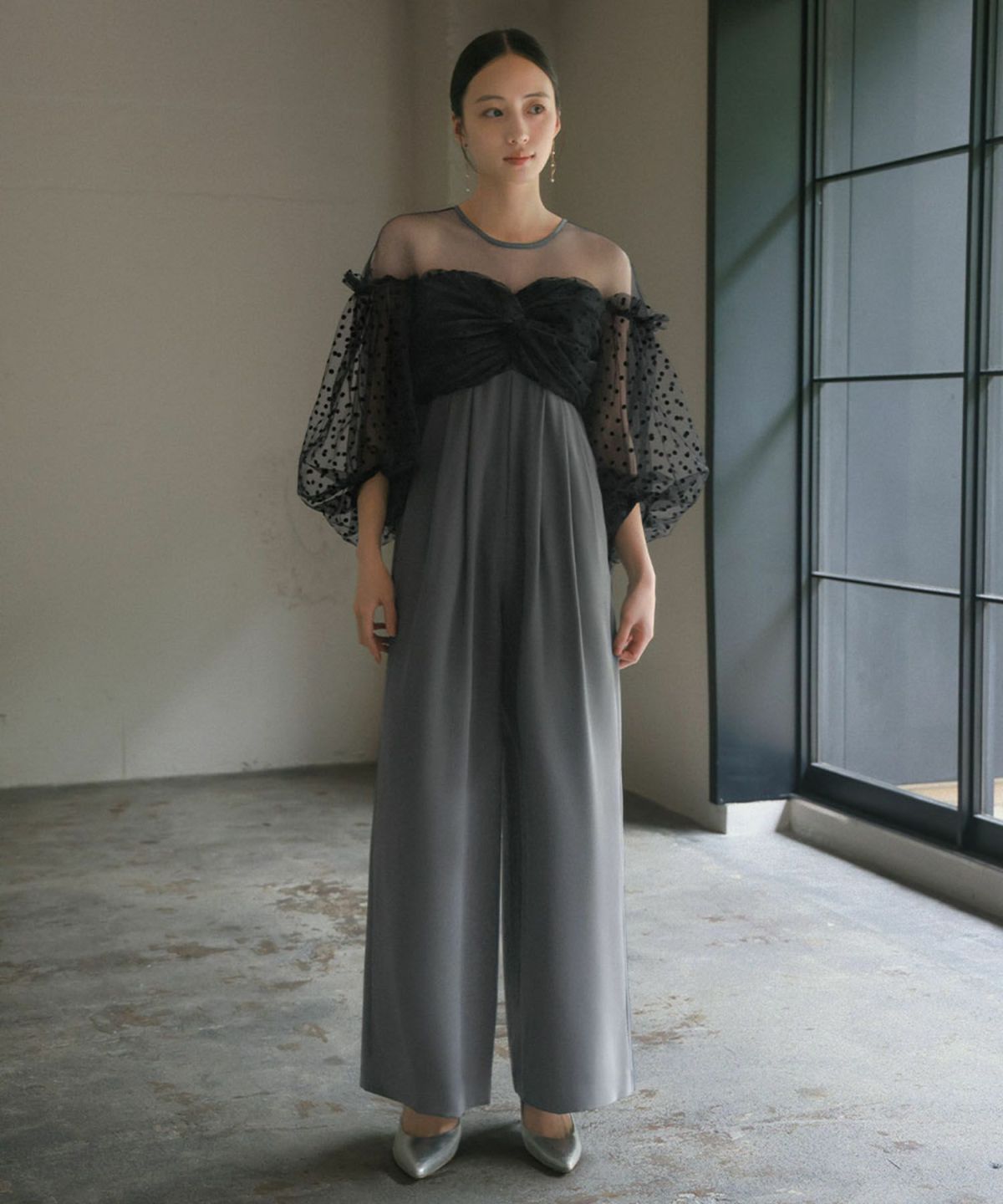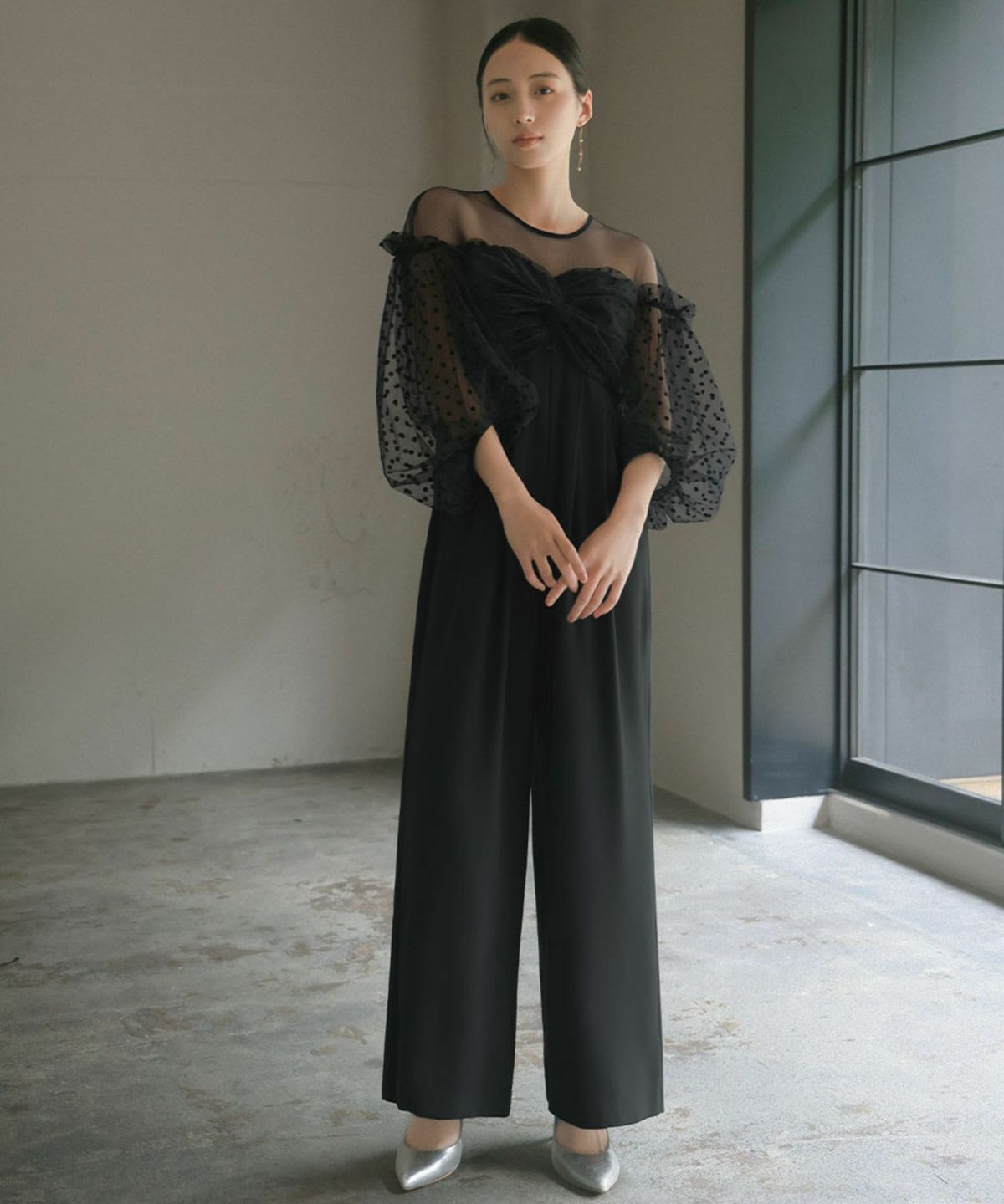 上半身はシアーなデコルテ×エアリーなボリュームを出したフロッキードットで雰囲気たっぷり。