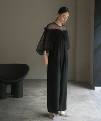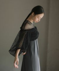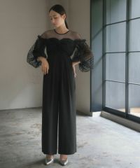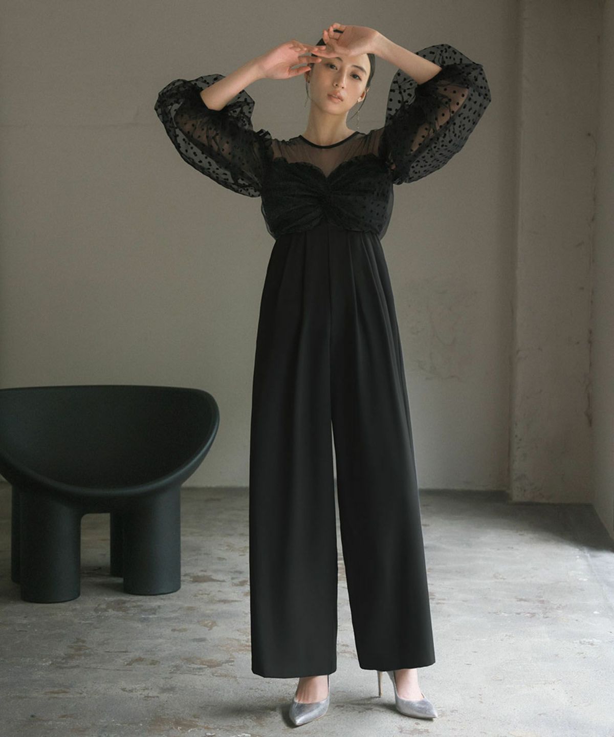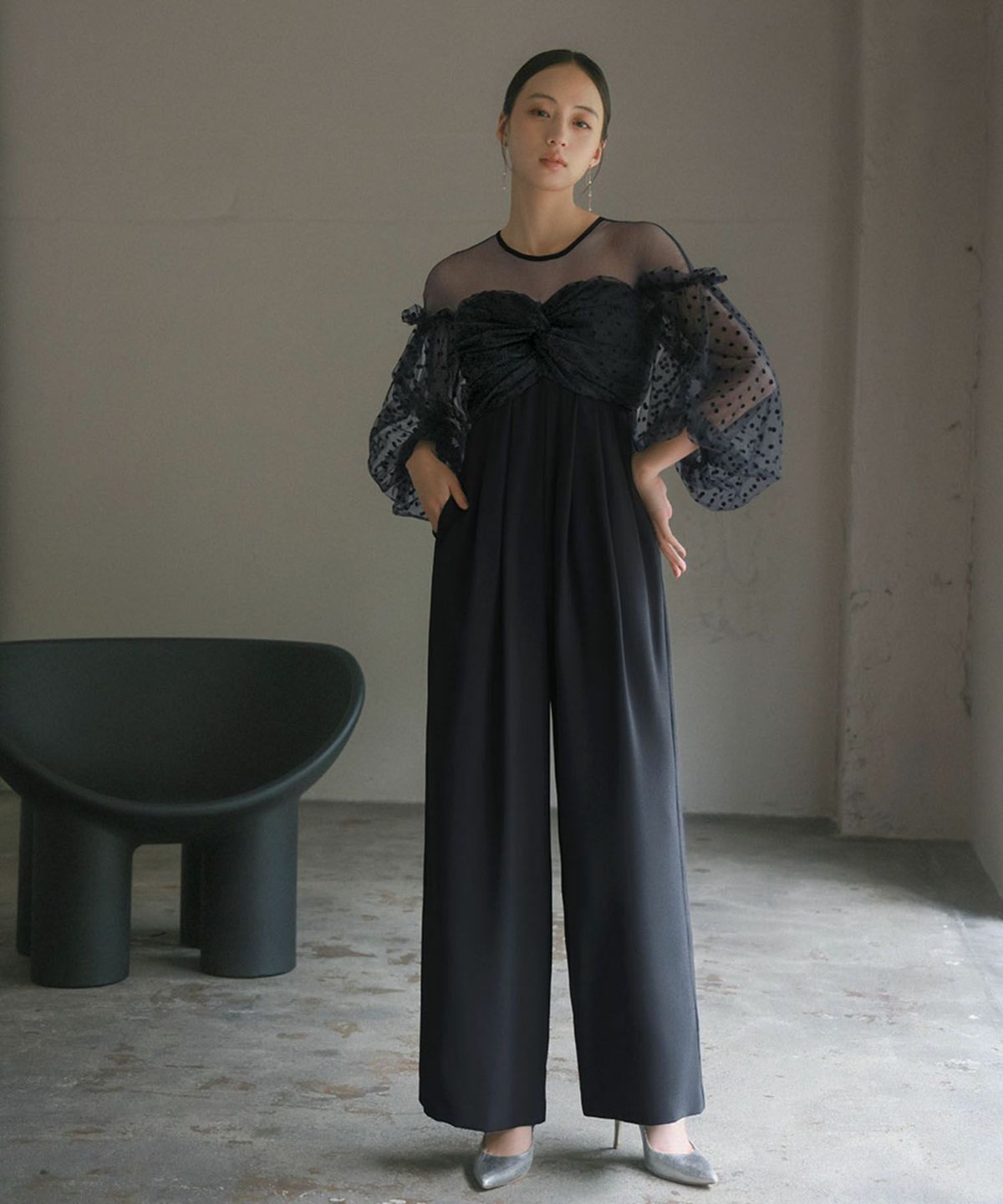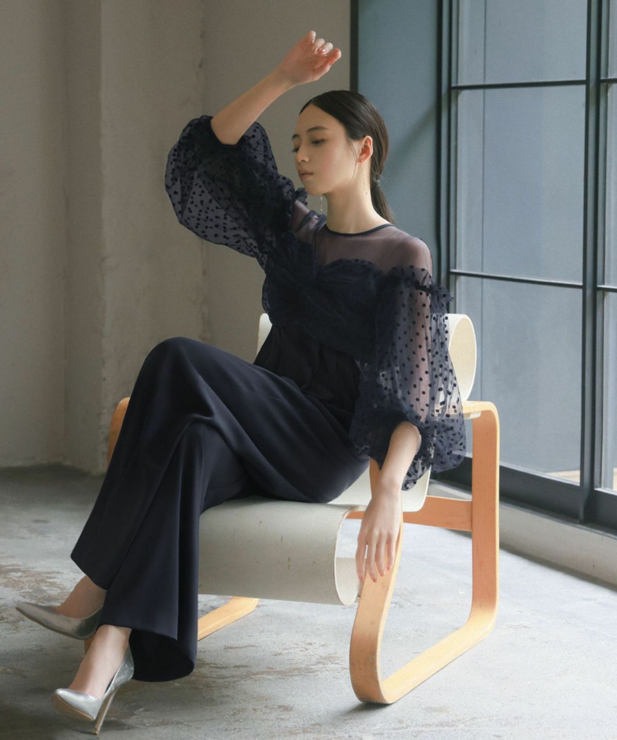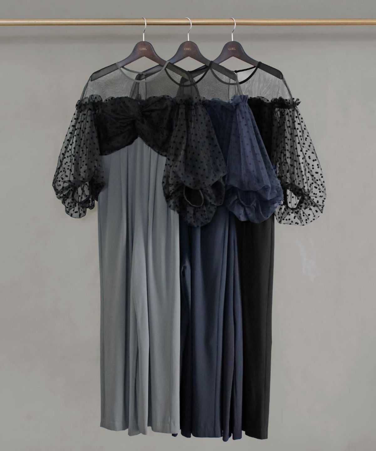 上半身はシアーなデコルテ×エアリーなボリュームを出したフロッキードットで雰囲気たっぷり。