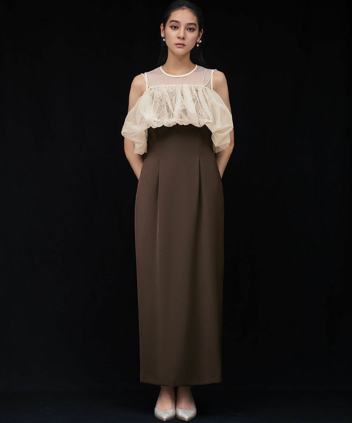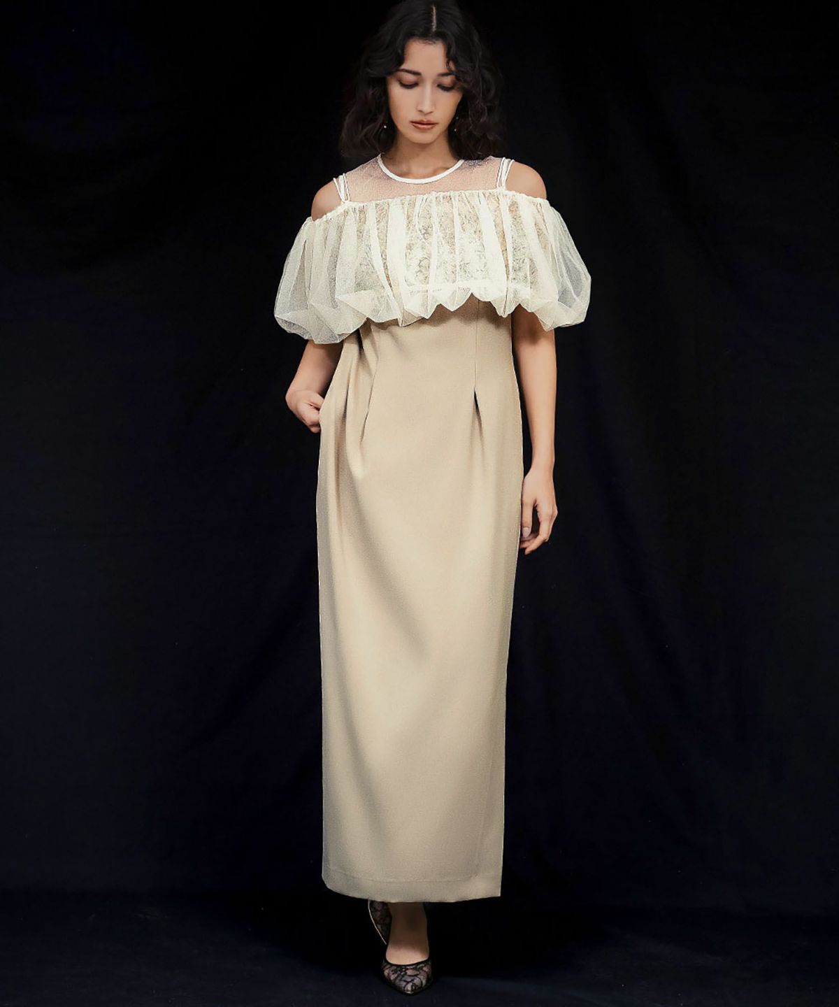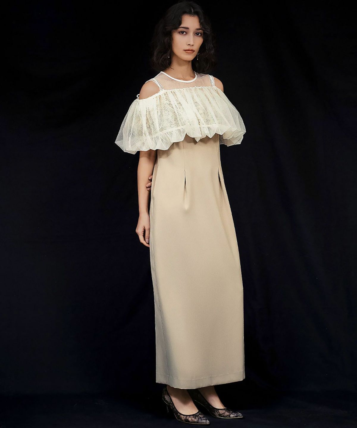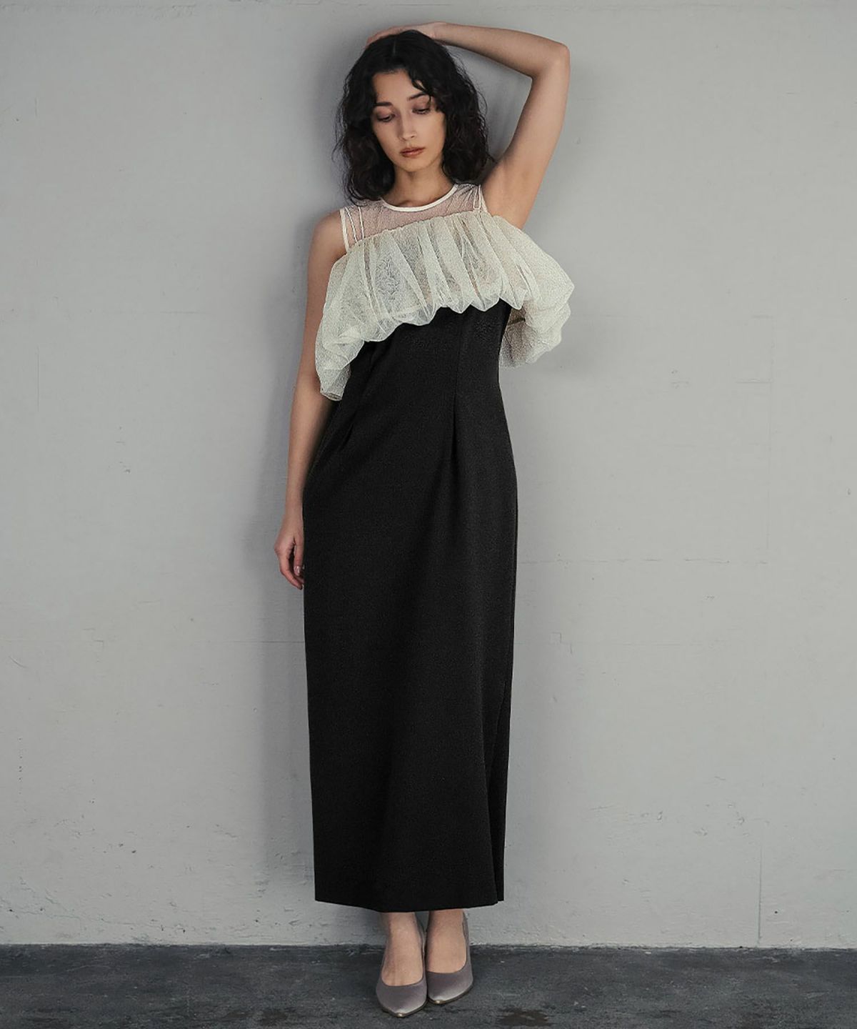 デザイン性をもたせたトップスに合わせるのはミニマルなドレスは、一枚でもさまになる美シルエットで、デコルテのほどよいシアー感が抜けをつくり、洗練された印象に。