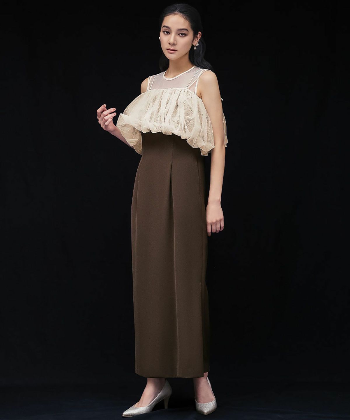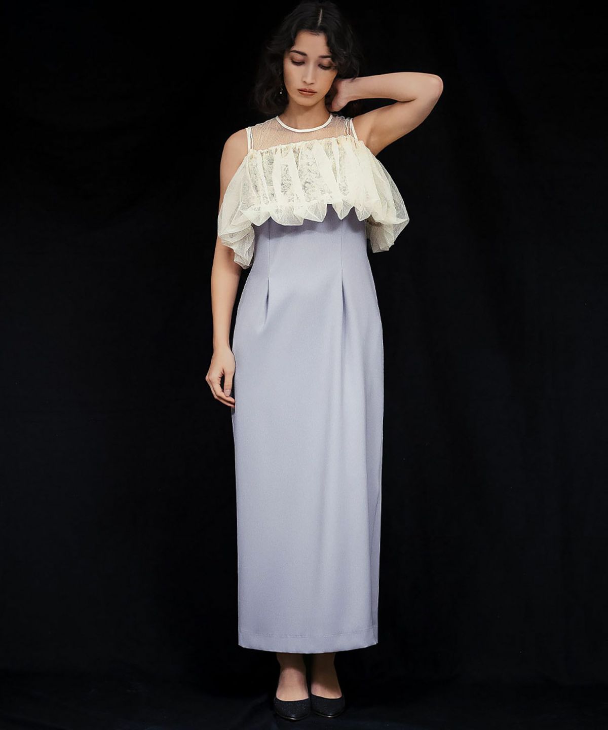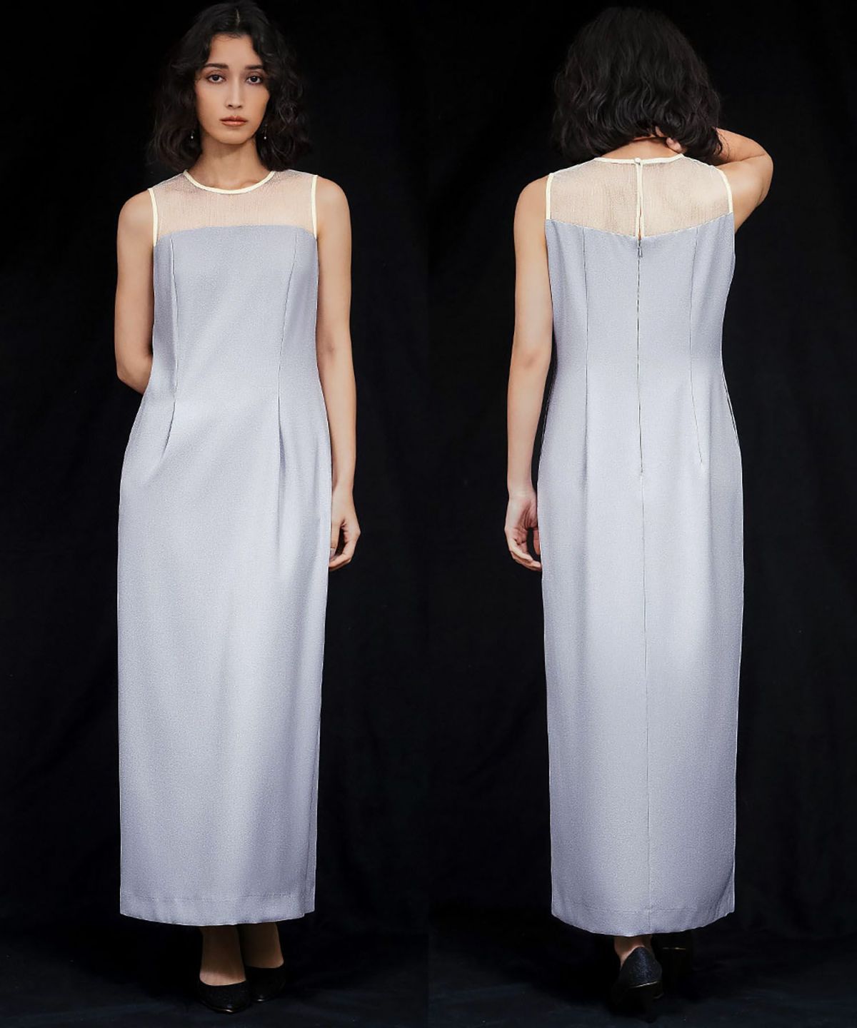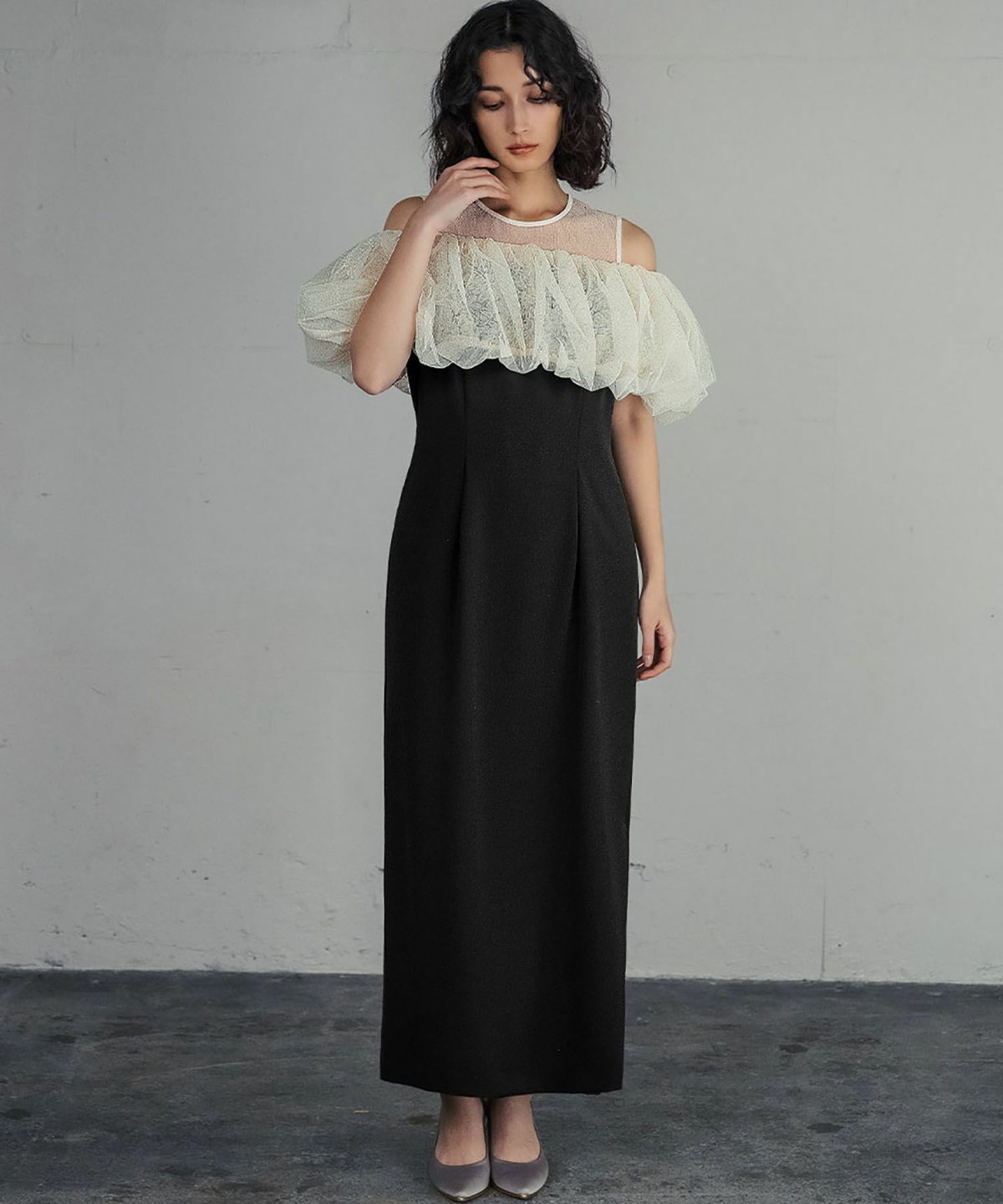 デザイン性をもたせたトップスに合わせるのはミニマルなドレスは、一枚でもさまになる美シルエットで、デコルテのほどよいシアー感が抜けをつくり、洗練された印象に。