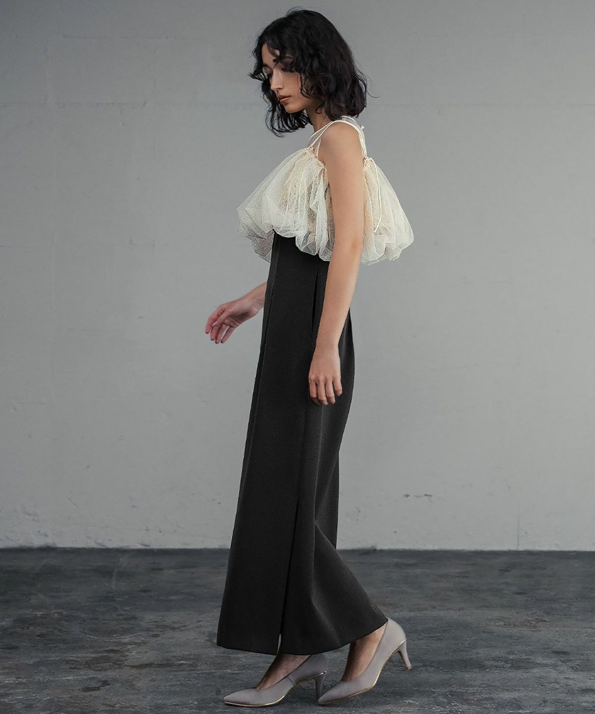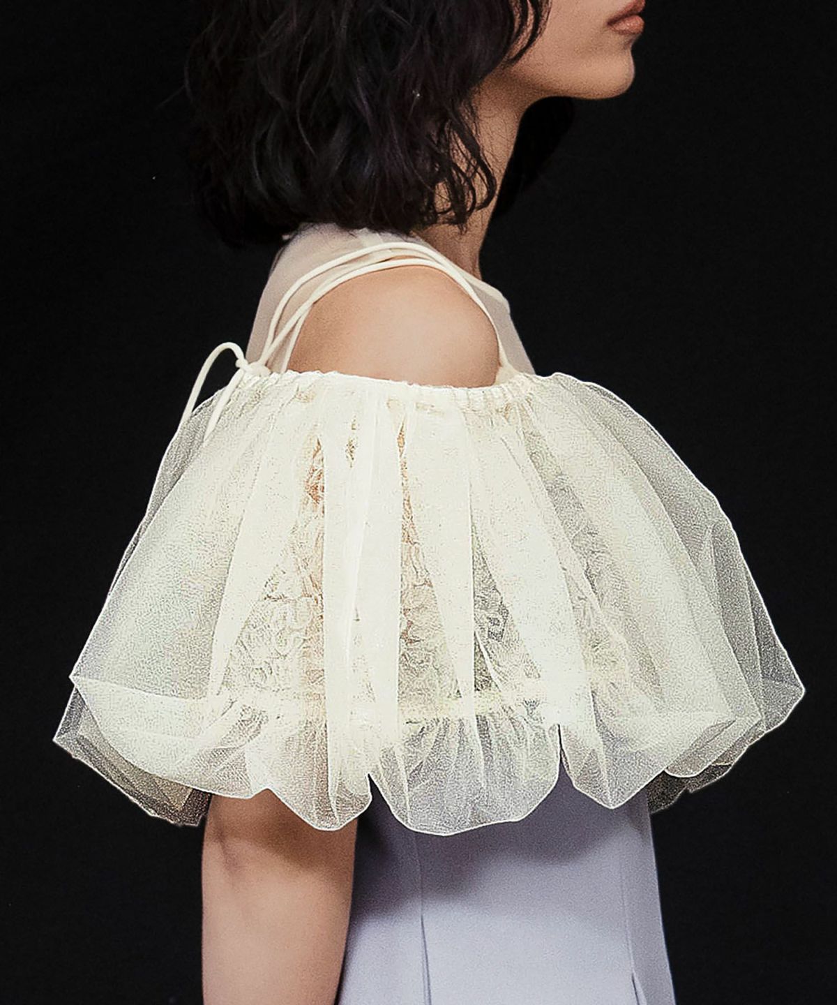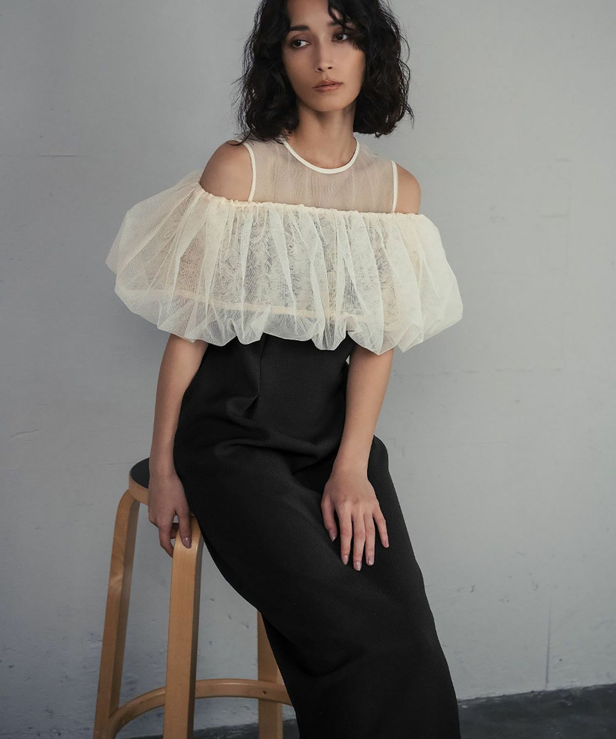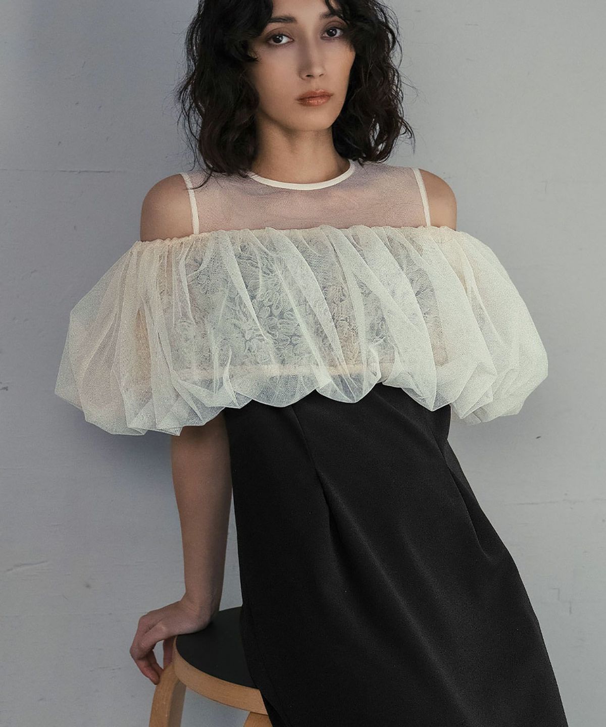 チュールを重ねて作ったバルーンフォルムトップスとミニマルワンピのセットアイテム。