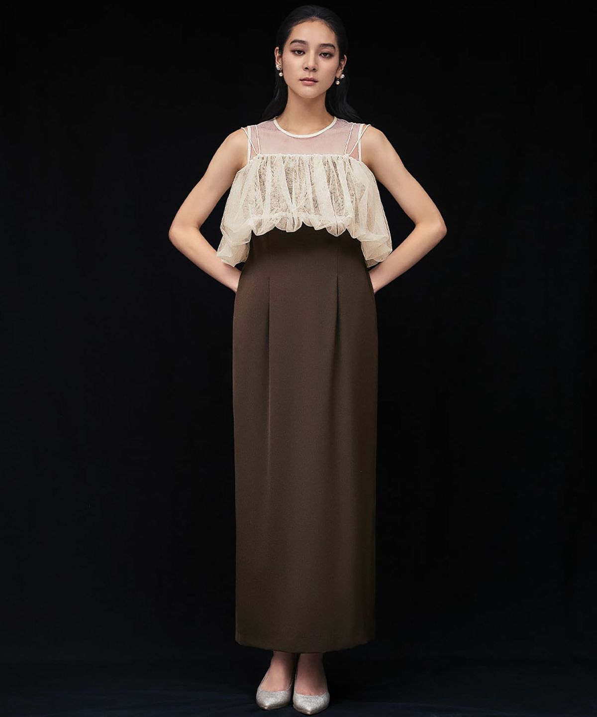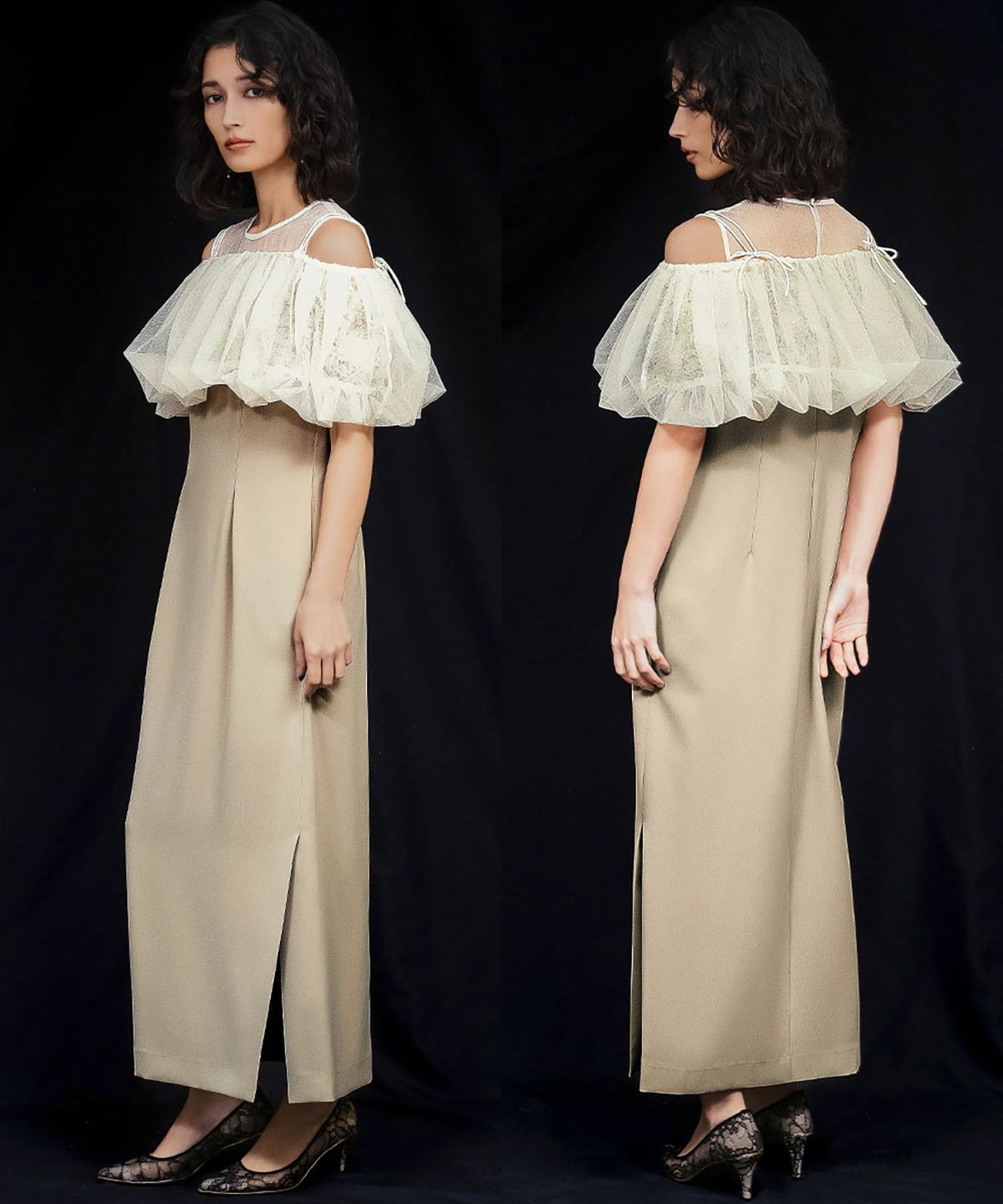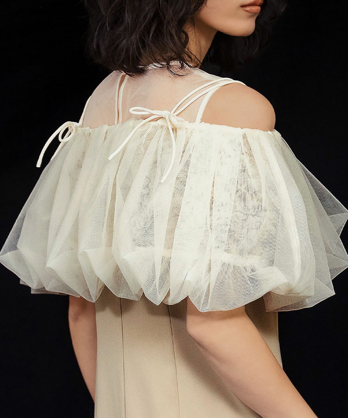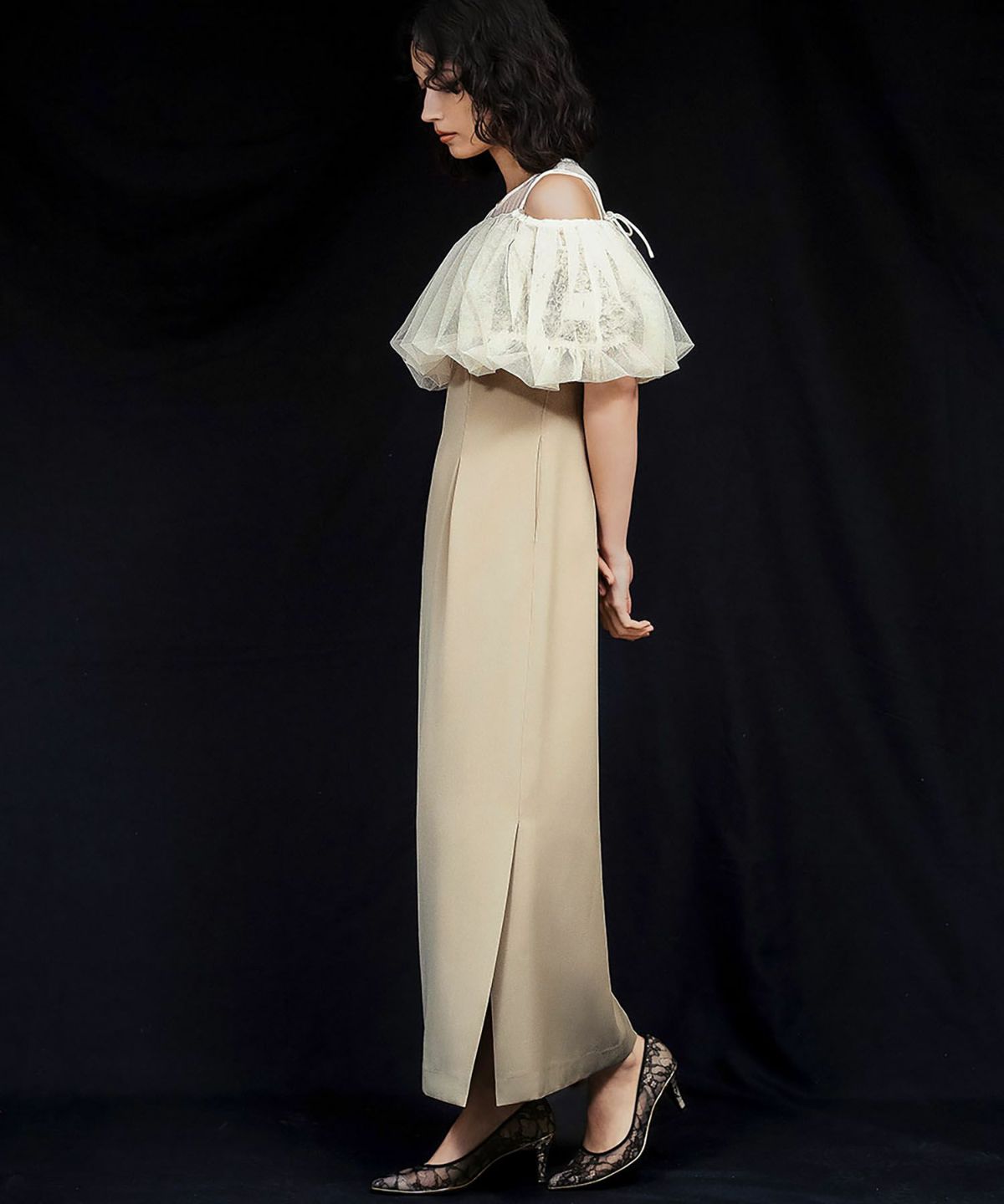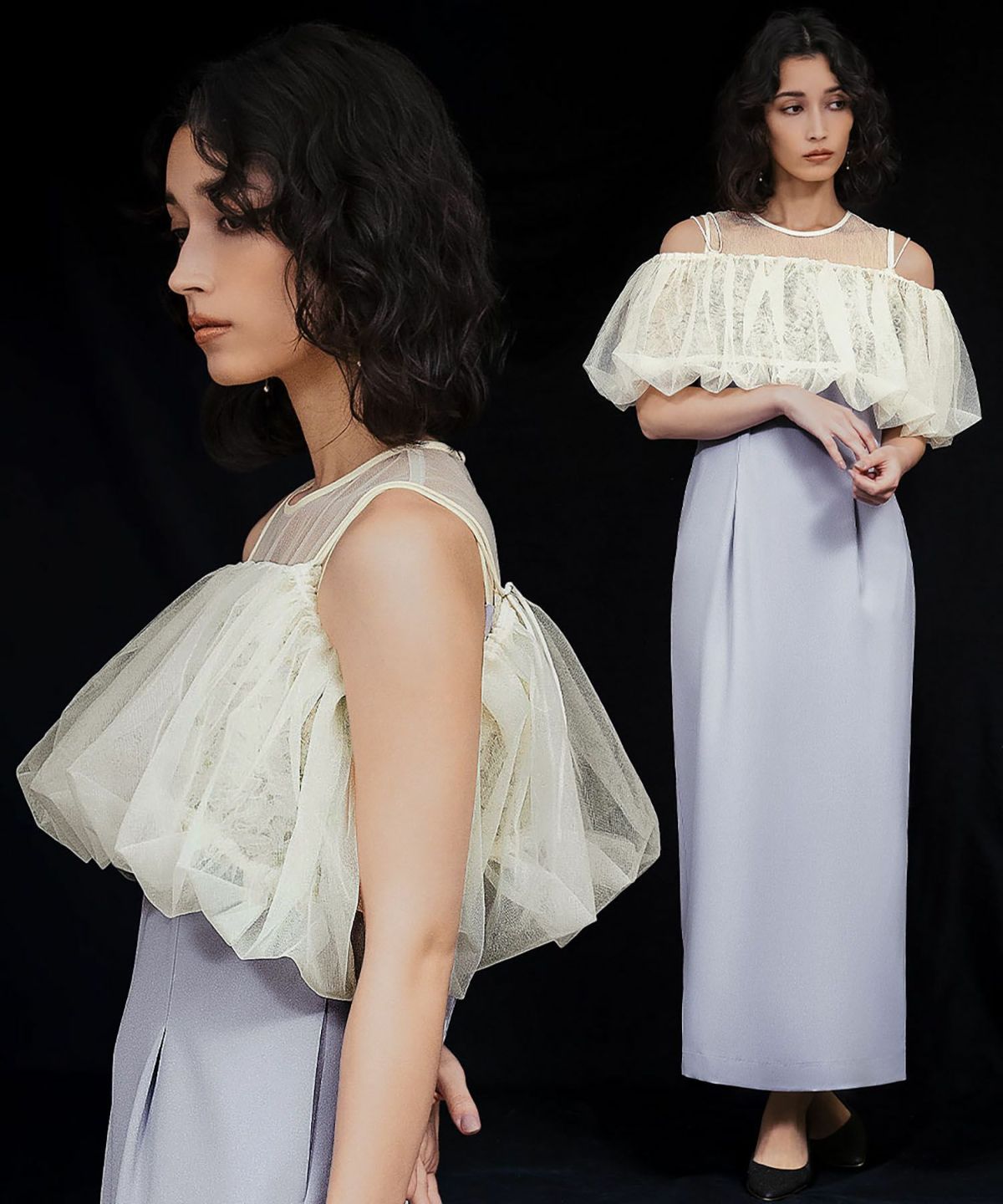 シアーでドライな質感のチュールと、ドレッシーな合繊生地を使用。