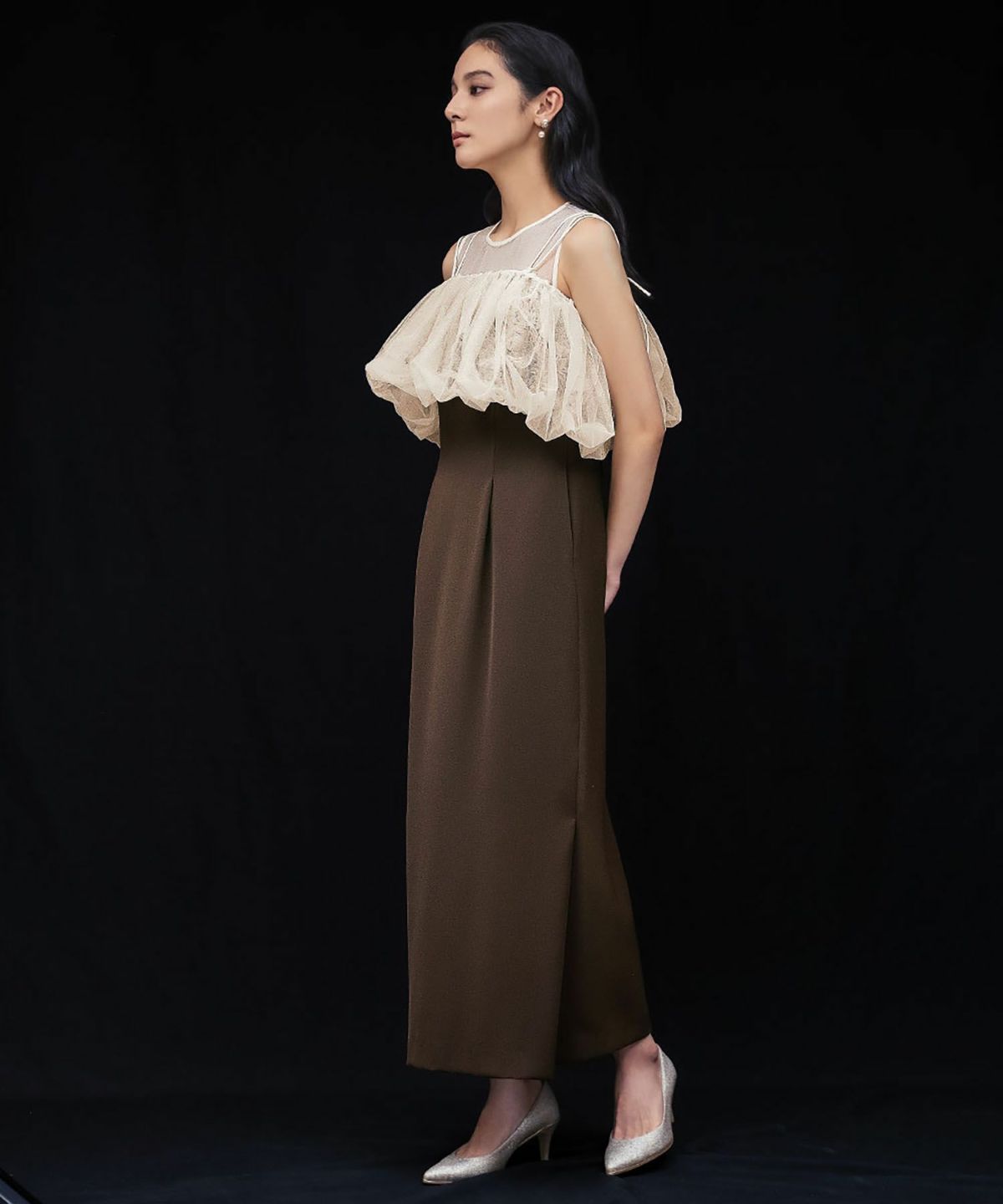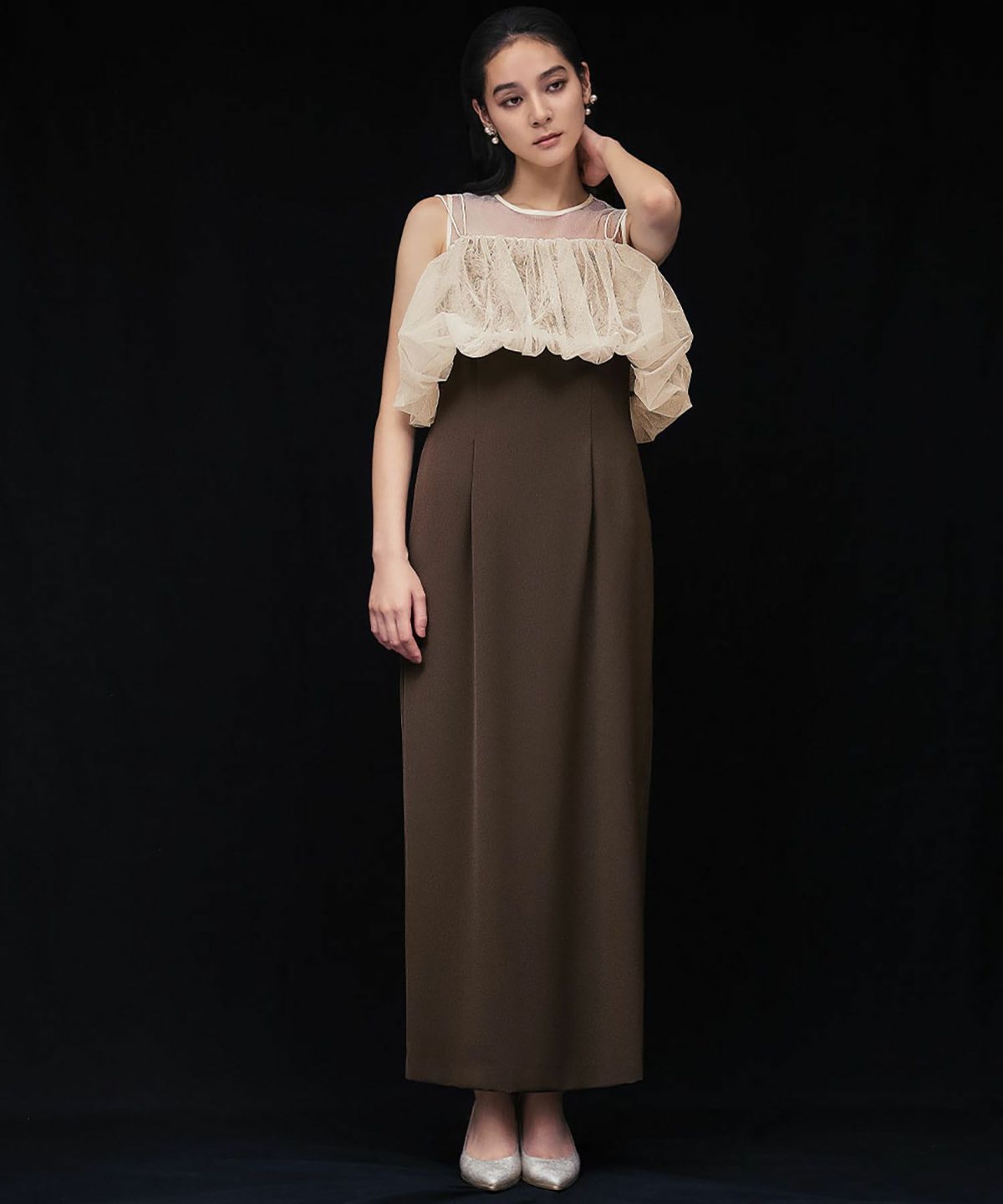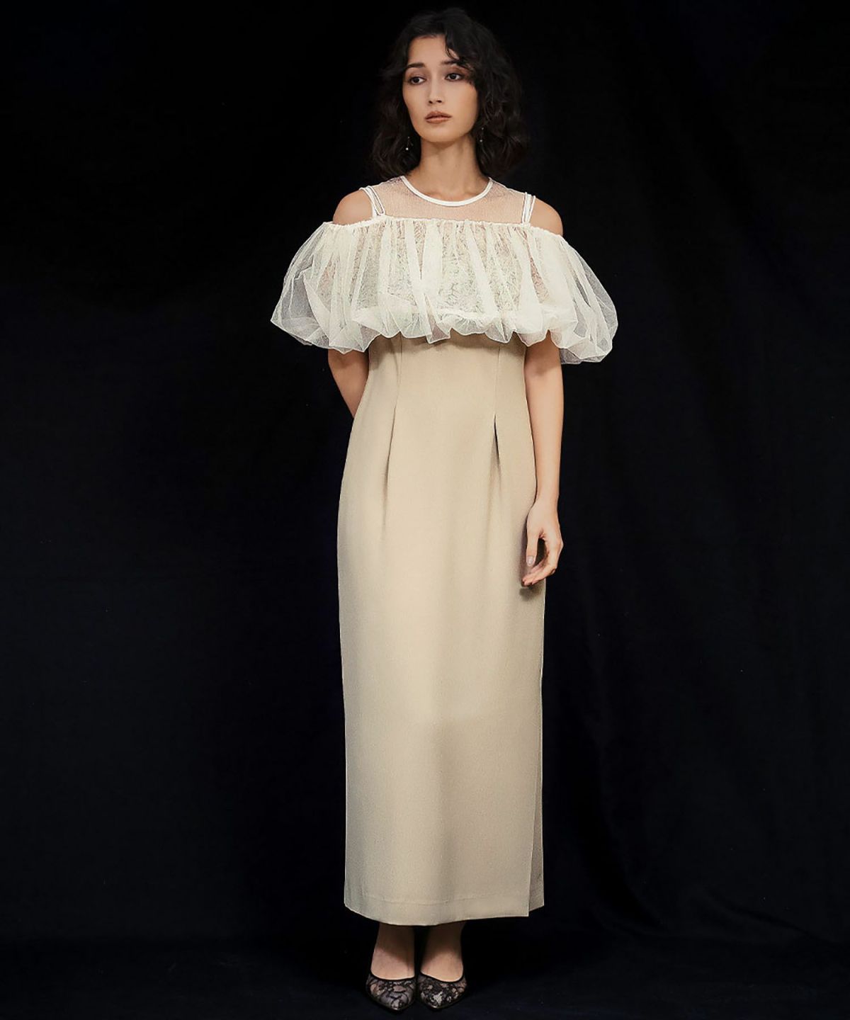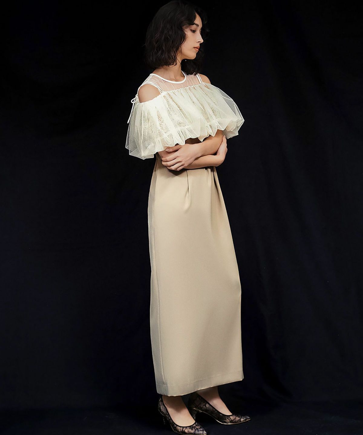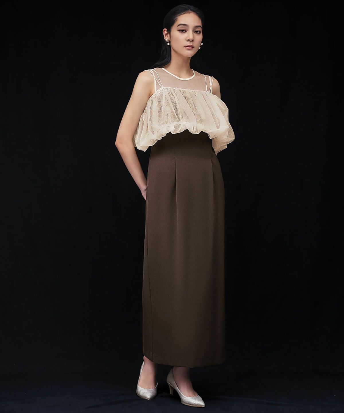 シアーでドライな質感のチュールと、ドレッシーな合繊生地を使用。
