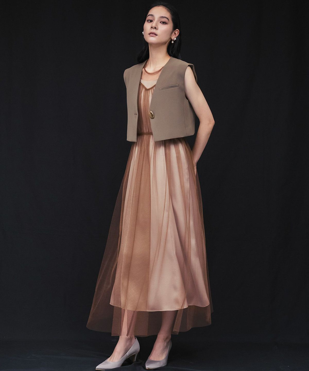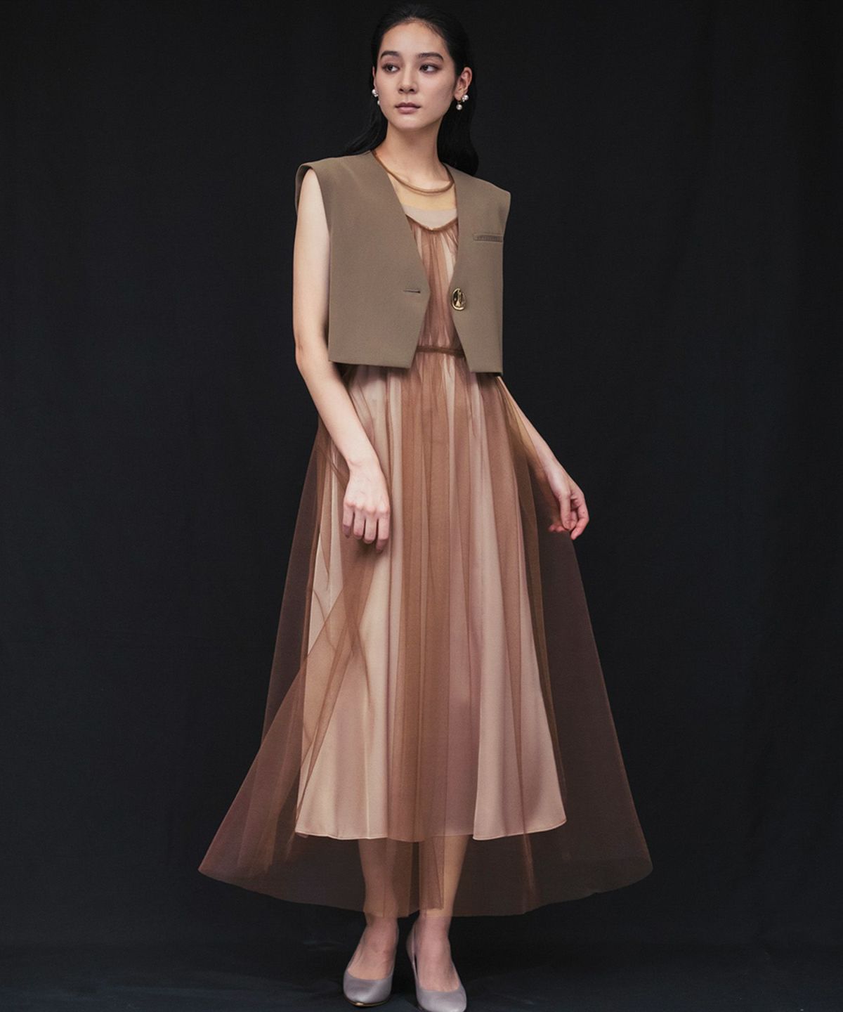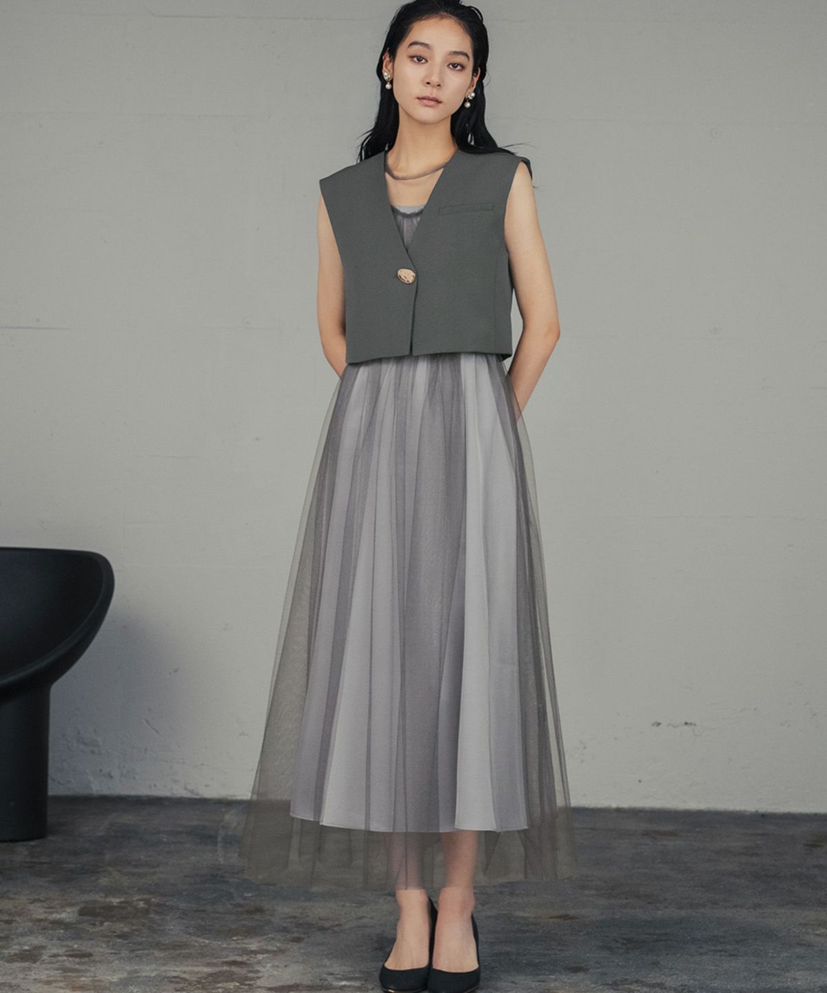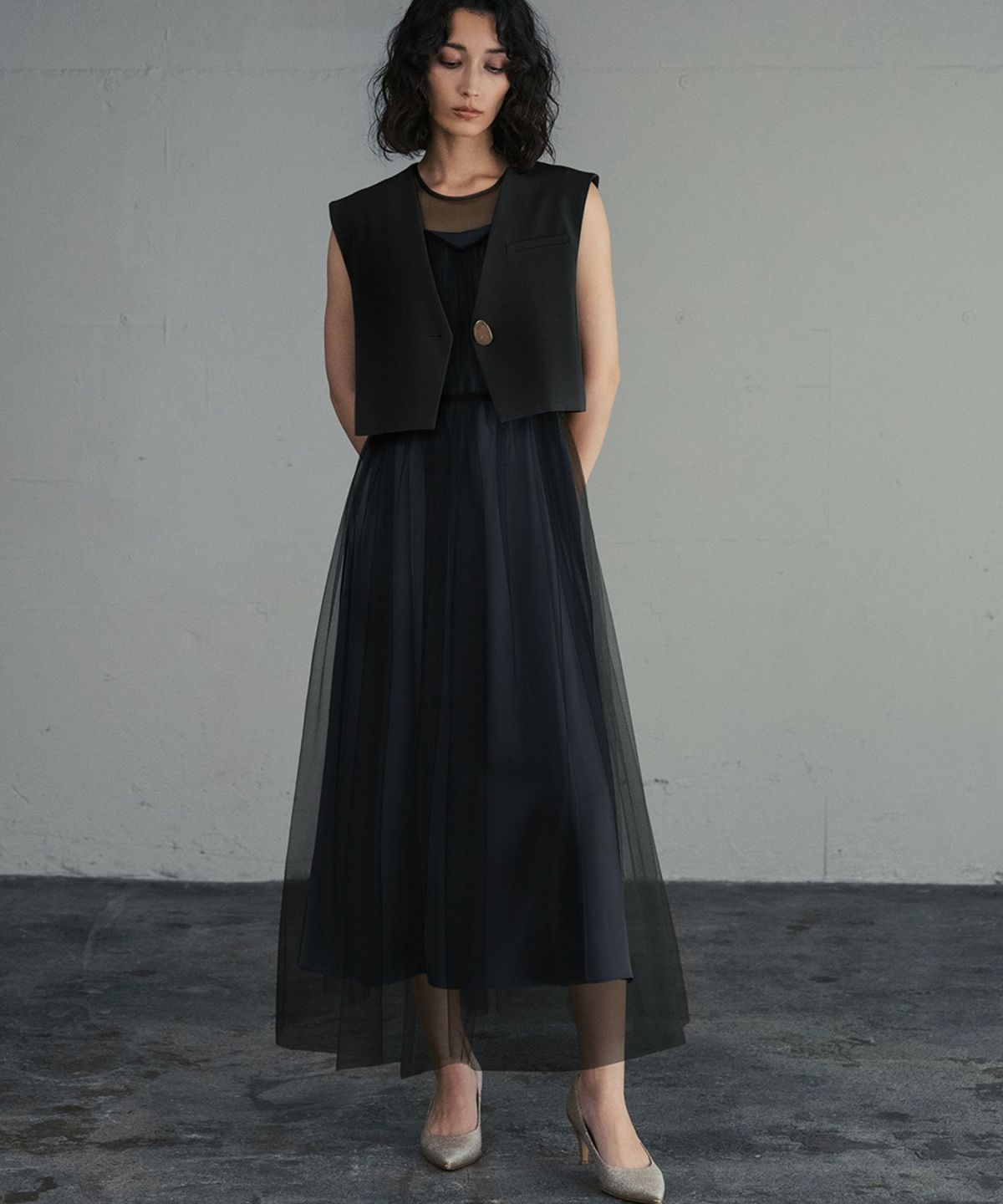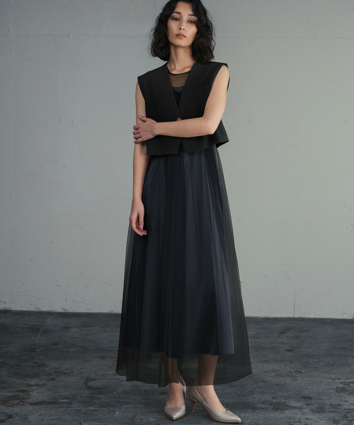 チュールワンピースとジレの素材感のコントラストが、体型カバーに一役。