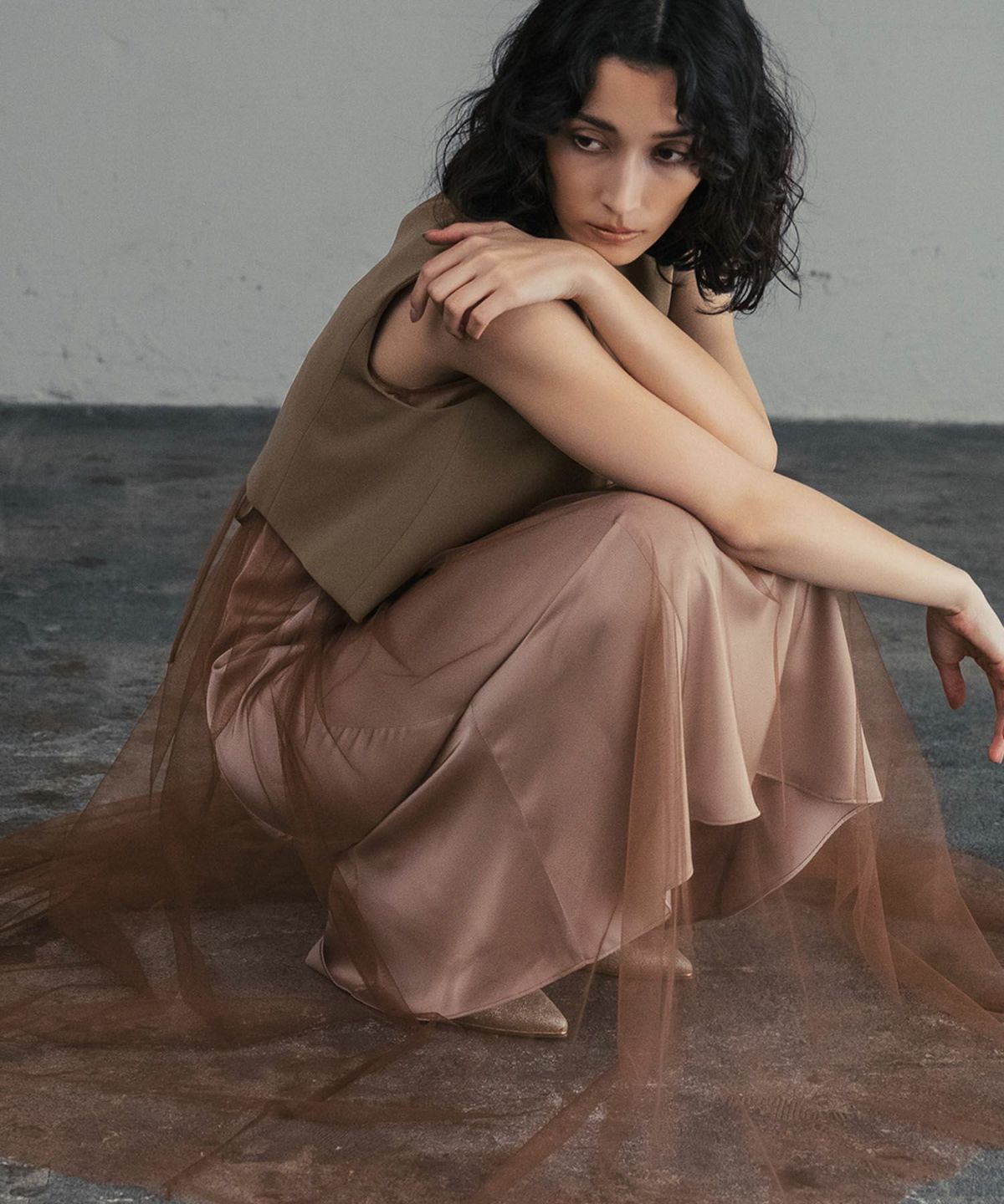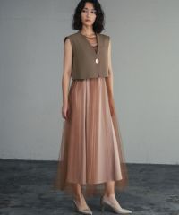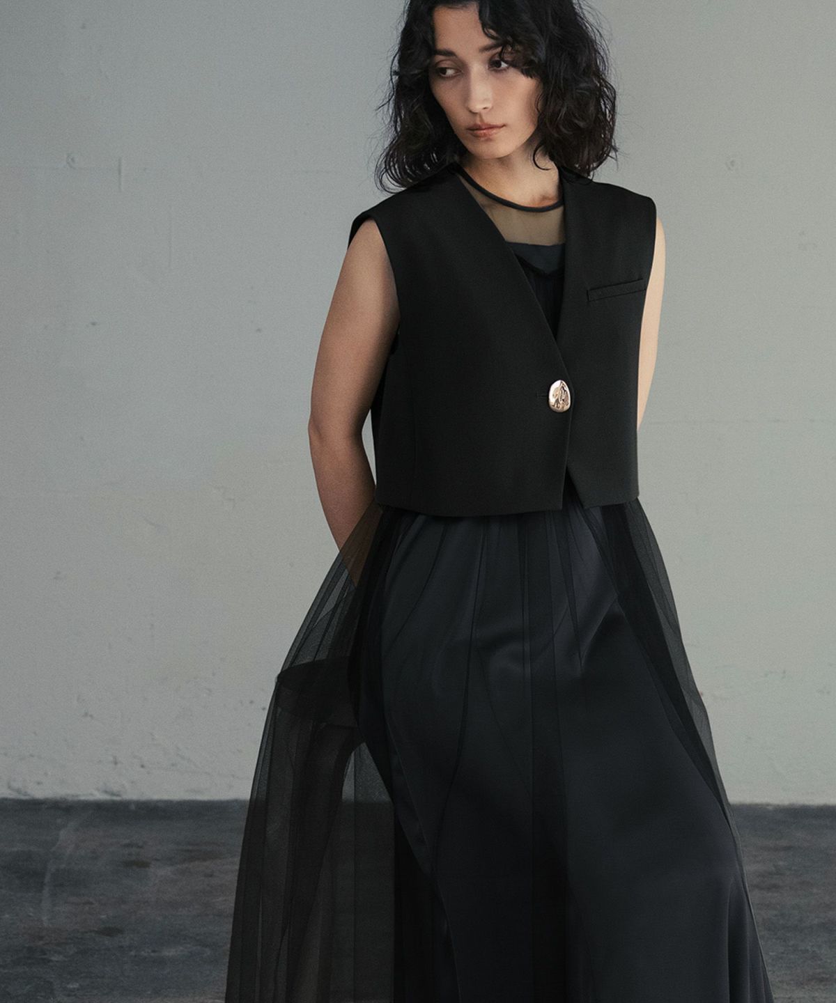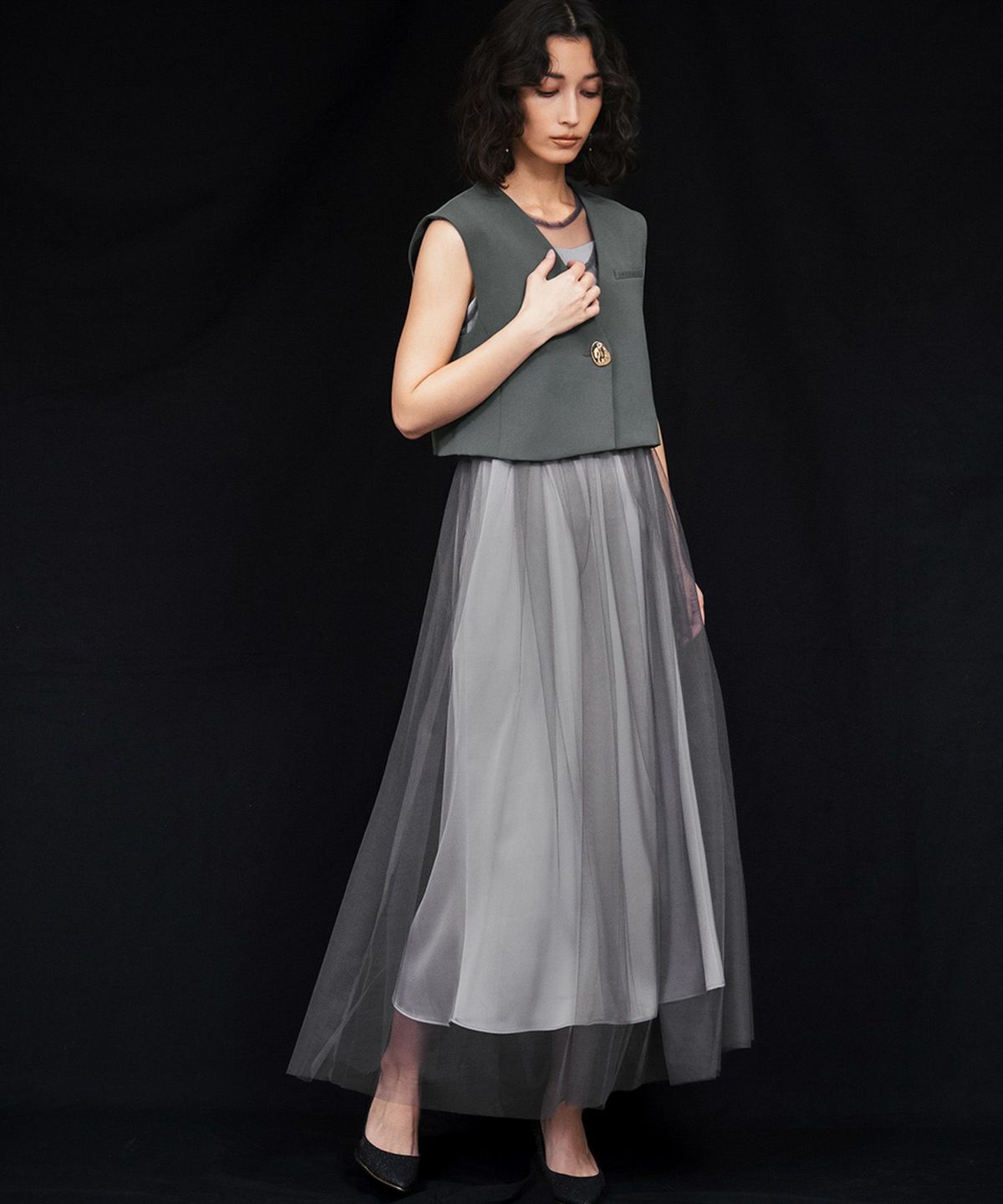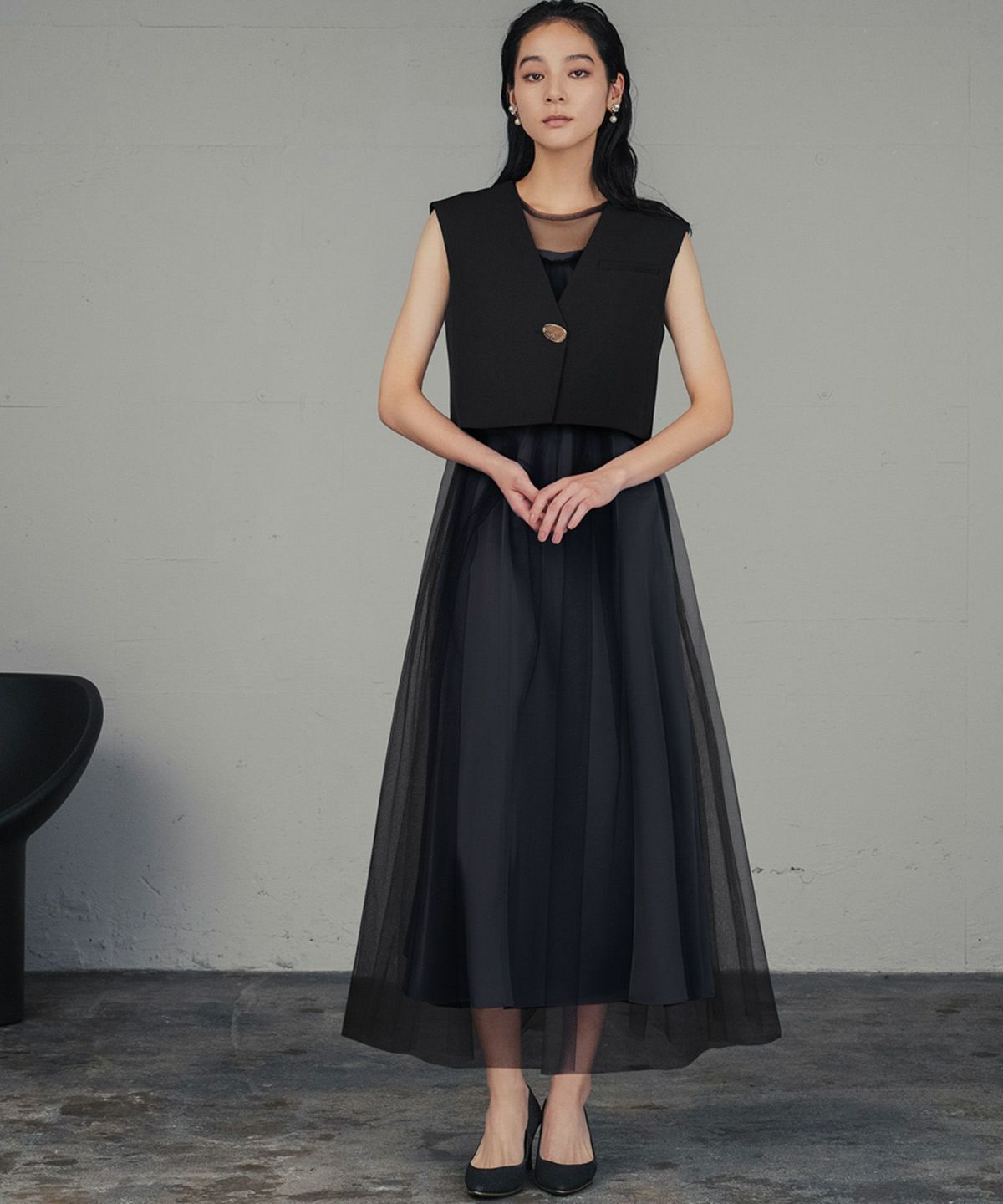 チュールワンピースとジレの素材感のコントラストが、体型カバーに一役。