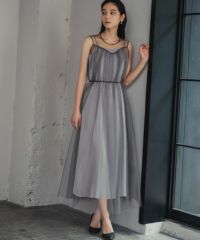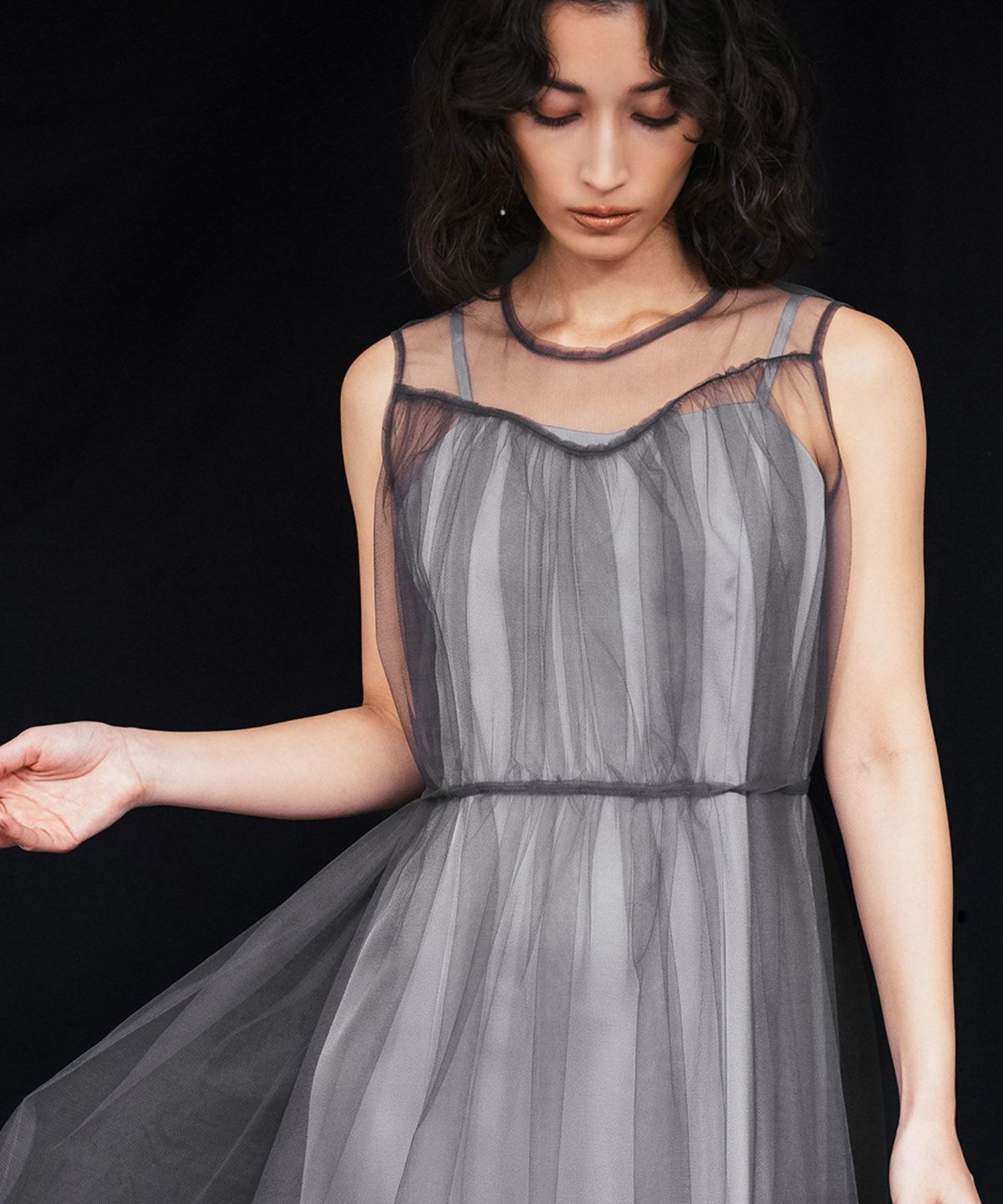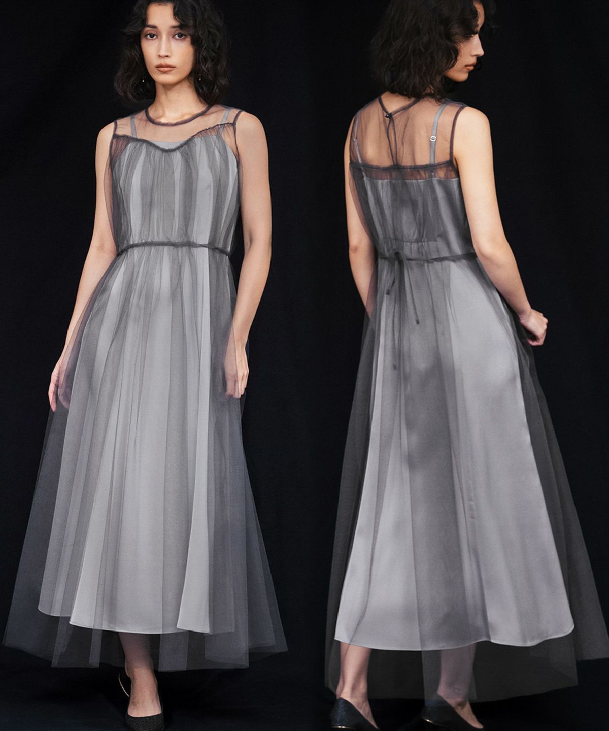 ショート丈のジレとチュールワンピース、キャミソールワンピースがセットになった、オケージョンシーンに映える上品な3点セット。