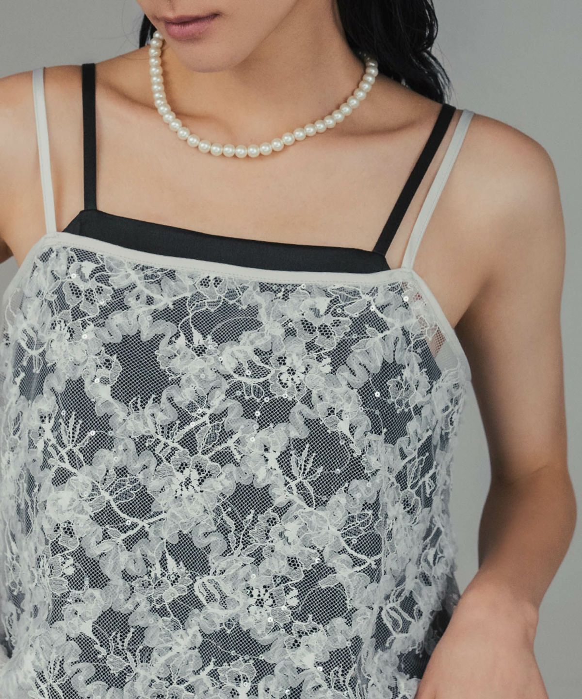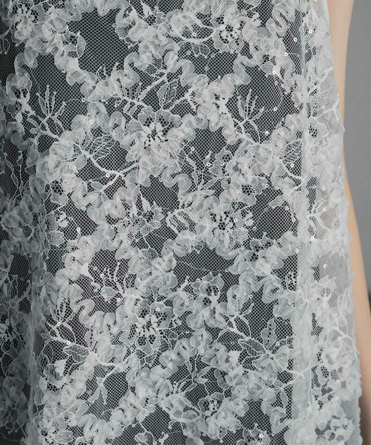 フリルを刺繍した立体感のあるレースに、ランダムにのせたスパンコールが、光の当たり方や動きによって水面の様に揺らめいて輝く。