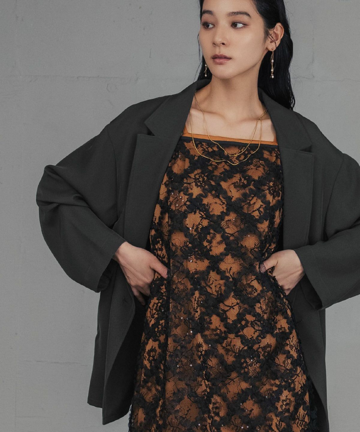 シンプルなワンピースやオールインワンに一点投入してレイヤードするだけで、一気に特別感のあるスタイリングに。