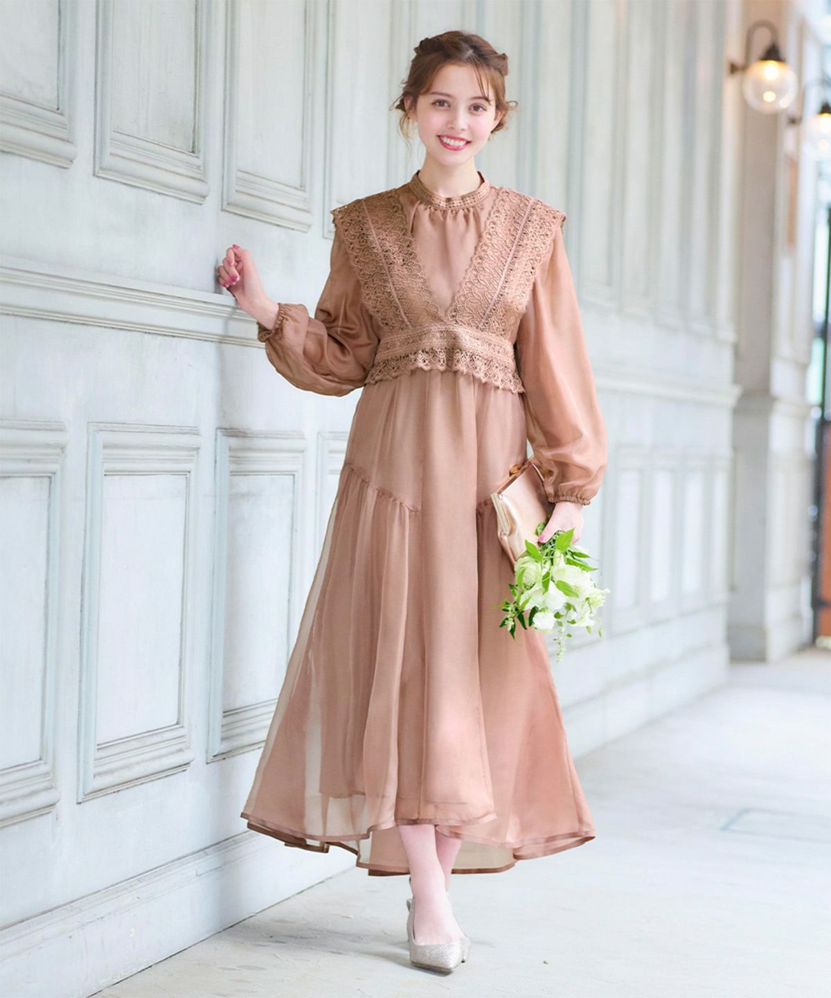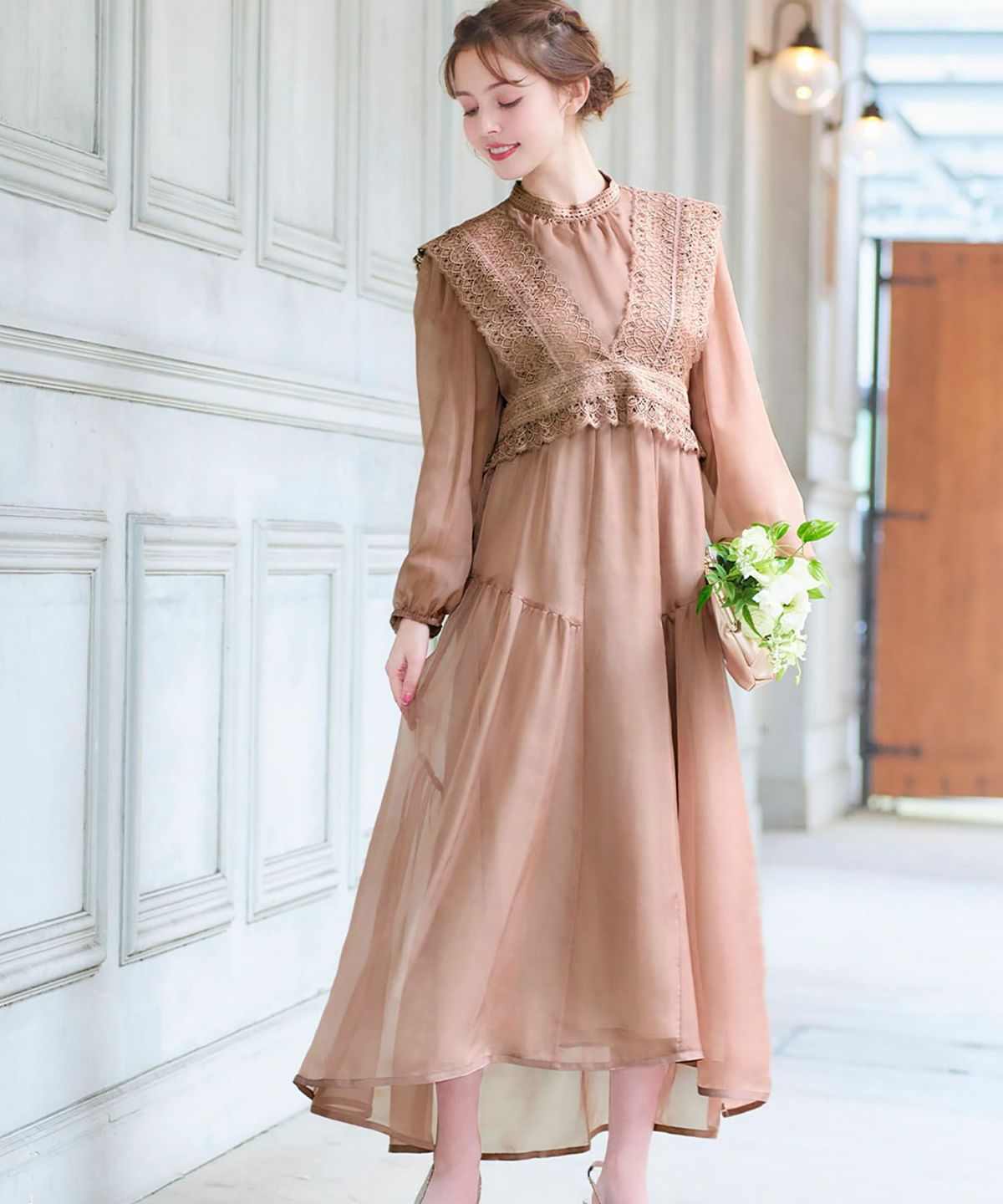 特徴的なレースのベストがメリハリを出し、華やかさを上乗せします。