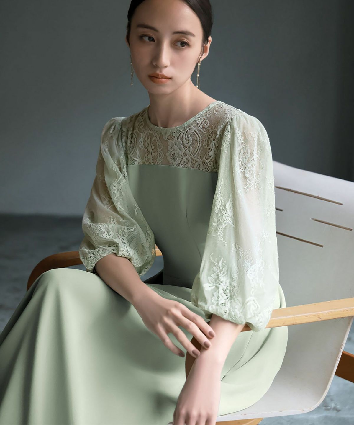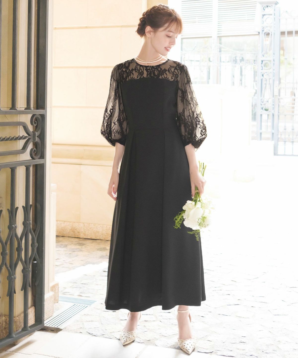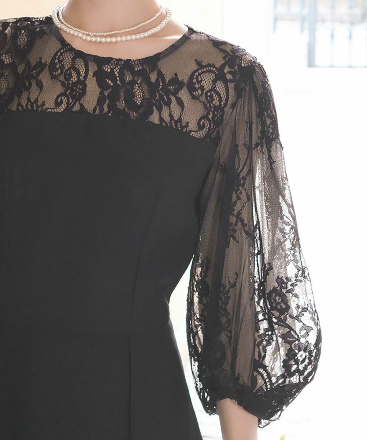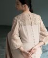見頃は透け感のないしっとりとした生地を、ヨークと袖はチュールの裏地が付いた柔らかなレース素材を使用しています。