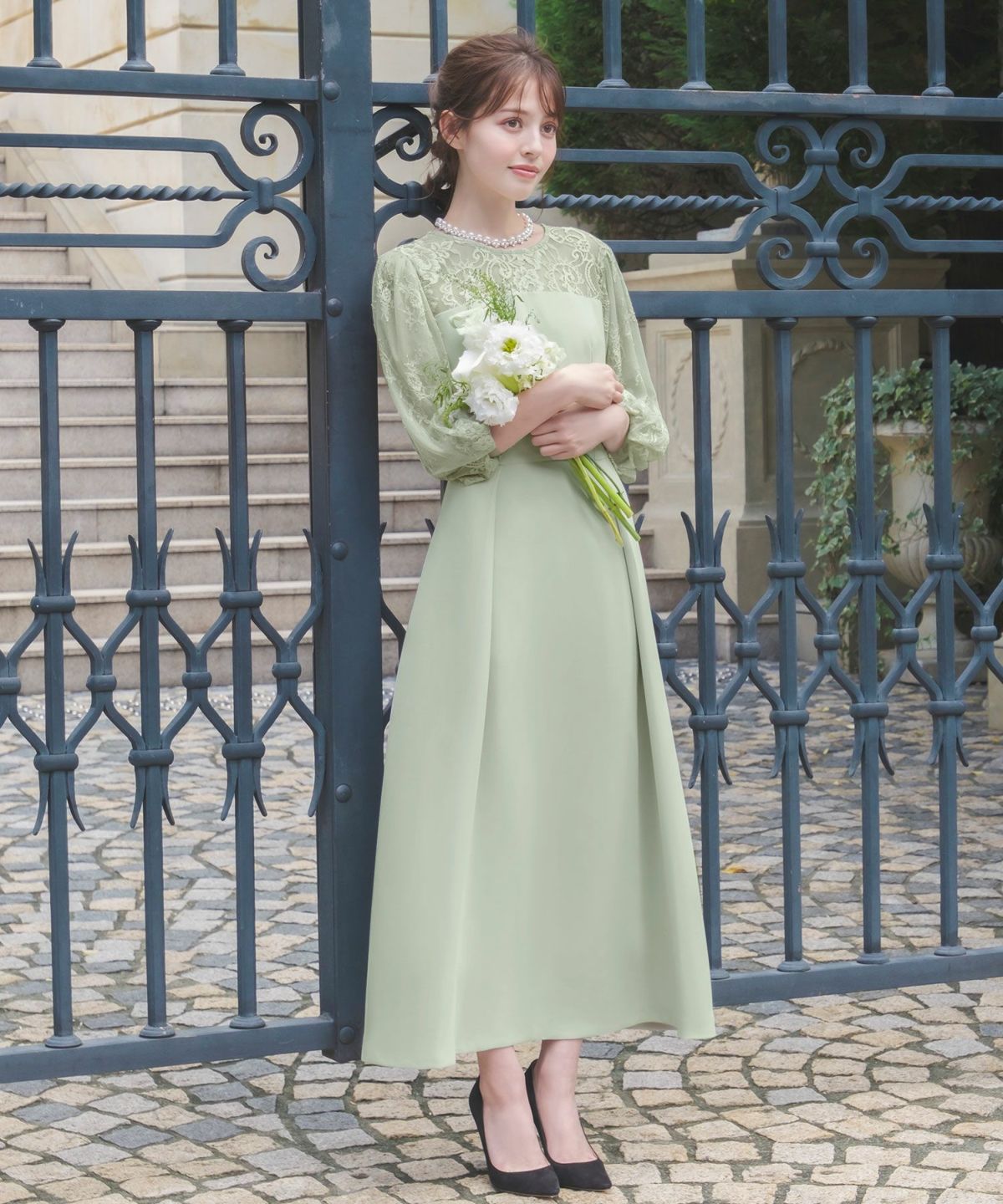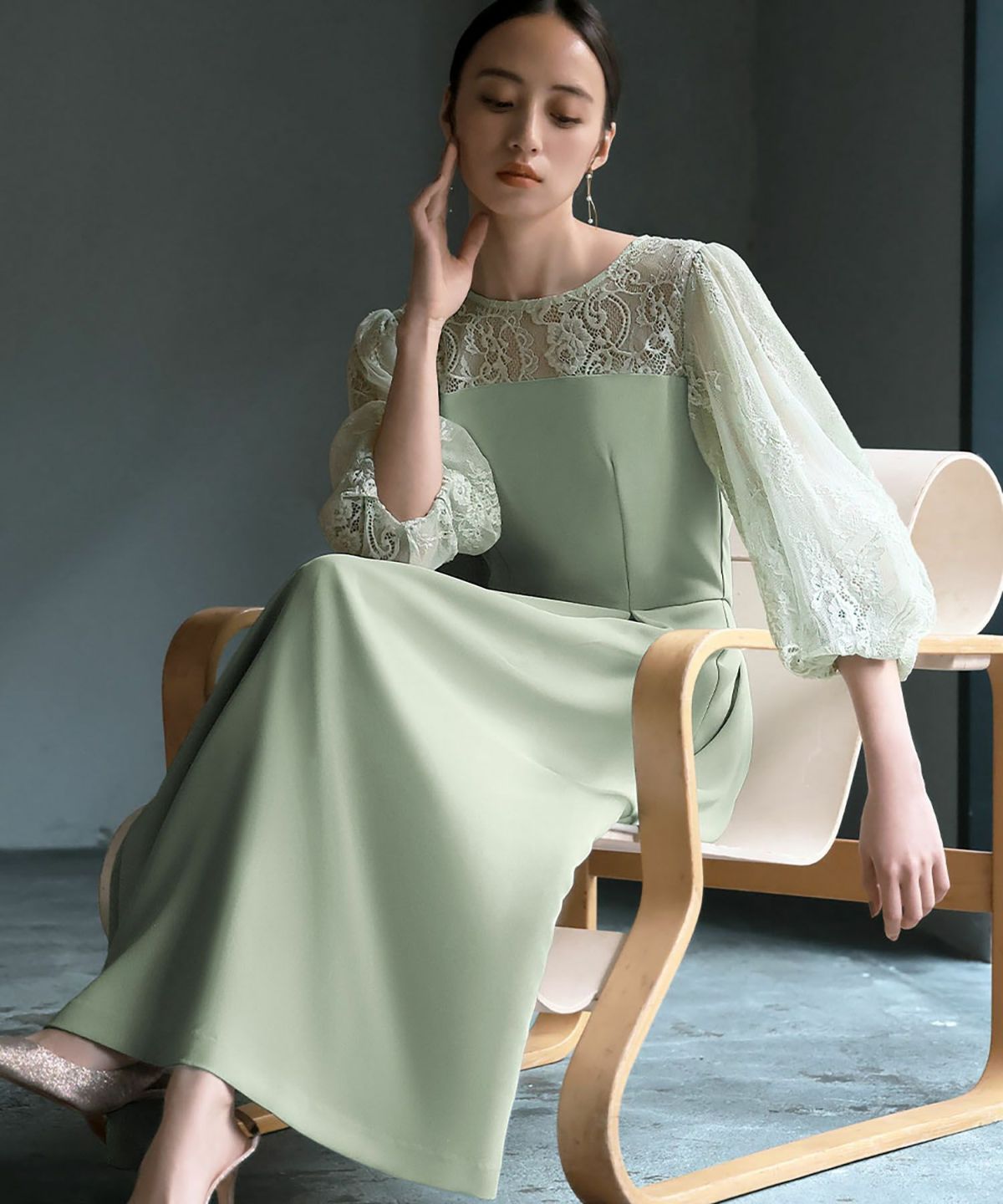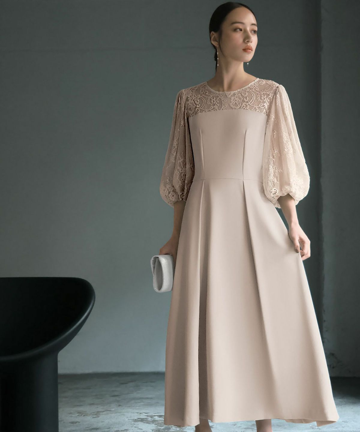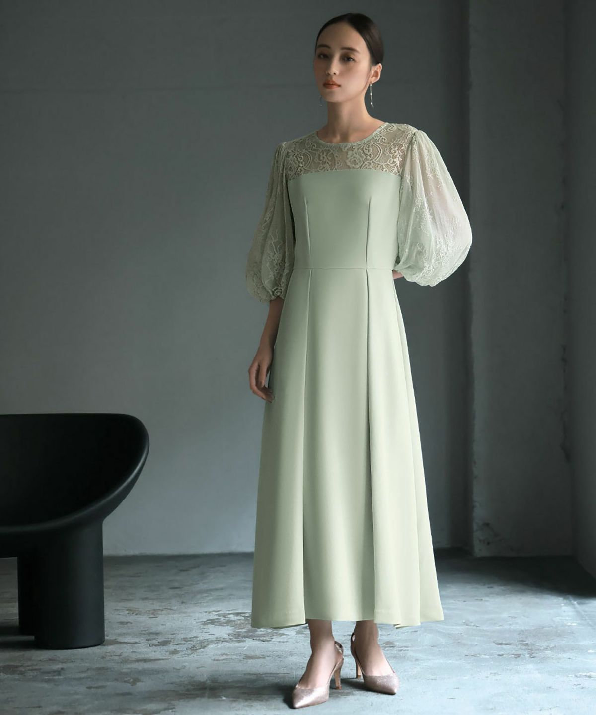 見頃は透け感のないしっとりとした生地を、ヨークと袖はチュールの裏地が付いた柔らかなレース素材を使用しています。
