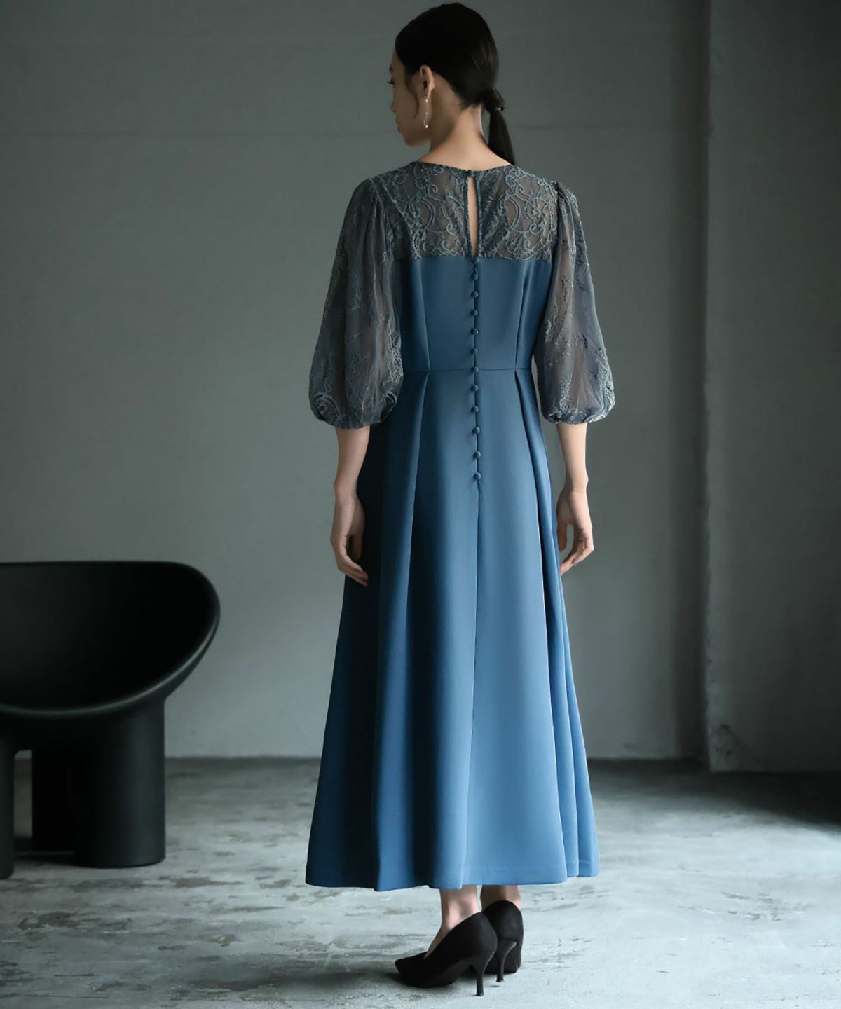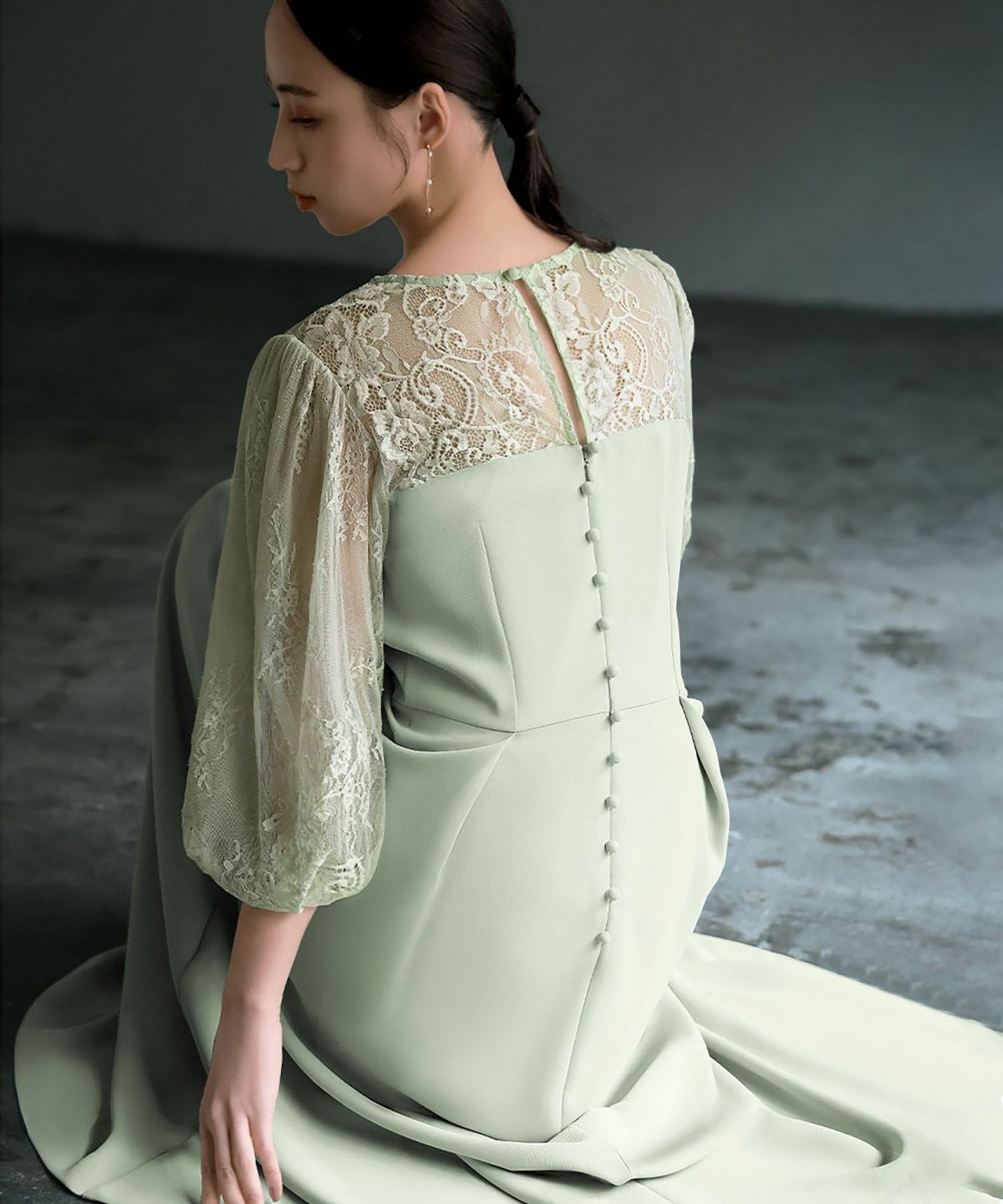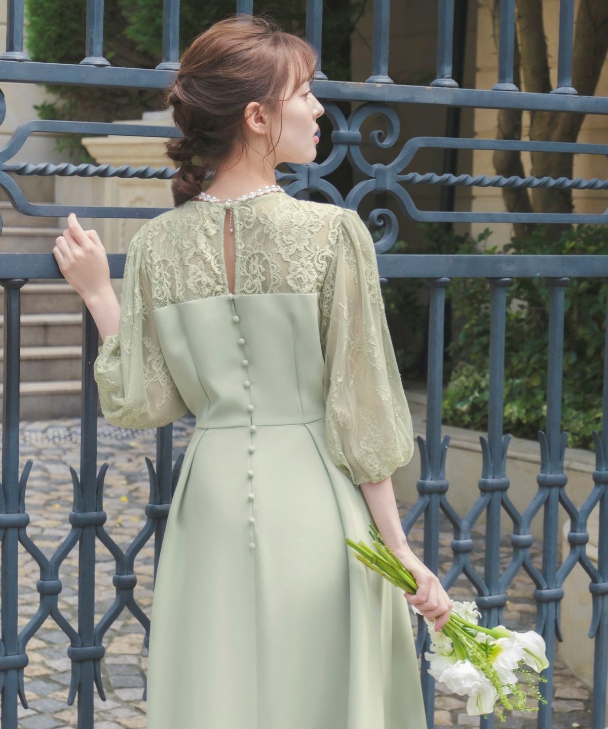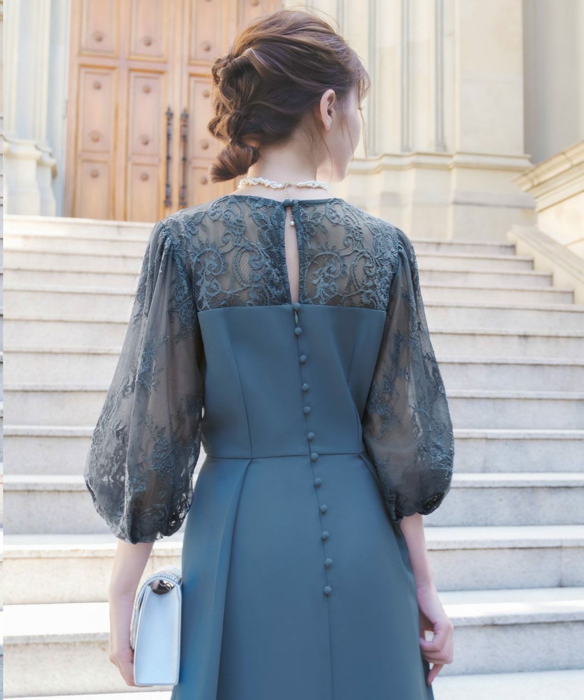 更に、表地と内側のレースとチュール素材、後ろ姿の涙開きとくるみボタンが可憐な印象をプラス。