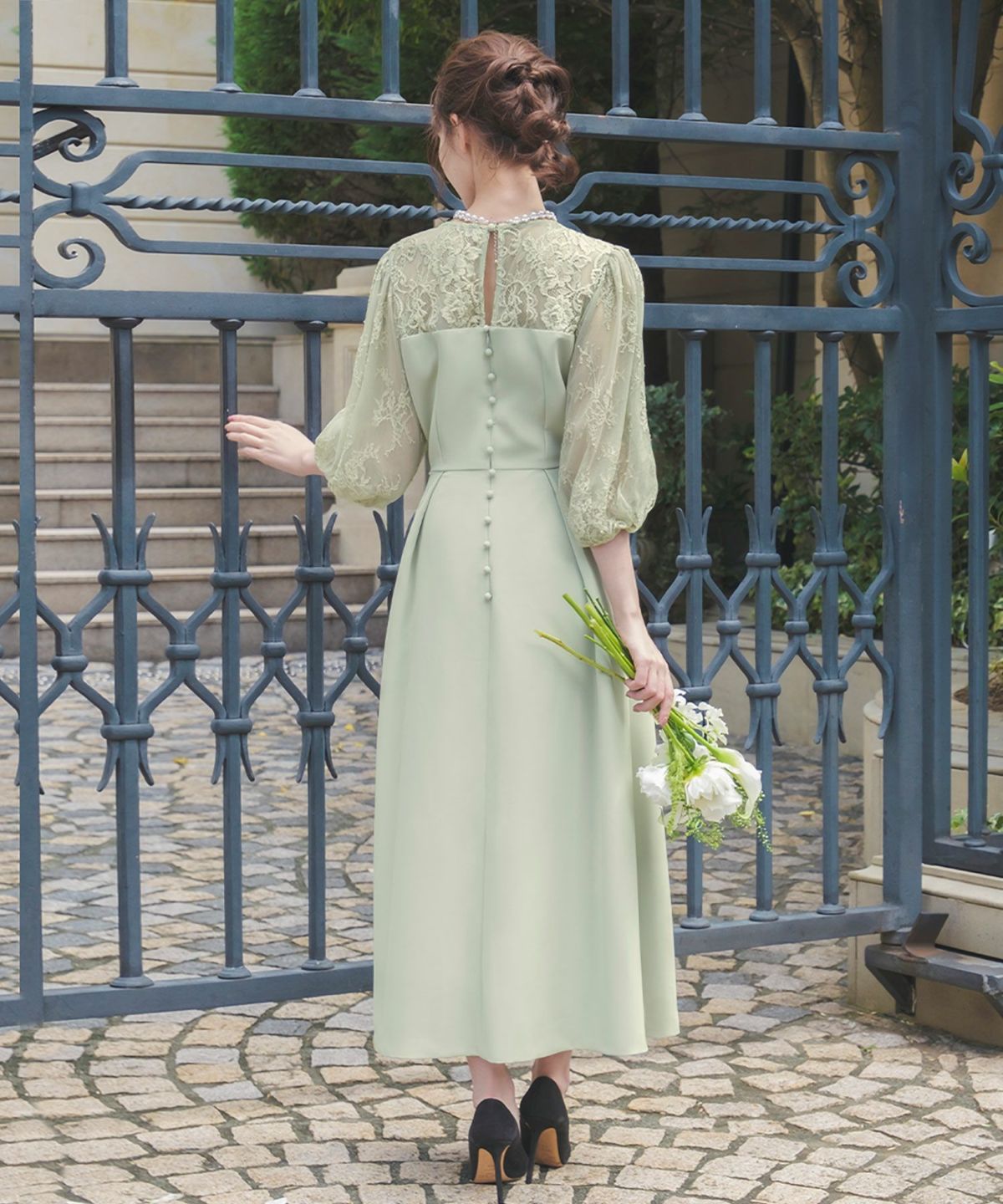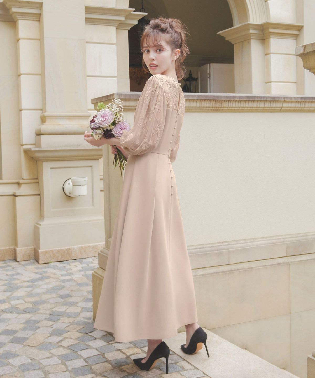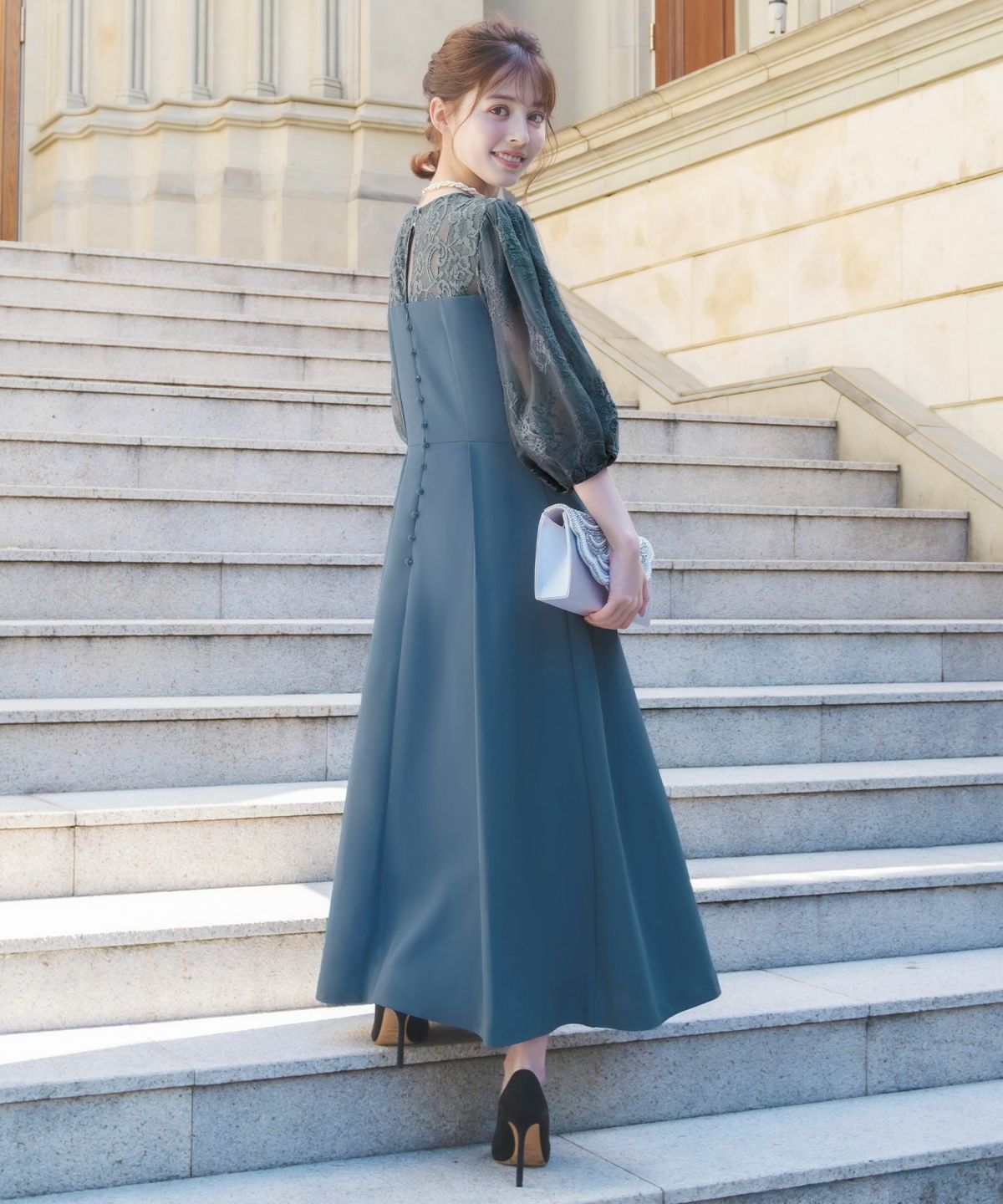 更に、表地と内側のレースとチュール素材、後ろ姿の涙開きとくるみボタンが可憐な印象をプラス。