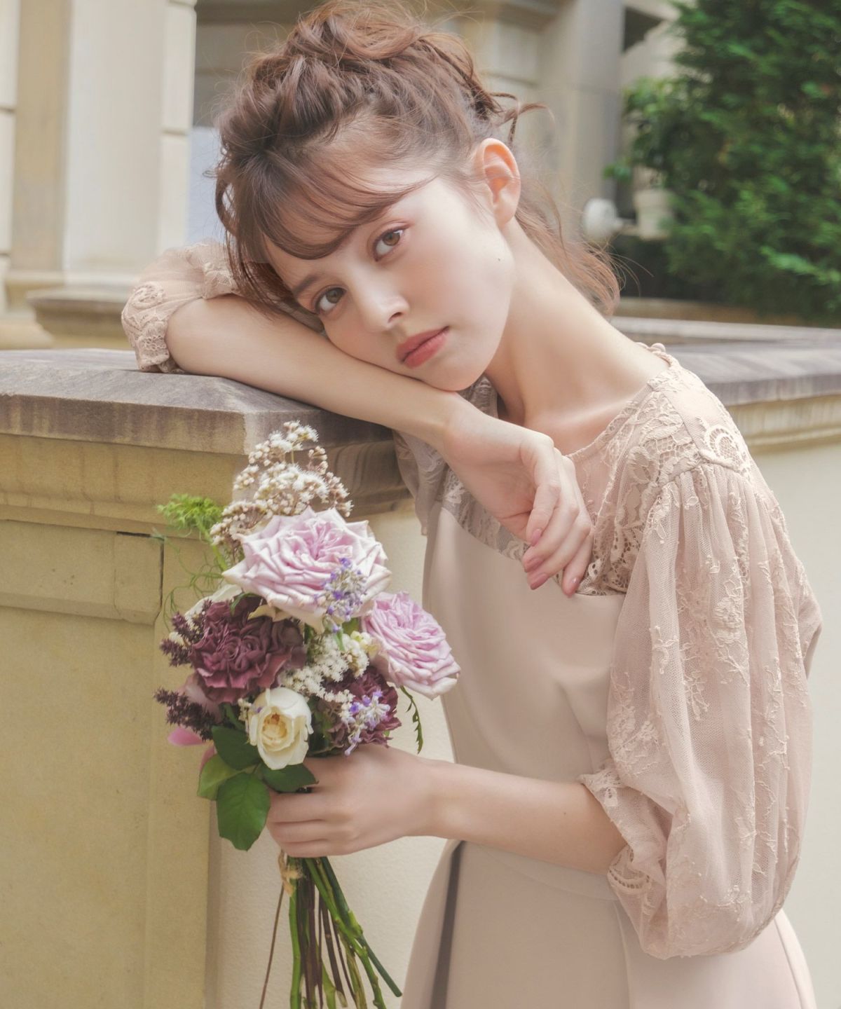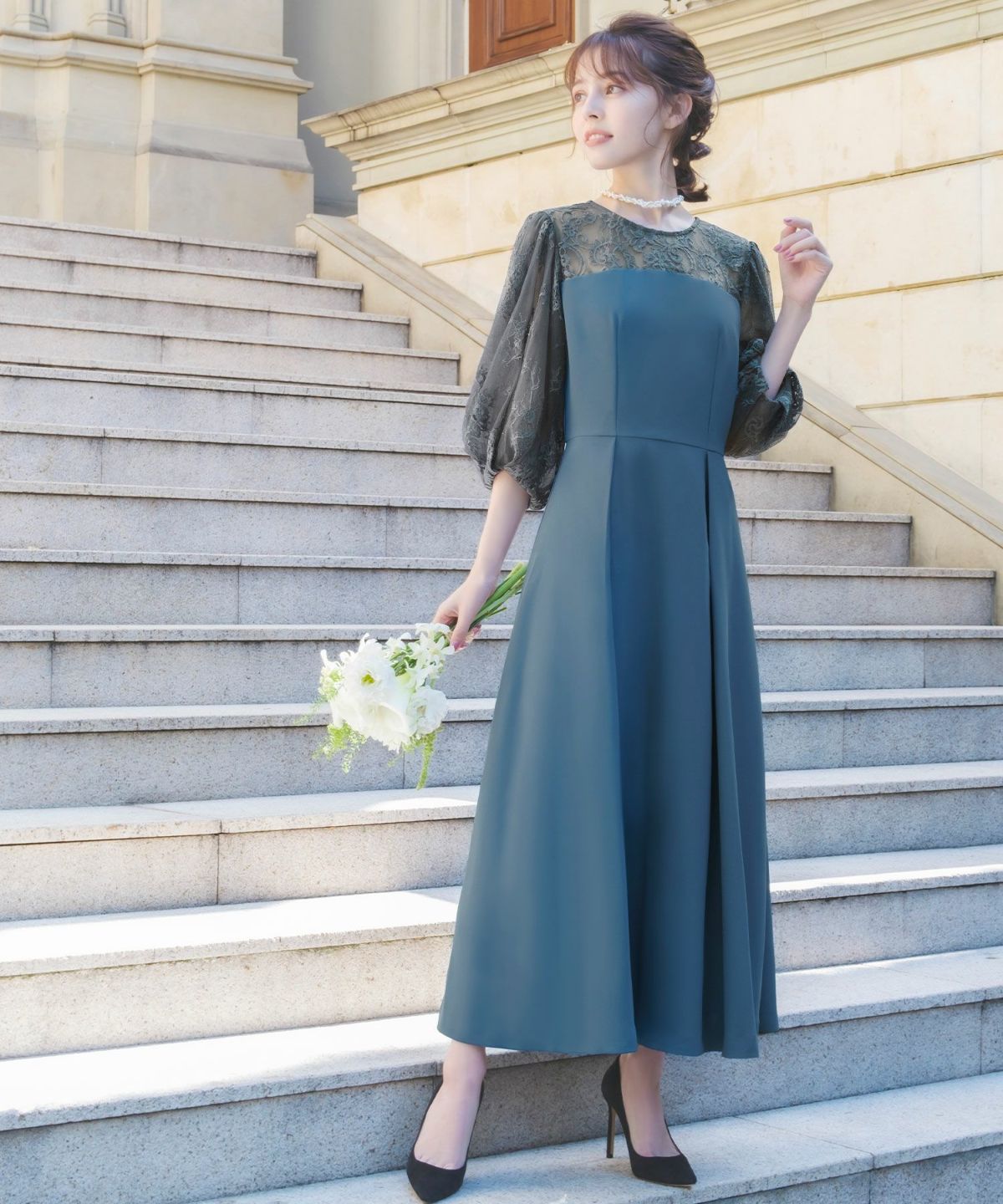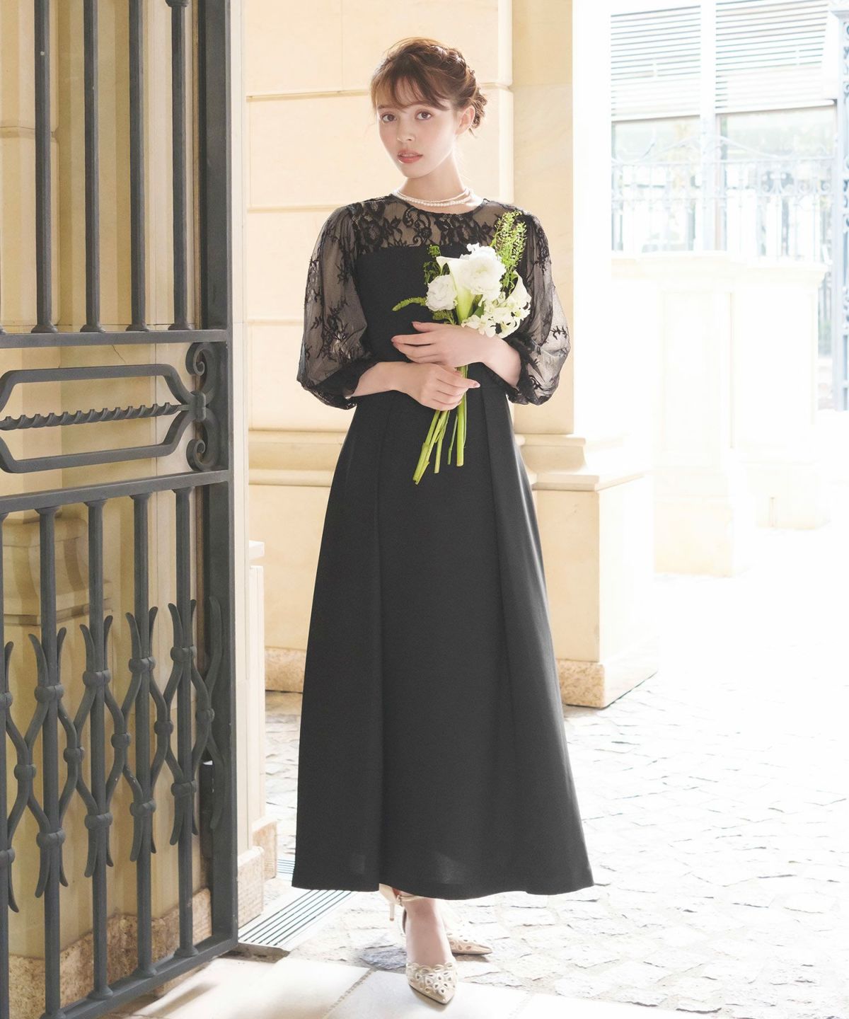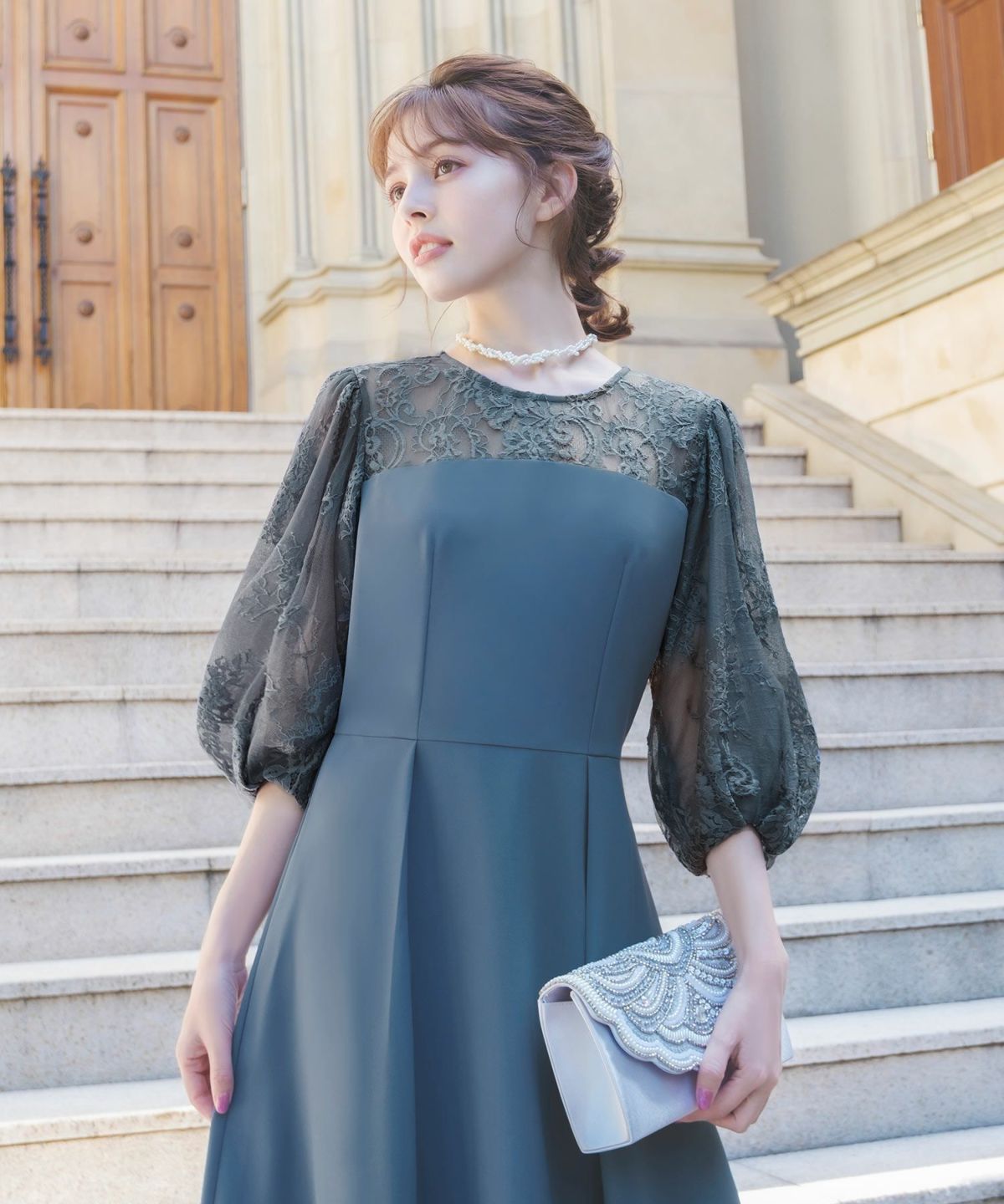 更に、表地と内側のレースとチュール素材、後ろ姿の涙開きとくるみボタンが可憐な印象をプラス。