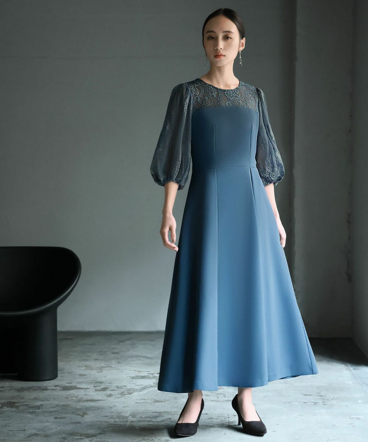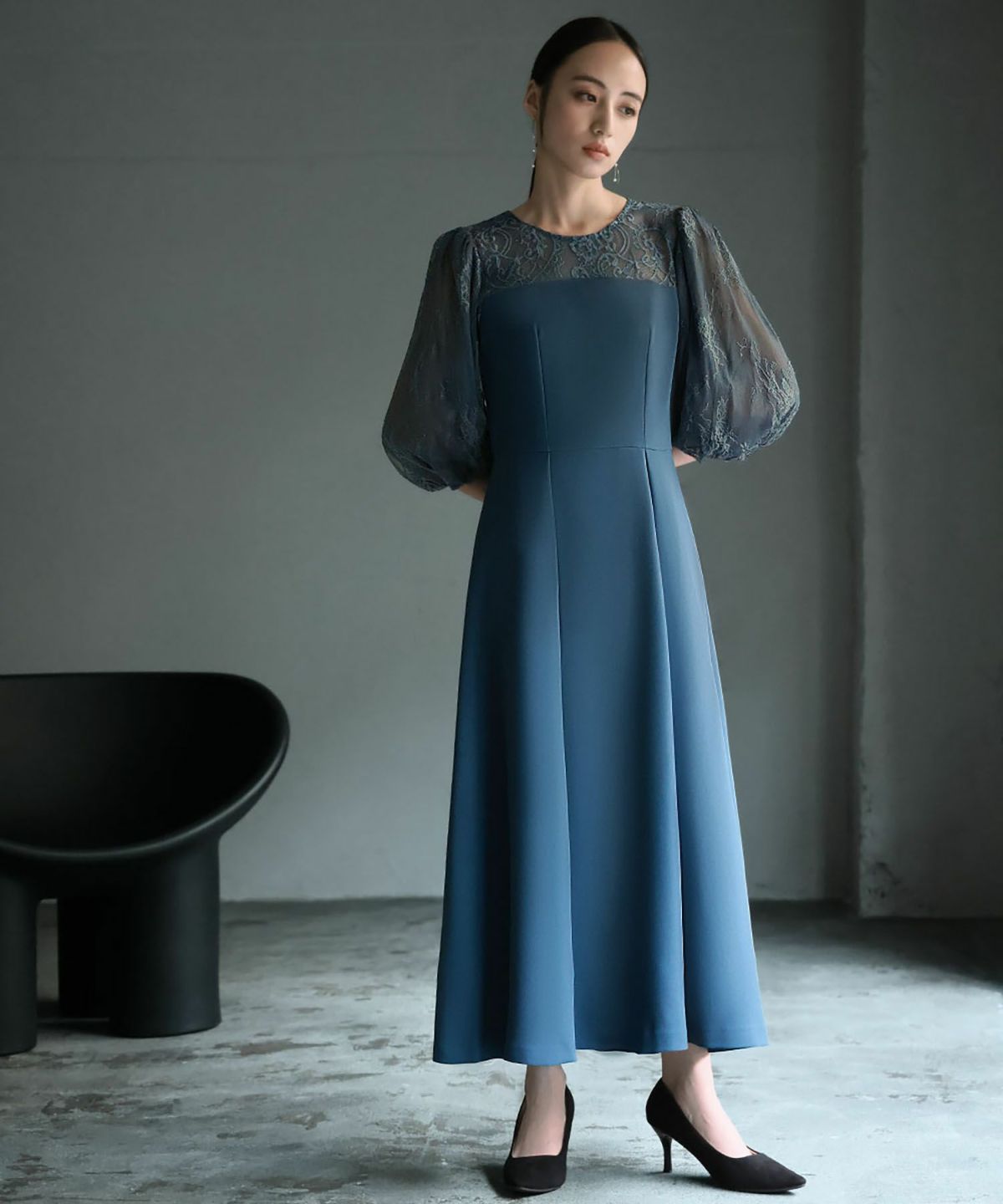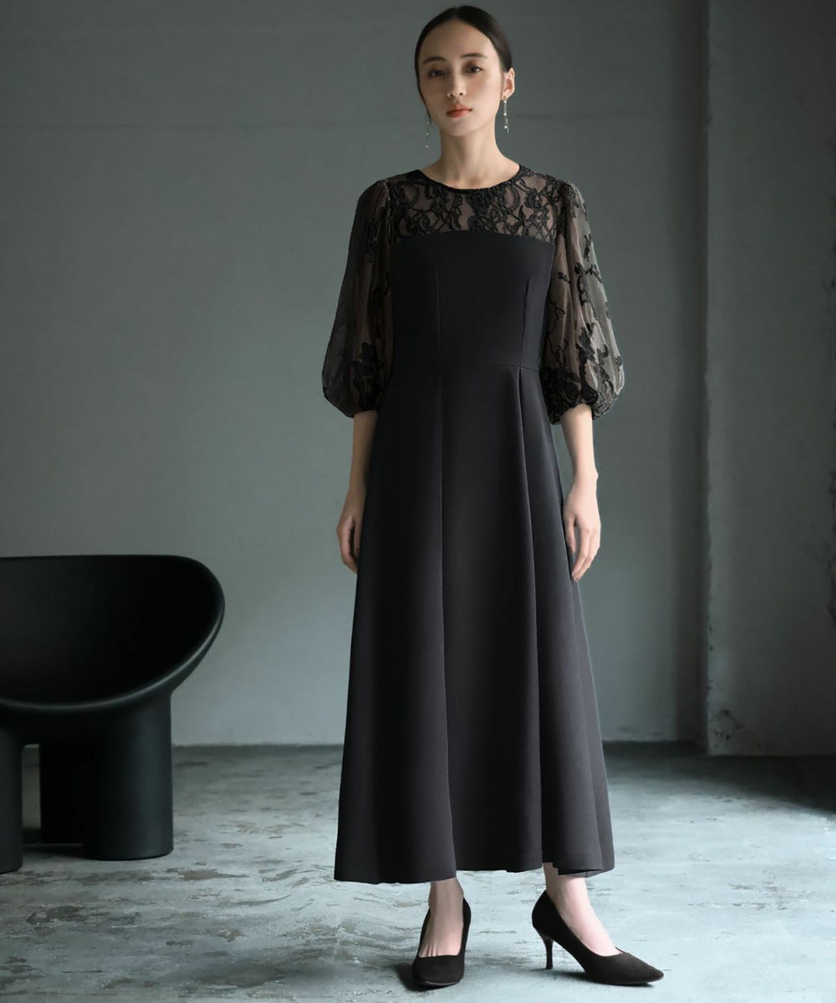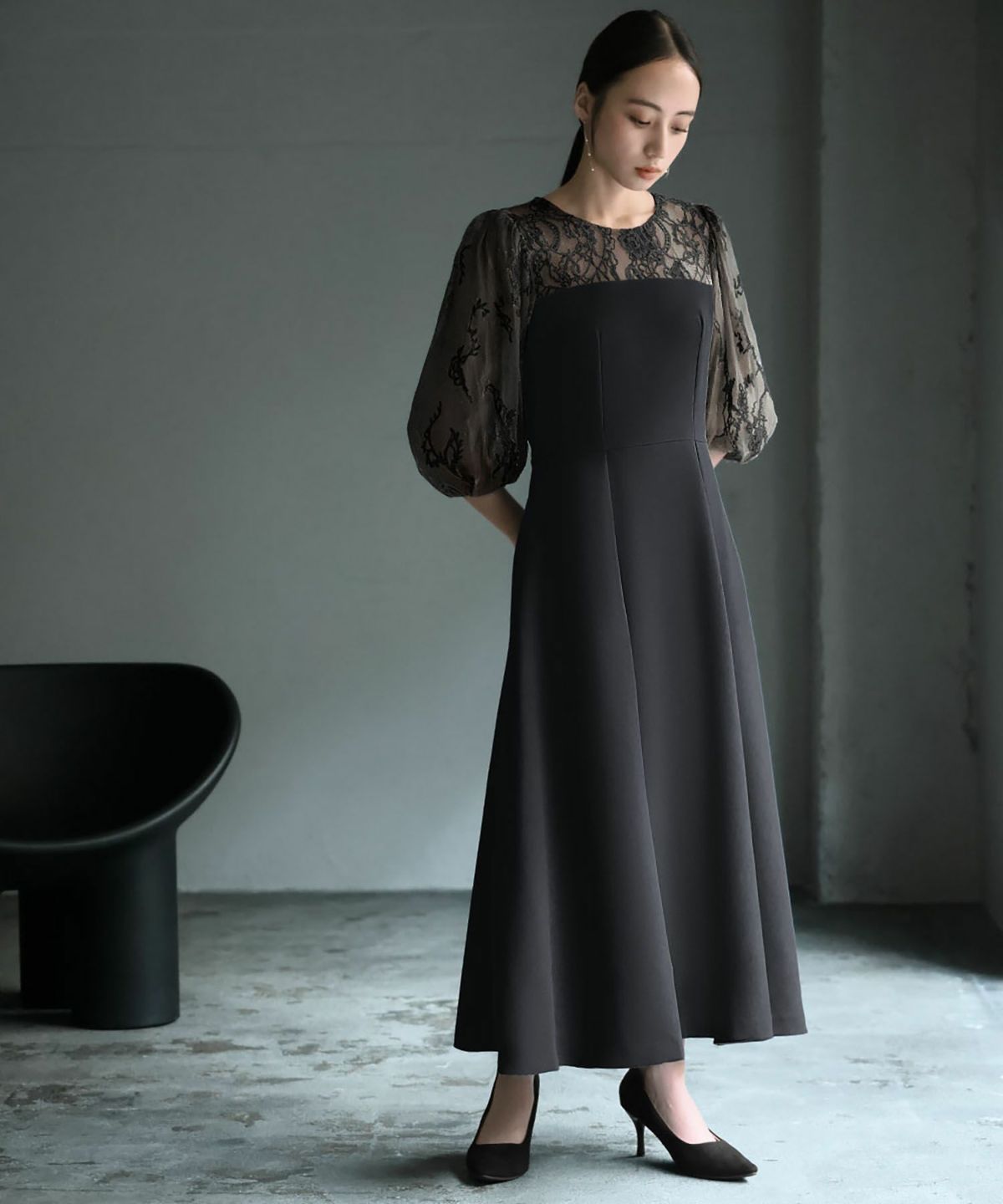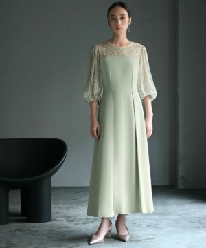 袖と肩ヨークの程よいレースの透け感と立体的なフォルムが大人レディなワンピース。