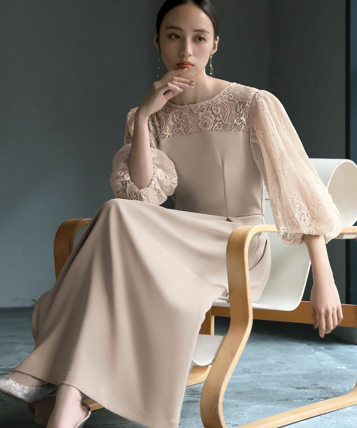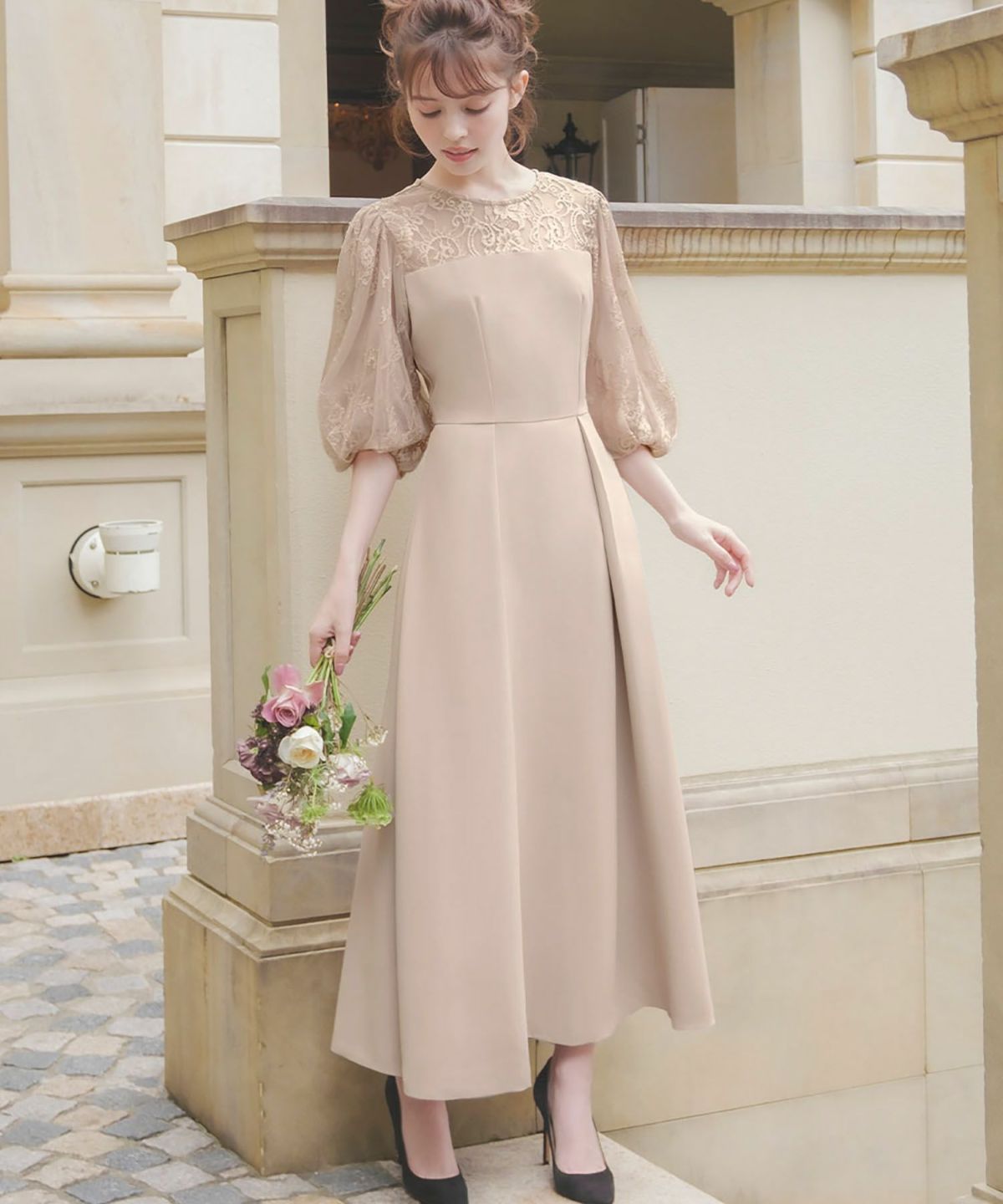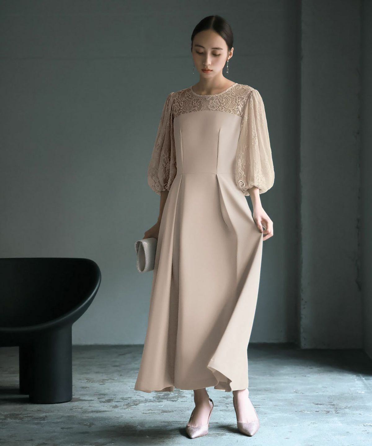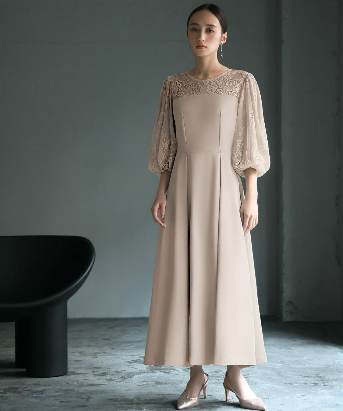 袖と肩ヨークの程よいレースの透け感と立体的なフォルムが大人レディなワンピース。