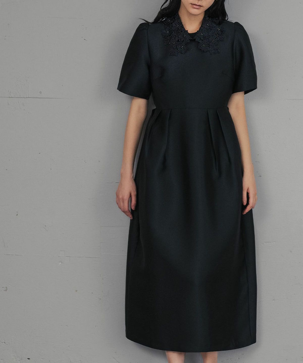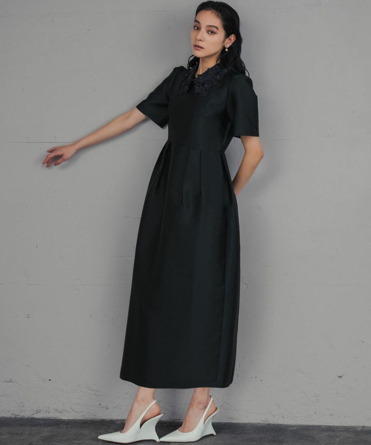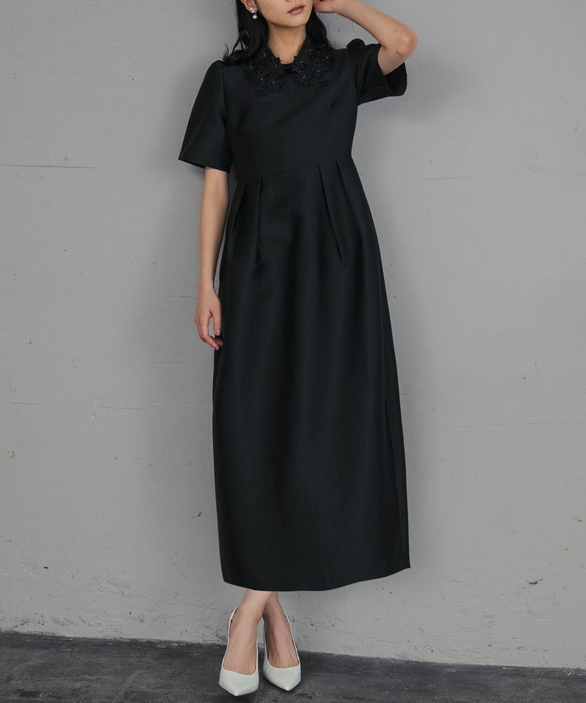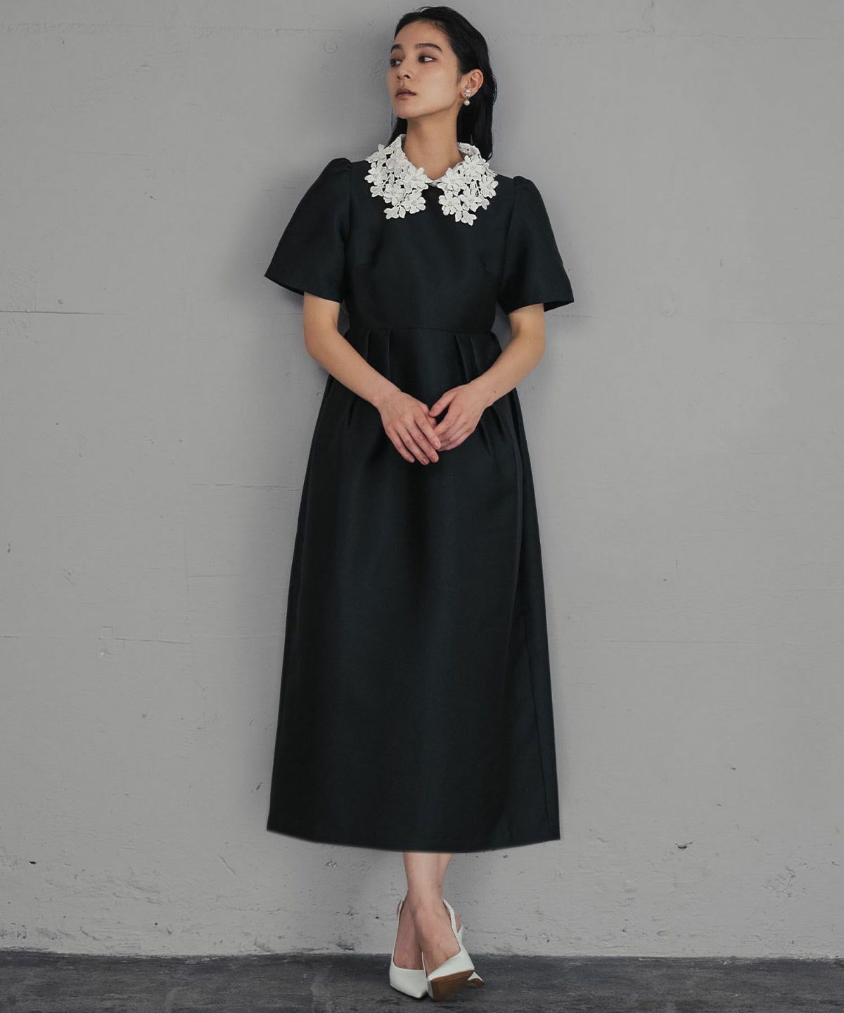上品な雰囲気を演出する、レースカラーコクーンドレスになります。
