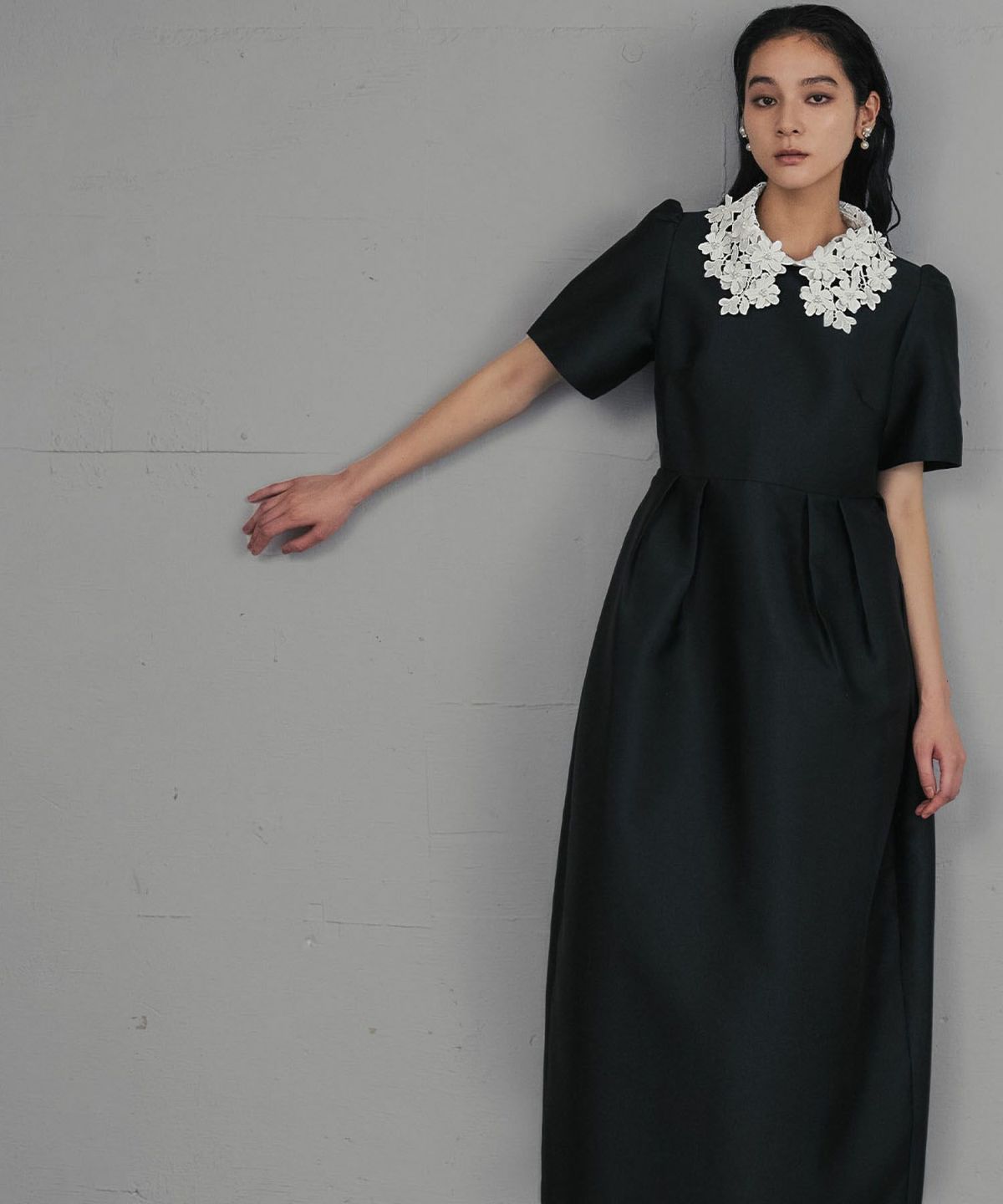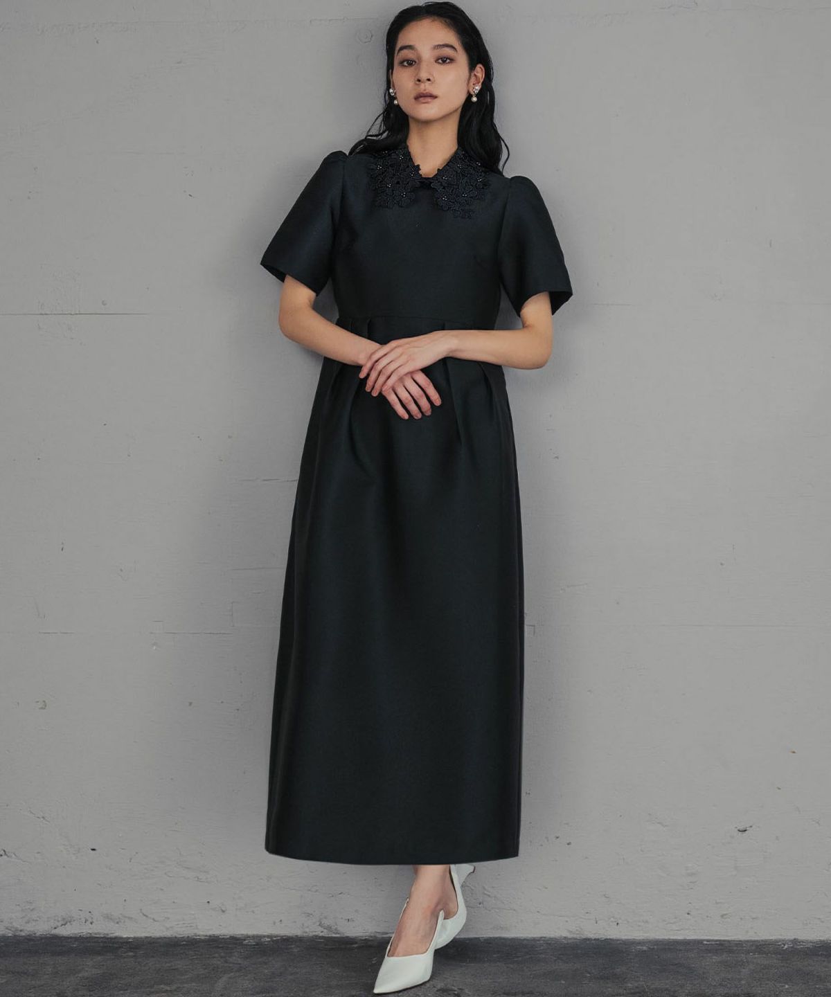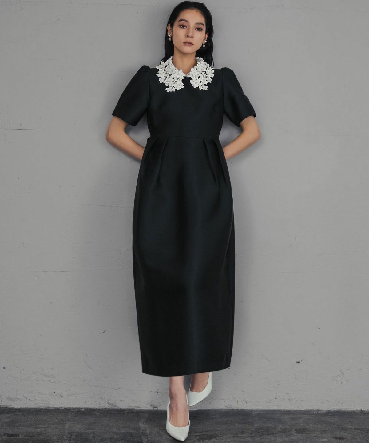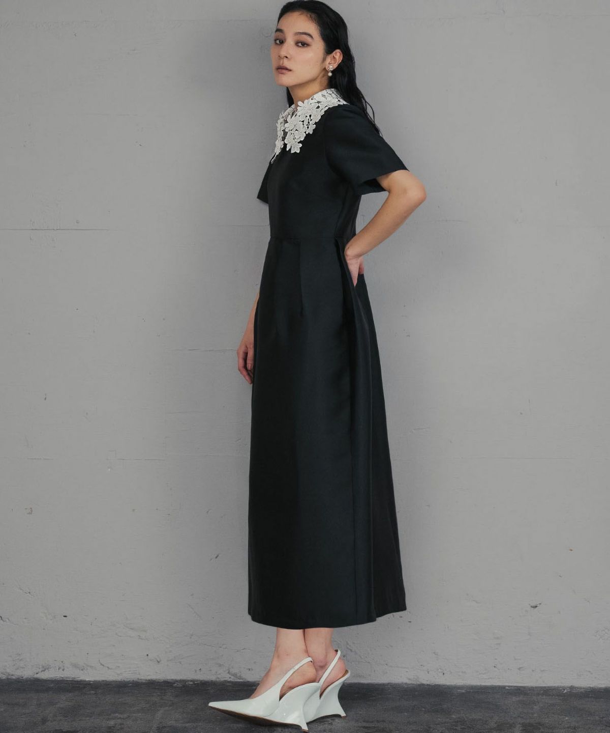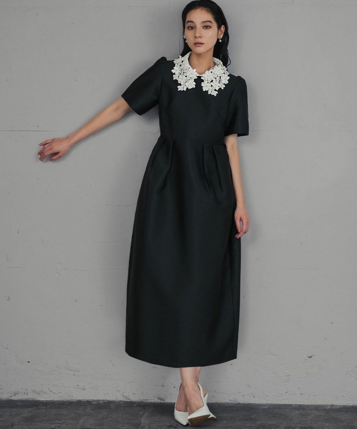 上品な雰囲気を演出する、レースカラーコクーンドレスになります。
