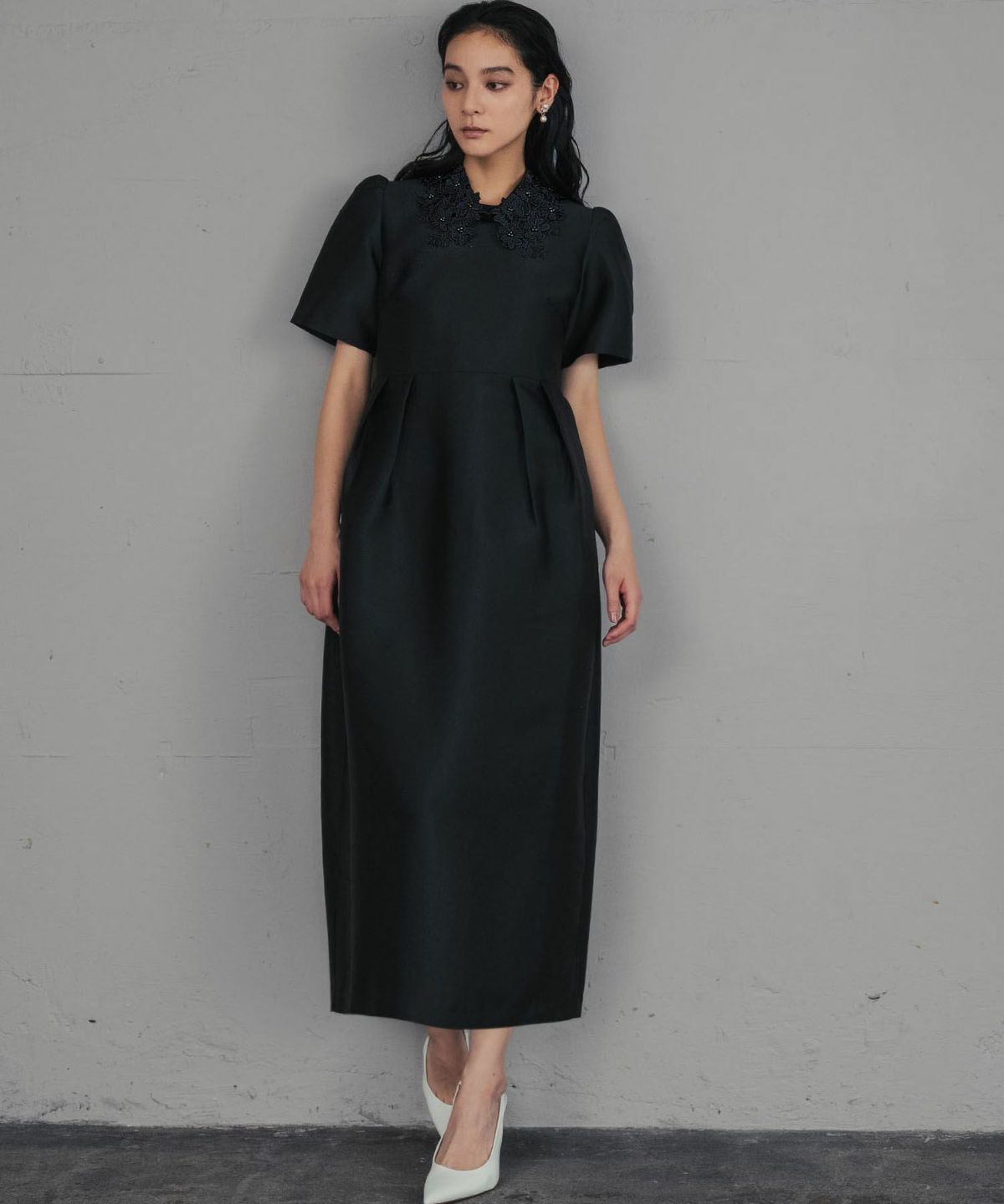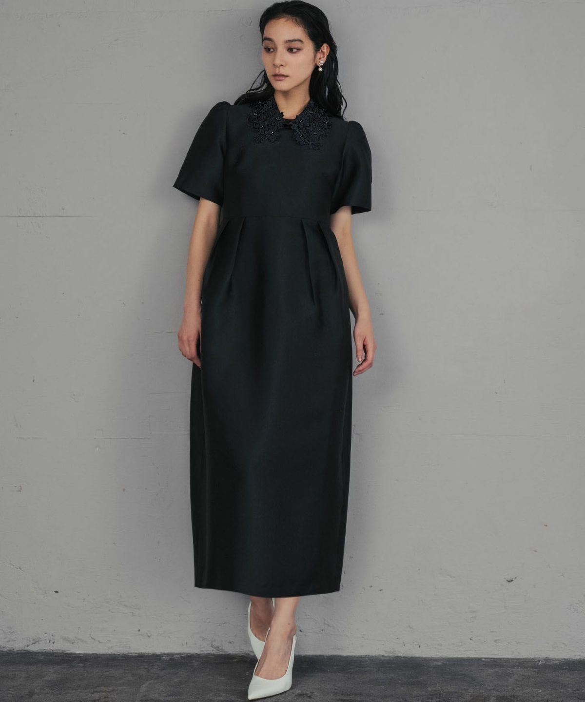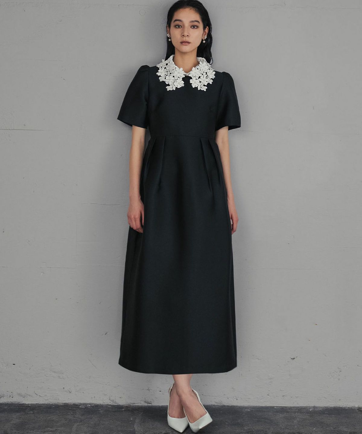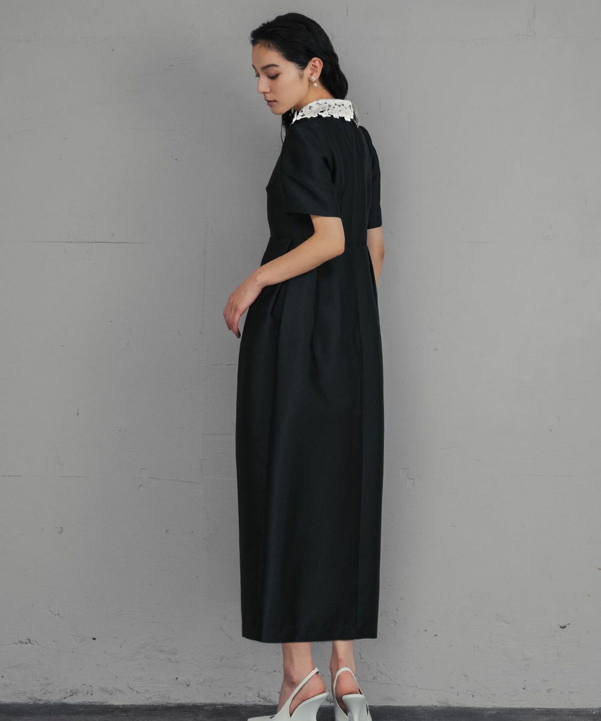 上品な雰囲気を演出する、レースカラーコクーンドレスになります。