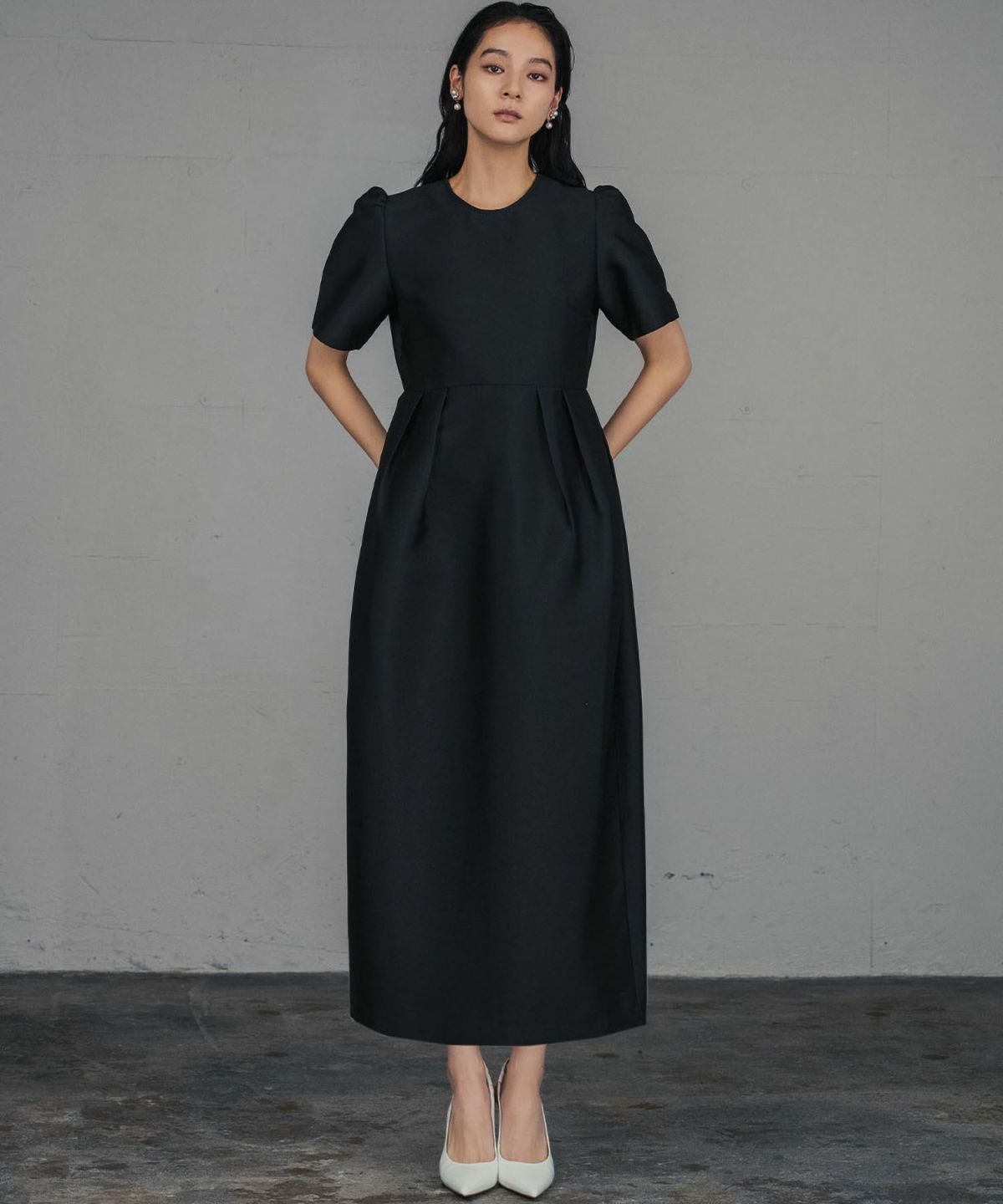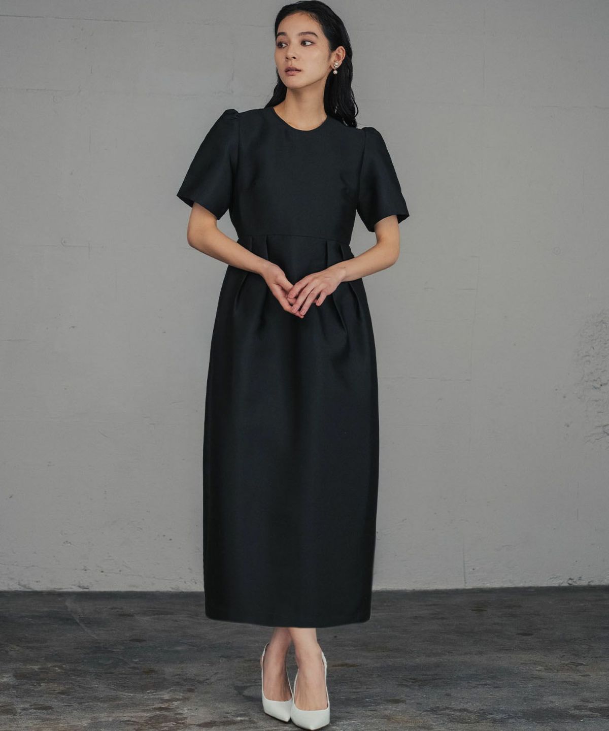 ややゆとりのあるコクーンシルエットでハリ感があるので、身体のラインを拾わず足元までカバーします。