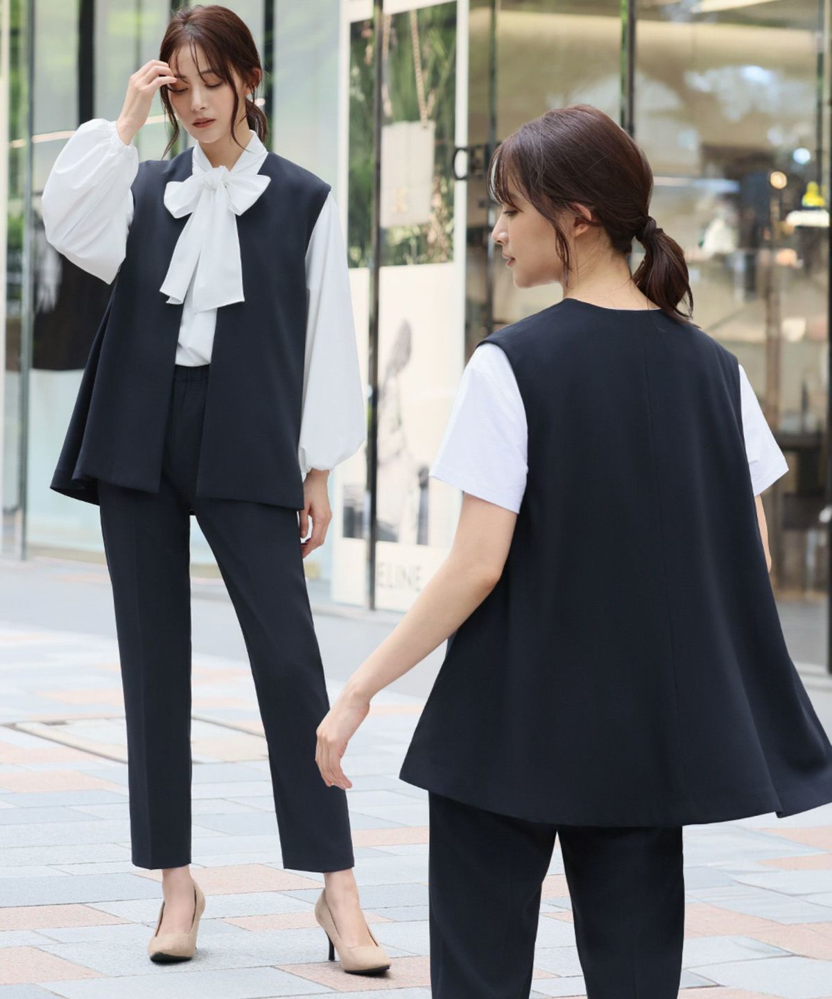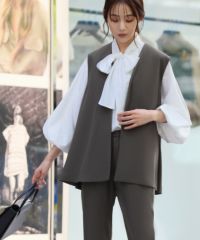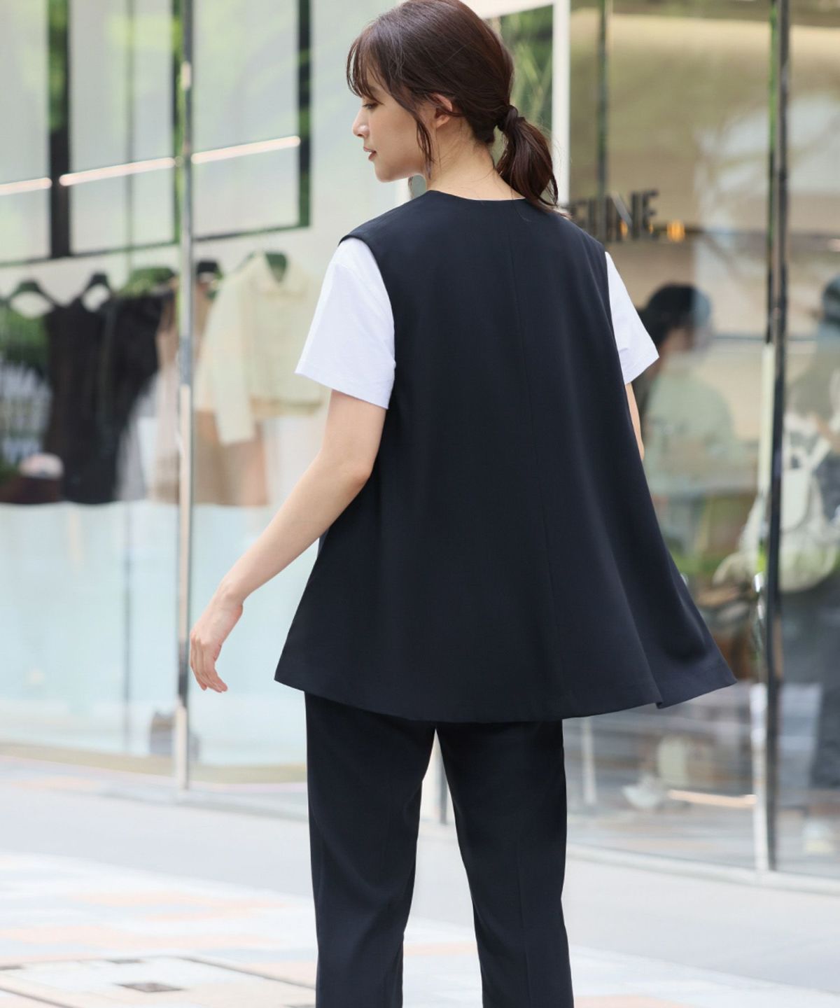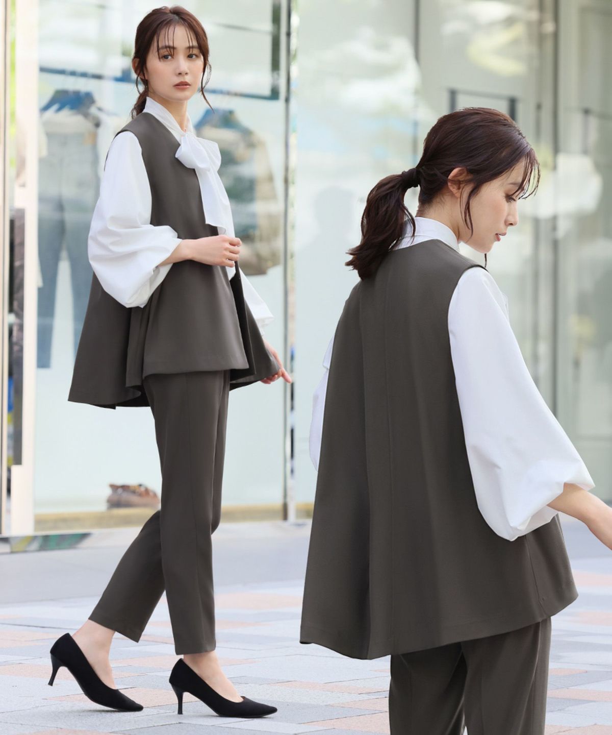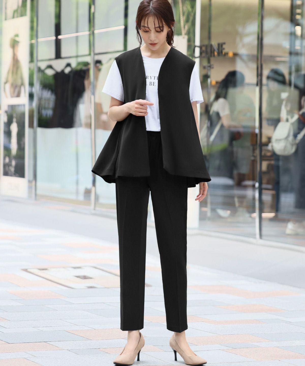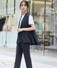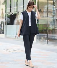 ジレはフレアシルエットでセットのテーパードパンツと合わせると脚長効果が期待できます。