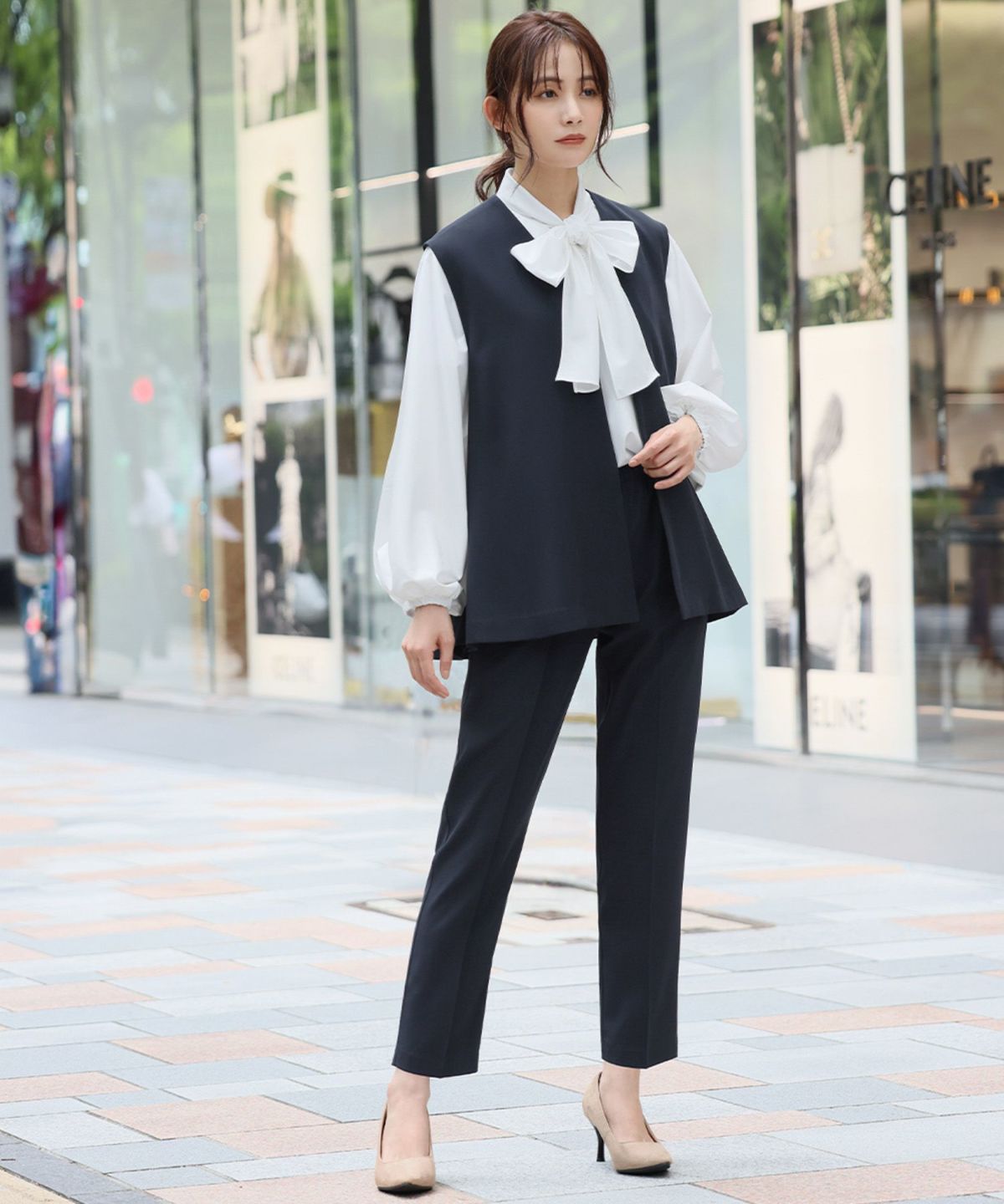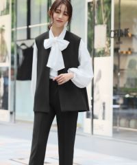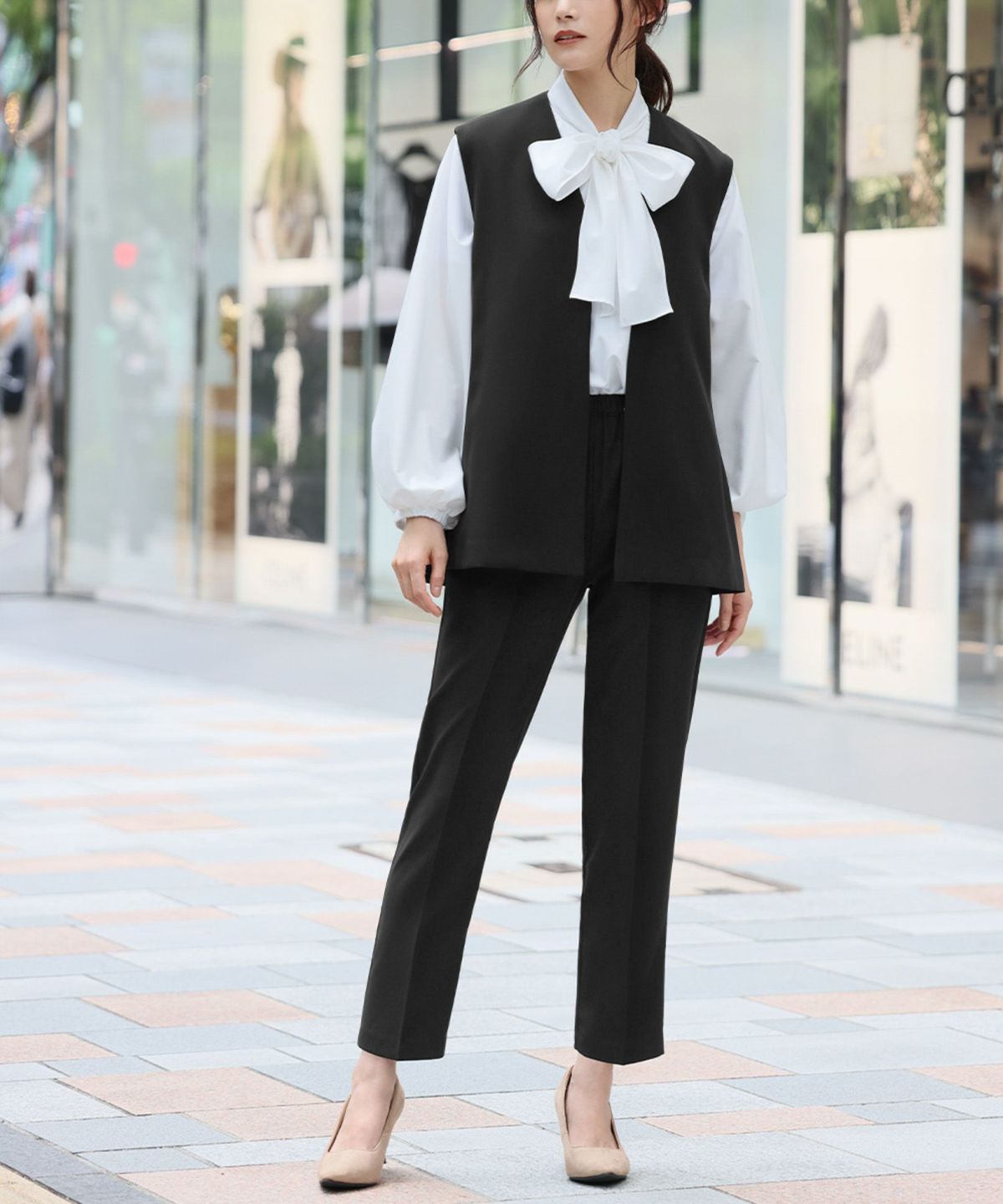 V開きAラインジレにふんわりとしたボウタイブラウス、オンオフ使える美脚ストレートパンツまで付いたお得感のある3点セットアップスーツ。