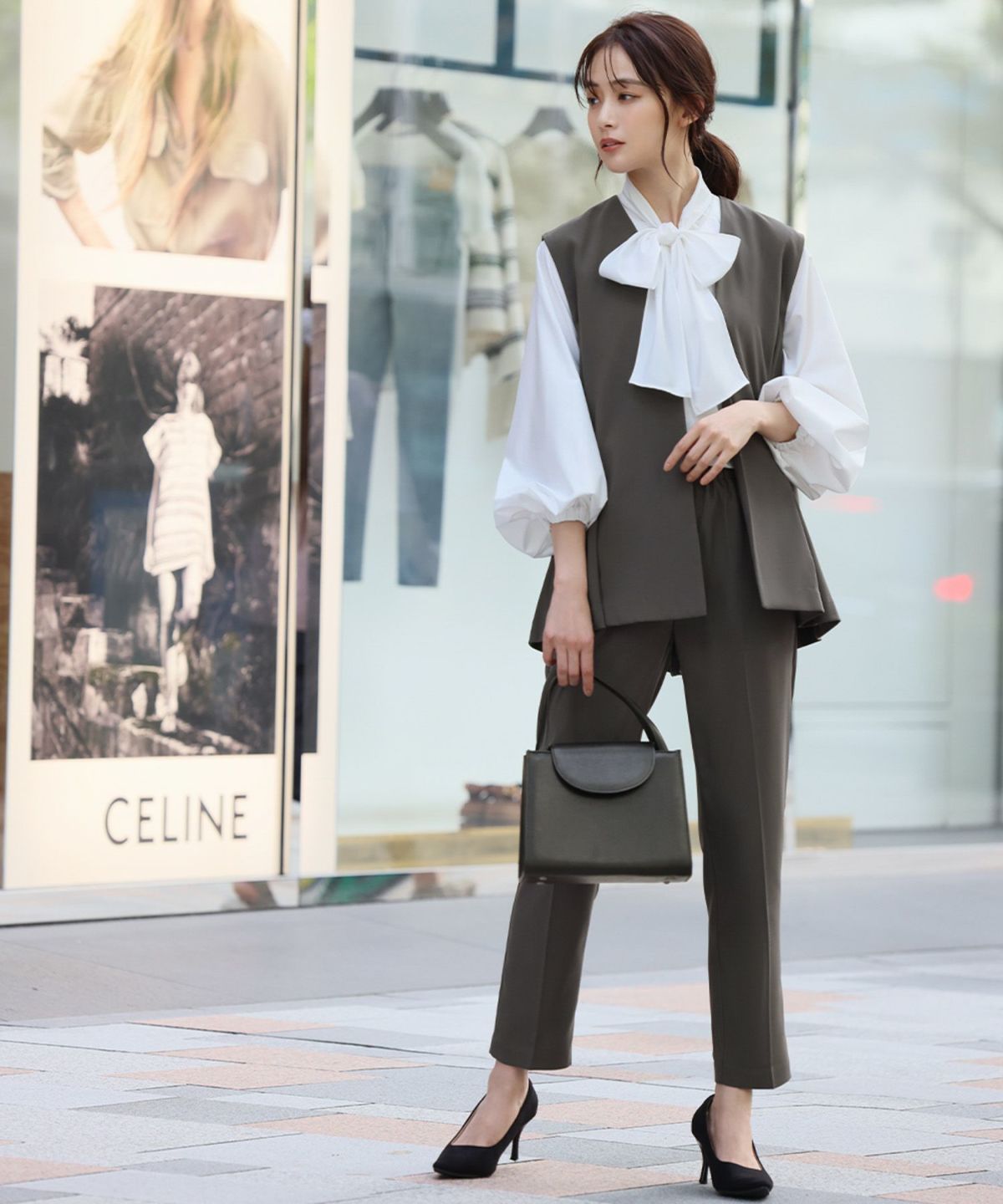 華やかなボウタイブラウスはどんなボトムスにも合わせやすいので、セットパンツと合わせてオフィスカジュアルとしても◎。
