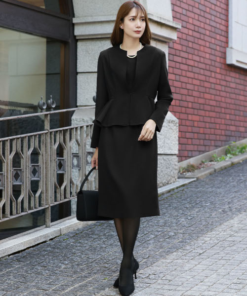 ジャケットとワンピースがセットになったブラックフォーマルスーツ。