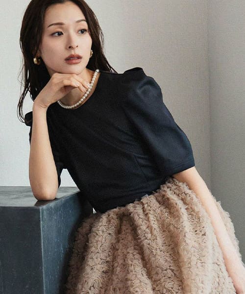 キーネックで首元をスッキリと見せ、センターラインが縦長効果を、パフショルダーが気になる二の腕もしっかりとカバーしてくれます。
