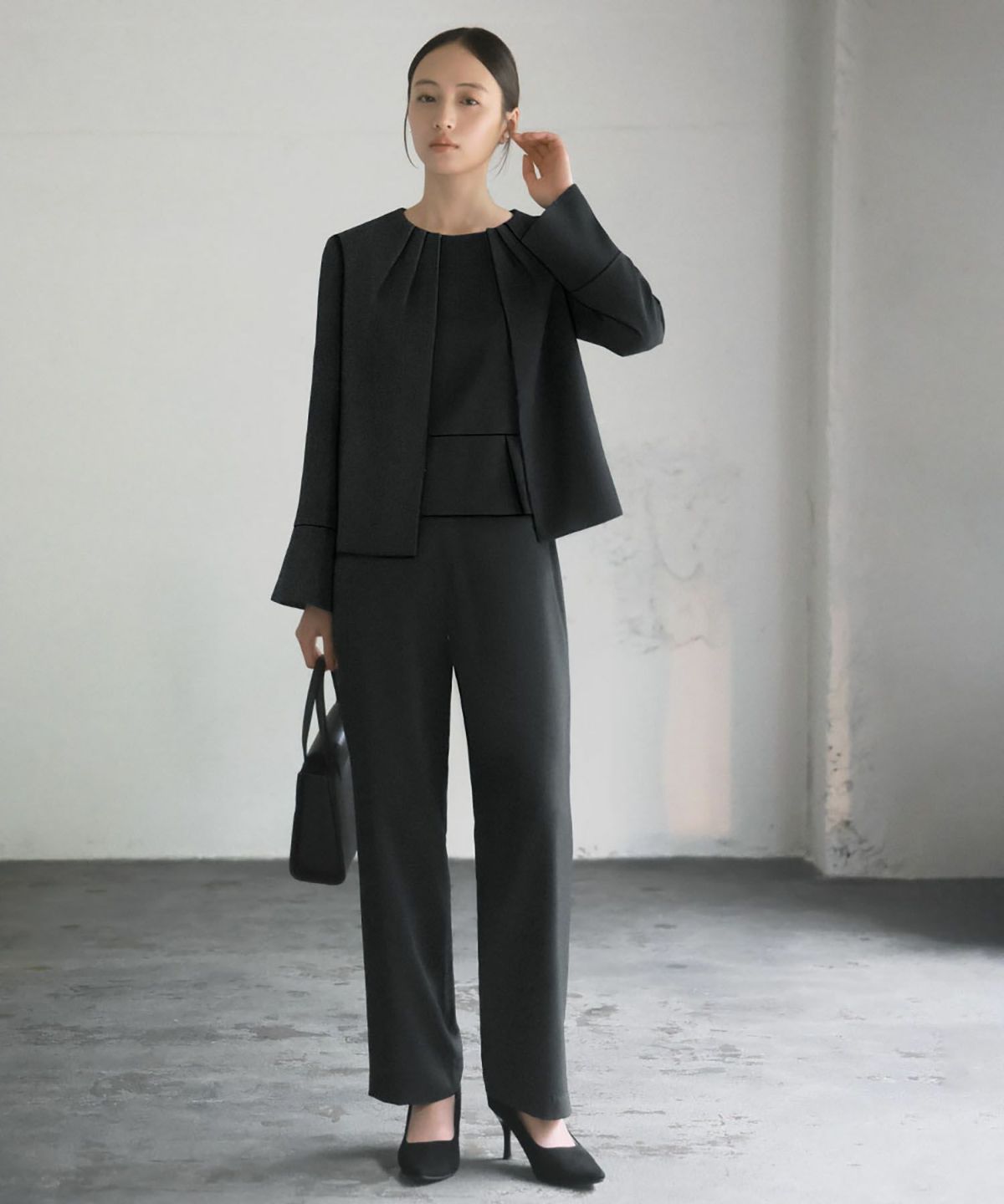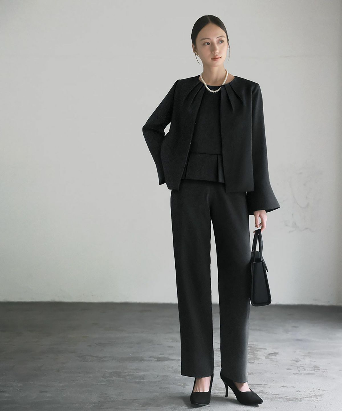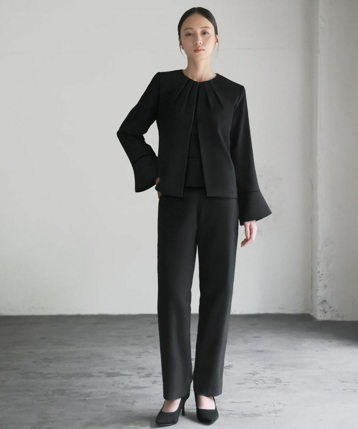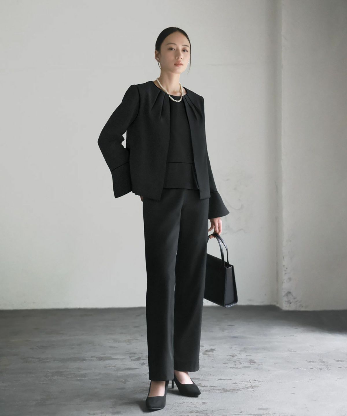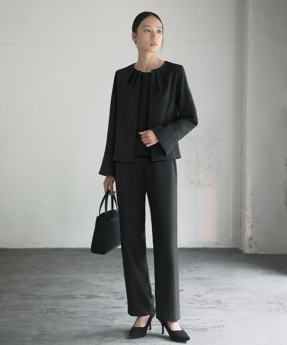 - ノーカラージャケット・ブラウス・パンツの3点セットアップセレモニースーツ