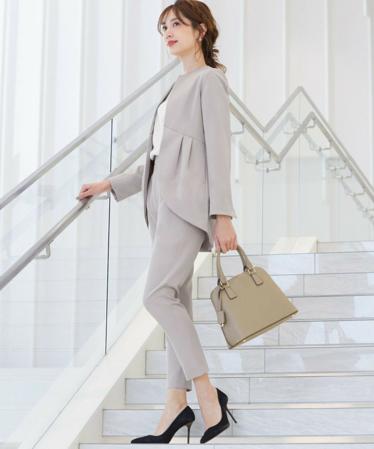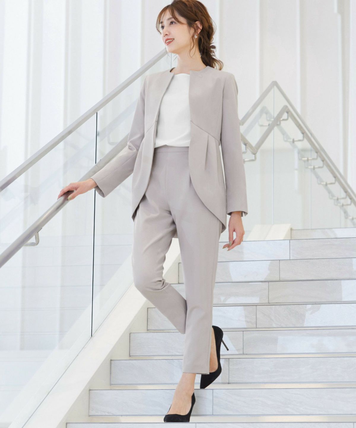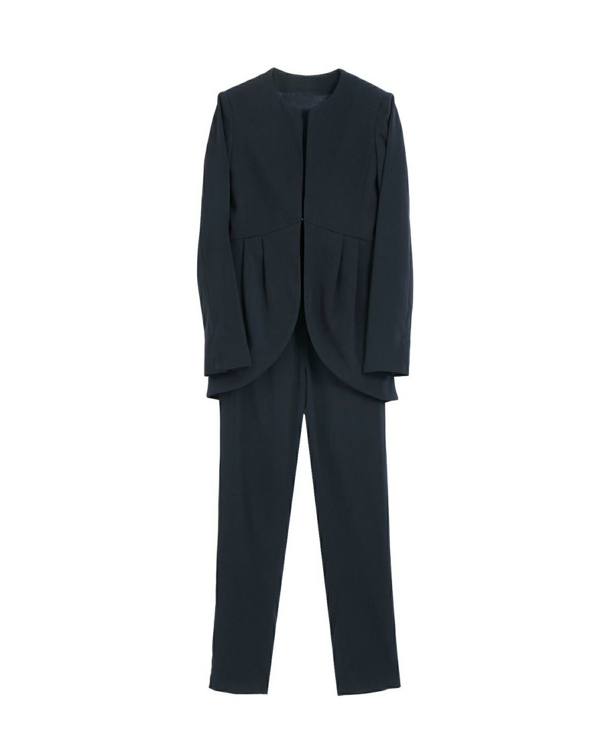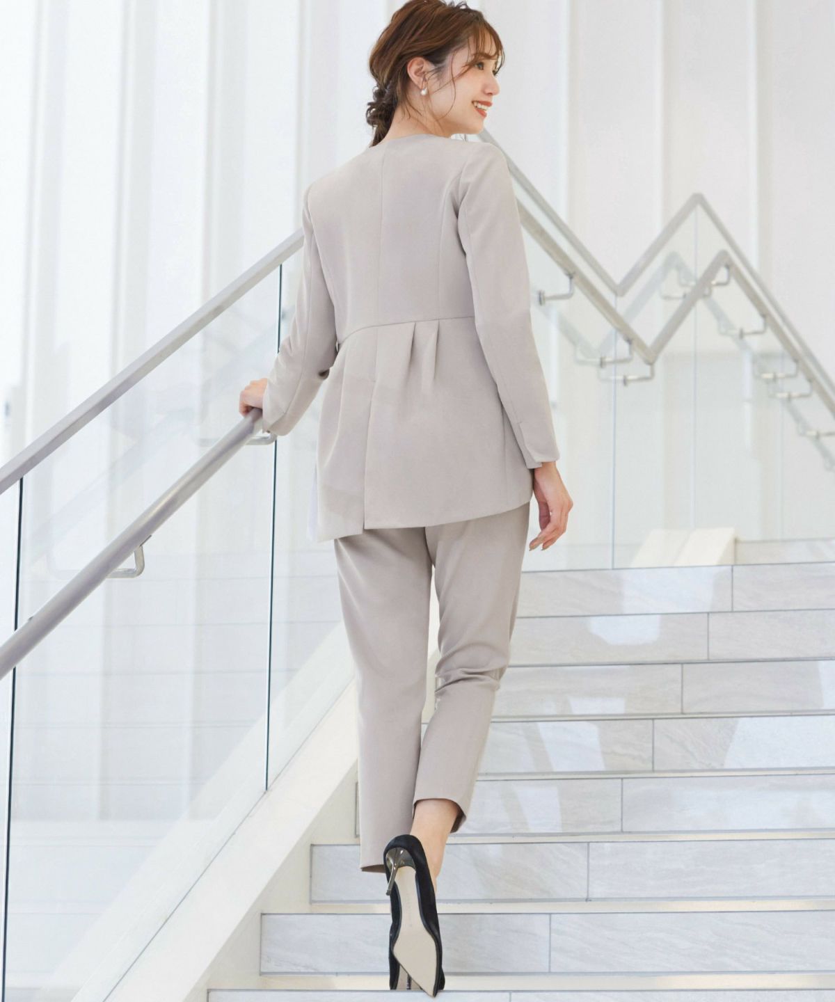 - 【着回しを楽しめる】洗えるラウンドカットノーカラージャケット&テーパードパンツの2点セットアップスーツ