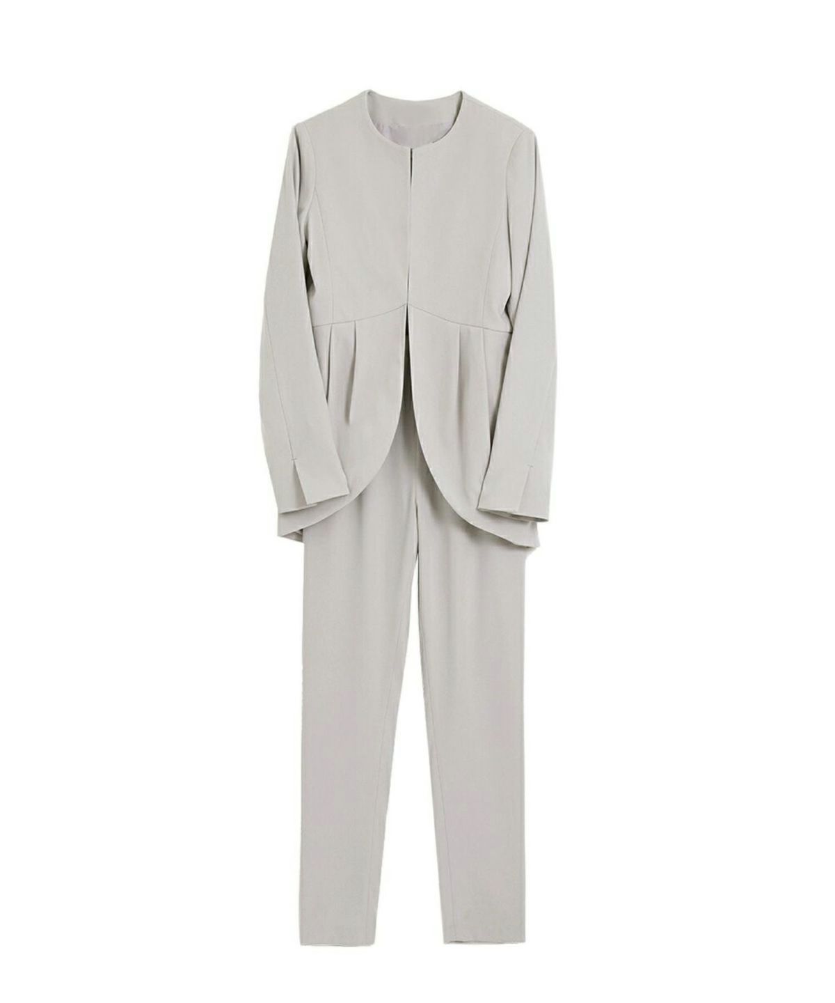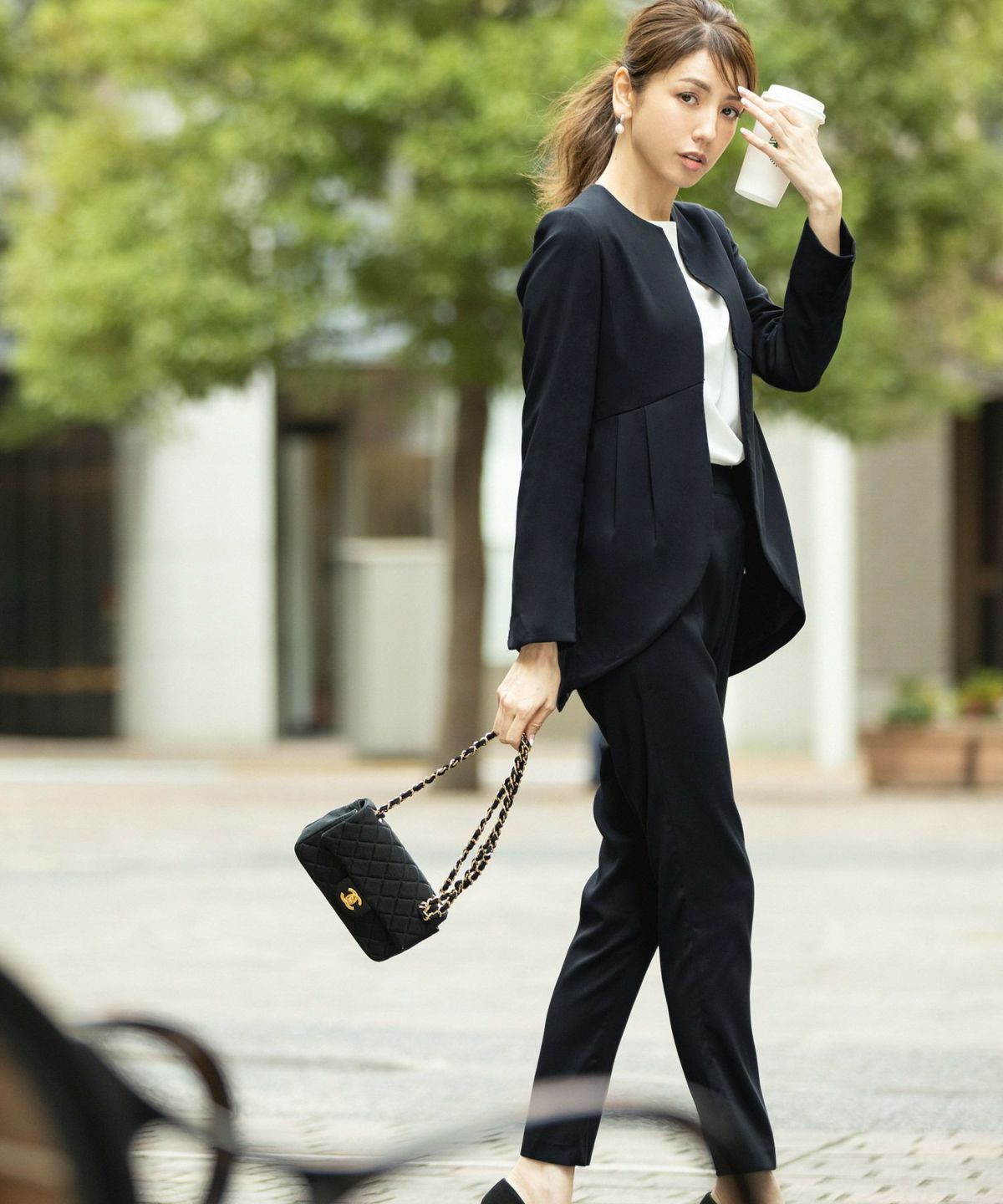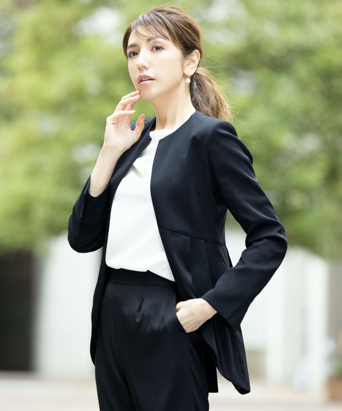 - 【着回しを楽しめる】洗えるラウンドカットノーカラージャケット&テーパードパンツの2点セットアップスーツ