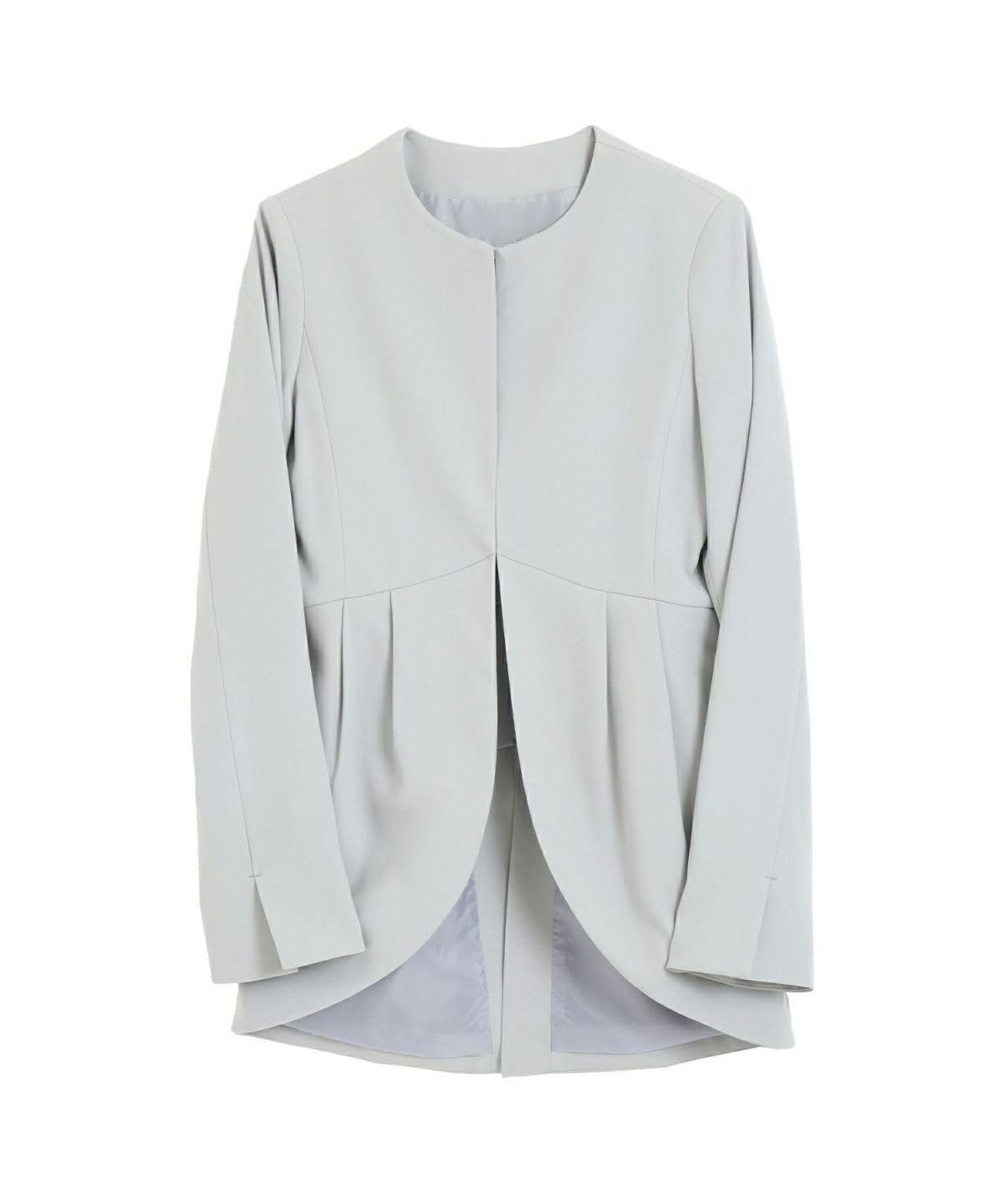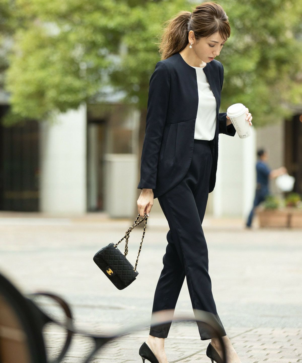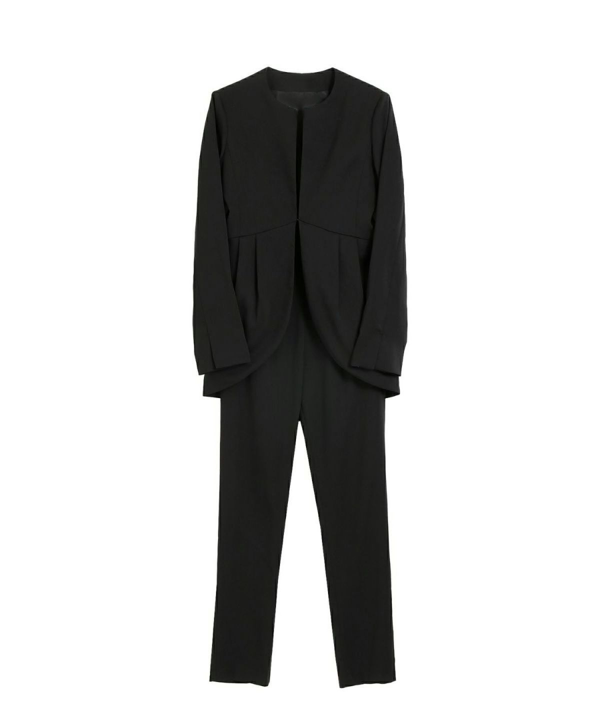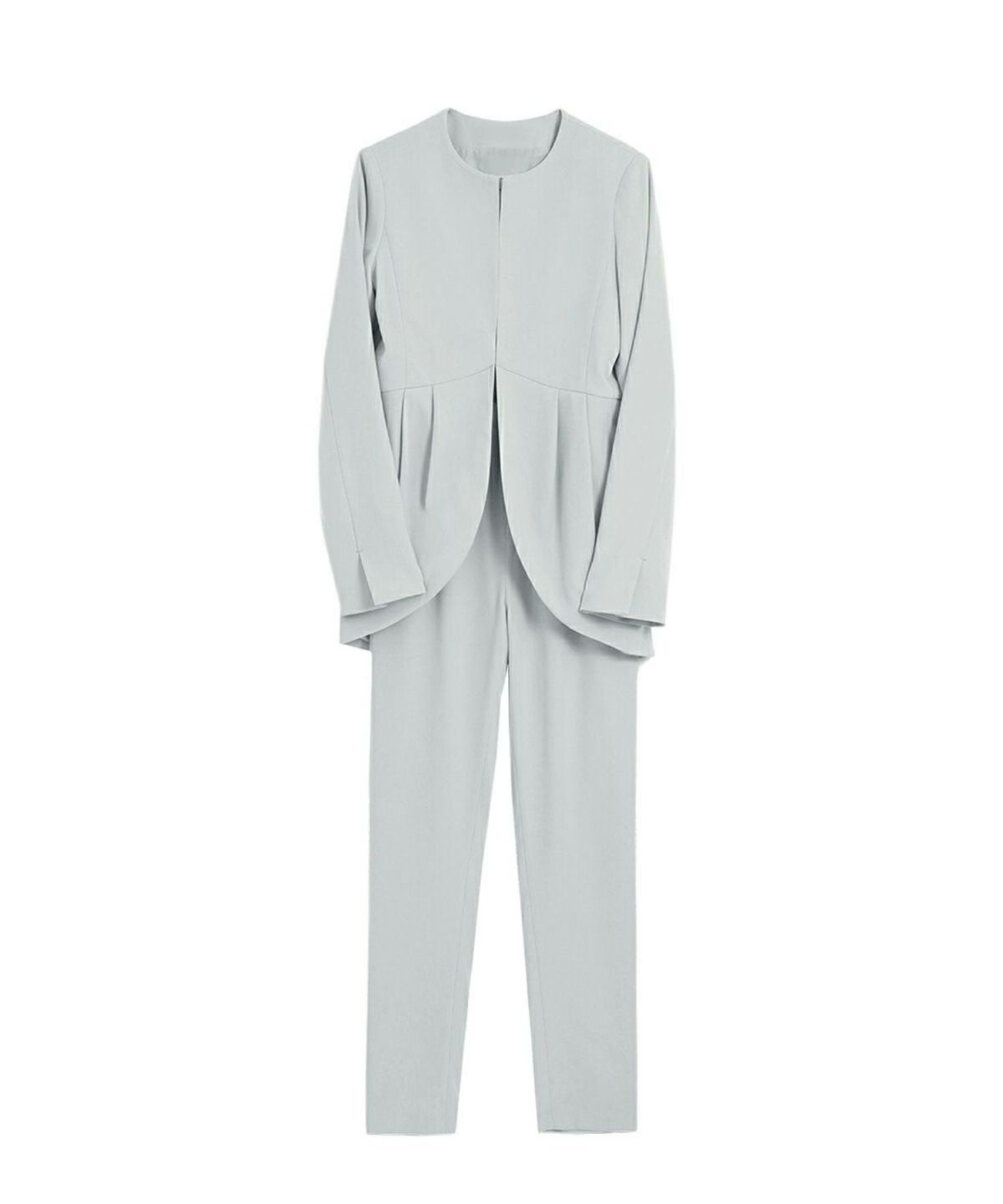 - 【着回しを楽しめる】洗えるラウンドカットノーカラージャケット&テーパードパンツの2点セットアップスーツ