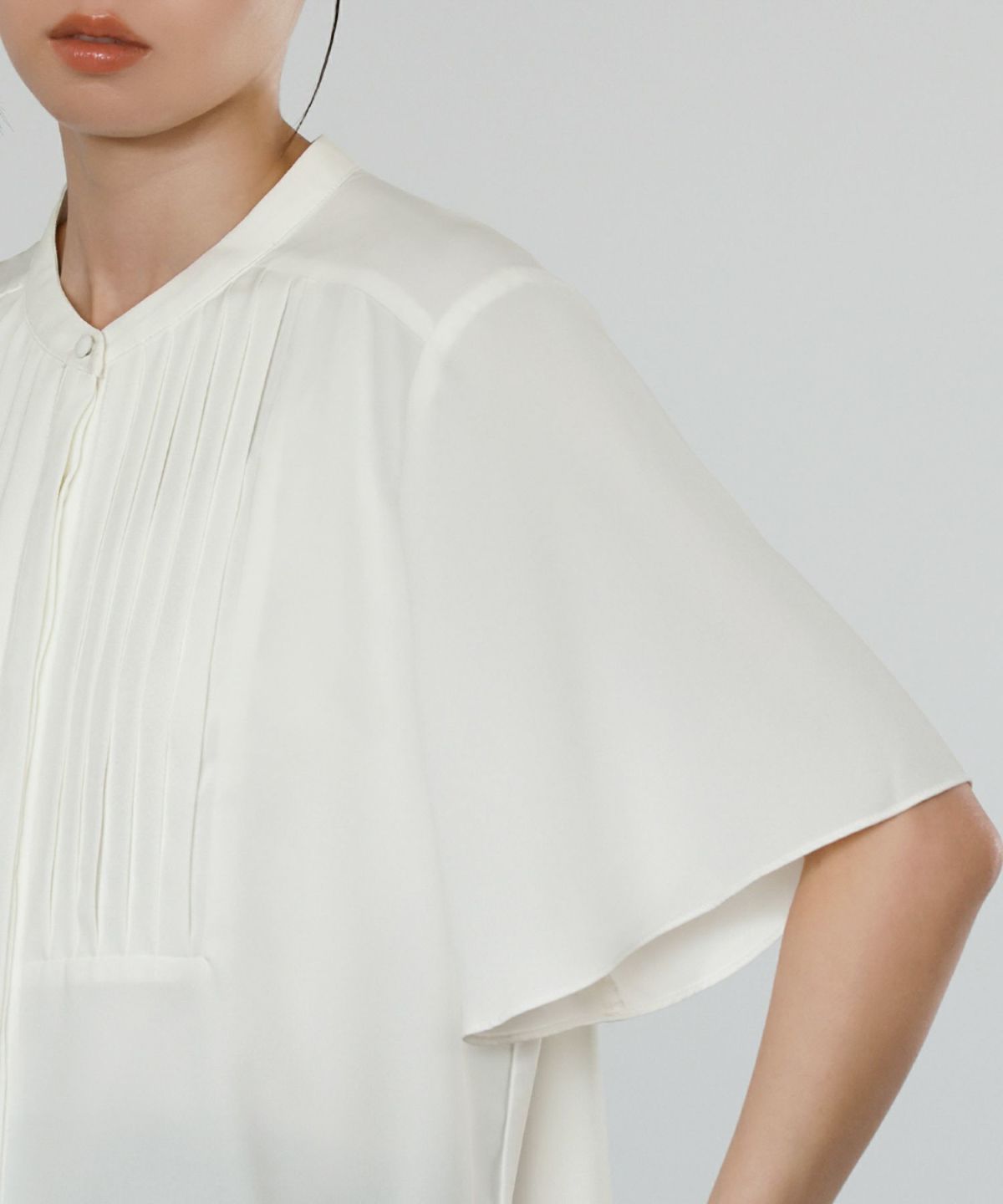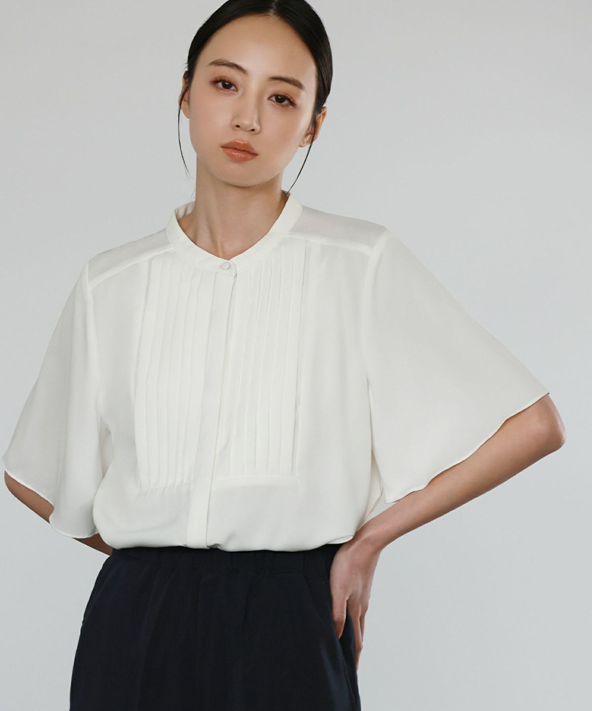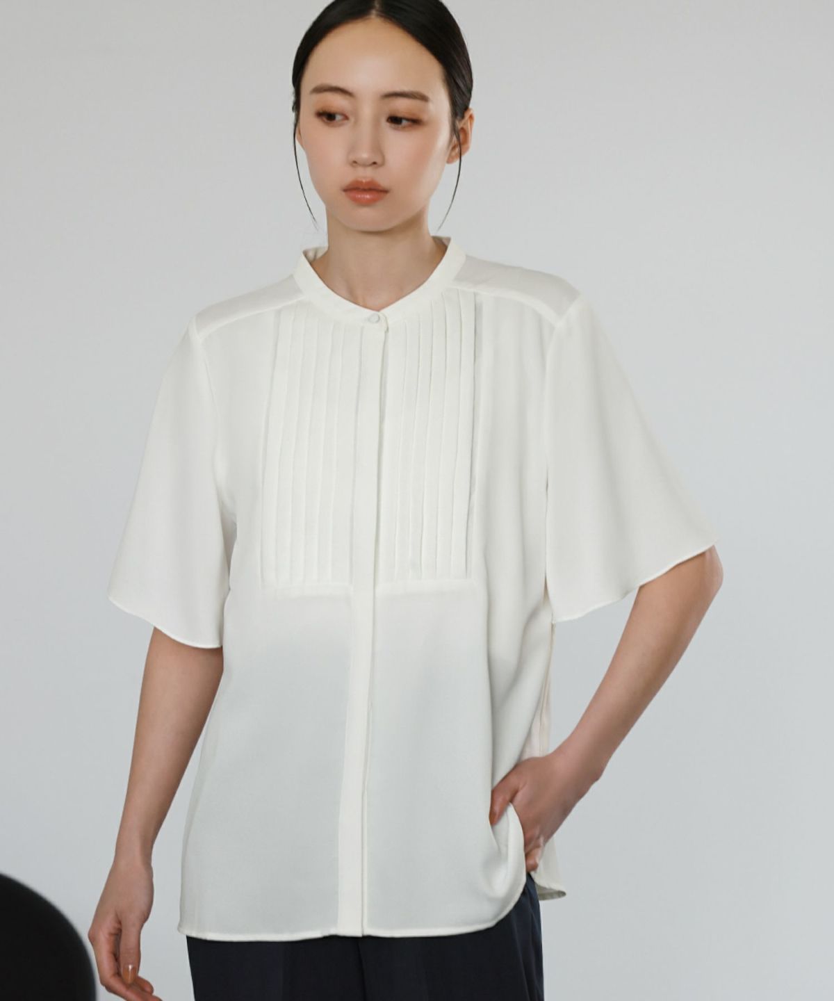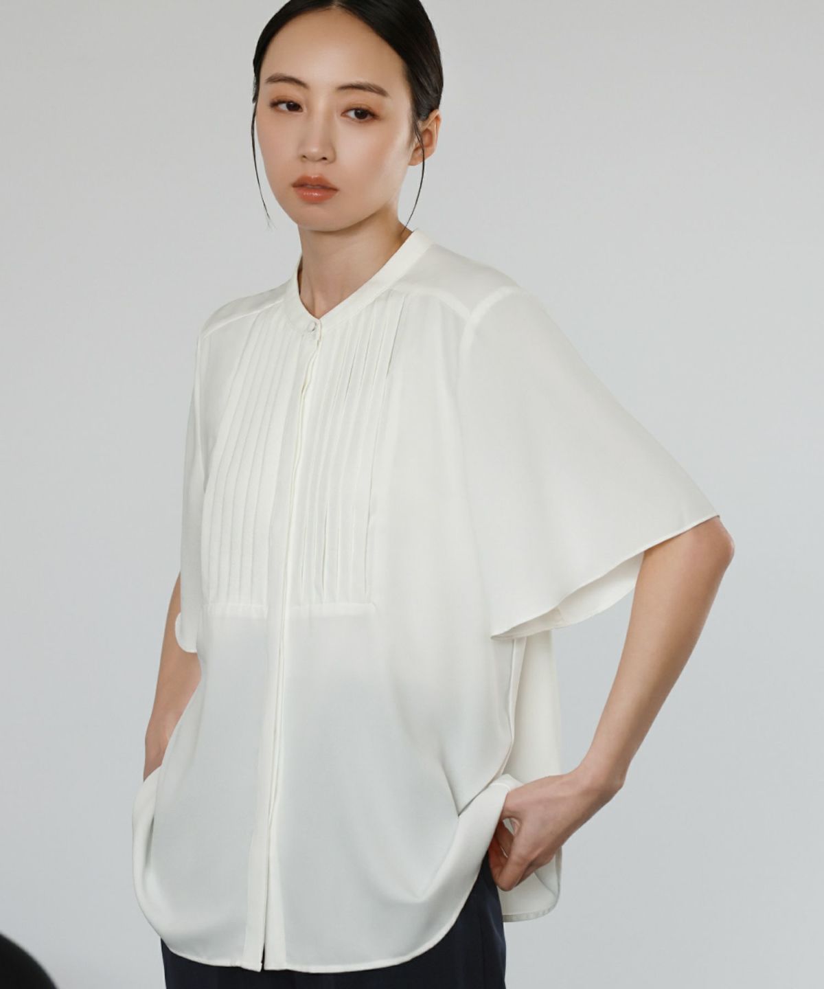 胸元切替にタックを入れたデザインがポイントのブラウス。
