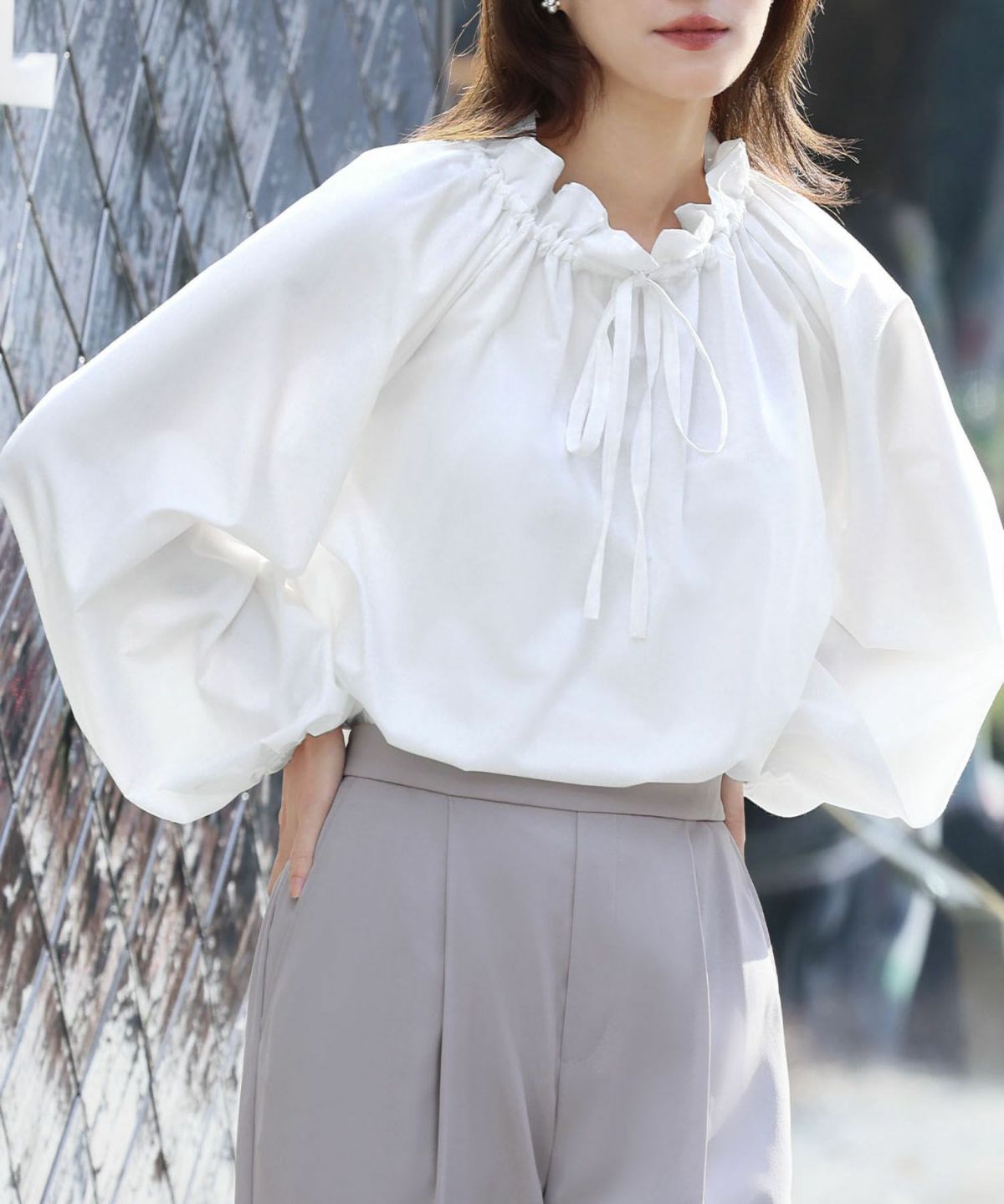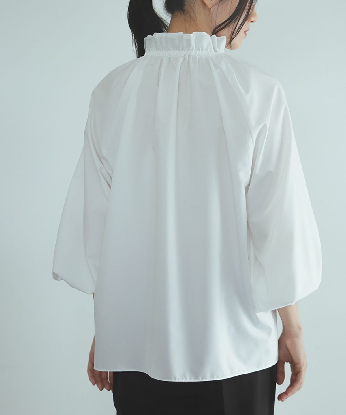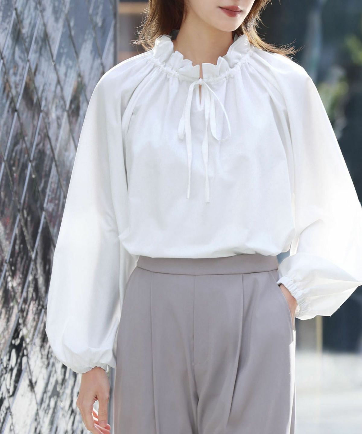 華やかさと軽さを感じられる、襟元が目を惹くギャザーフリルブラウス。