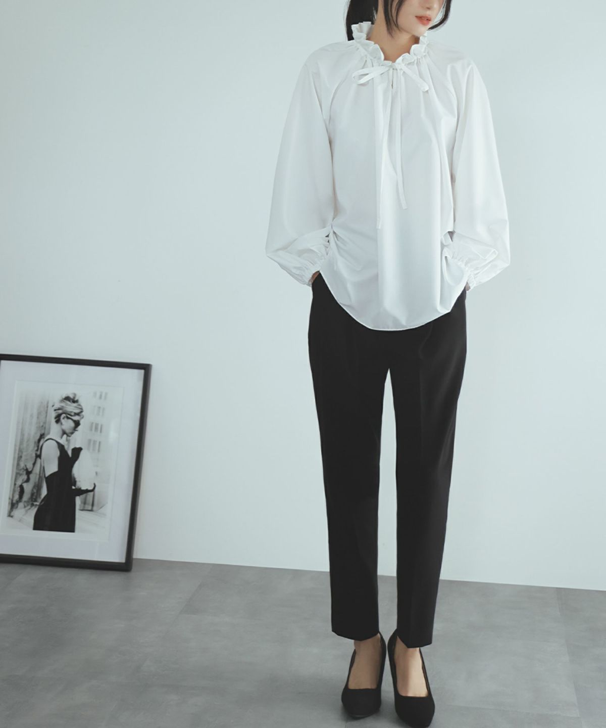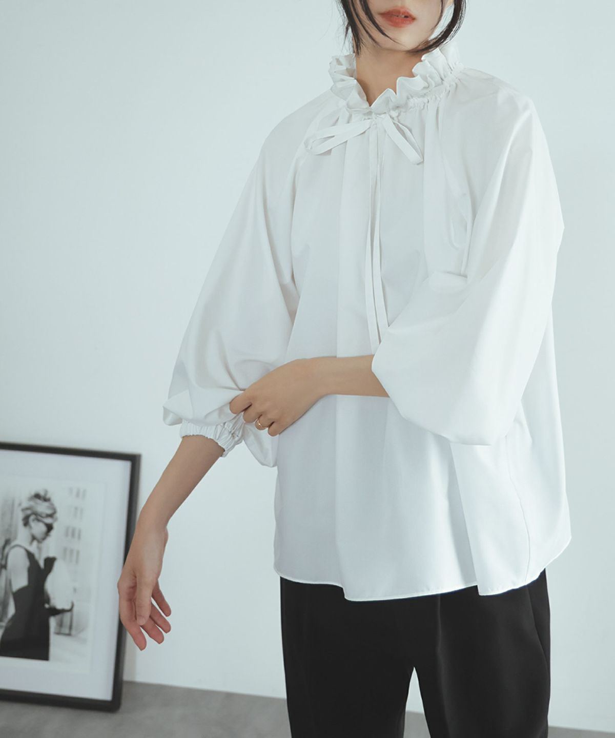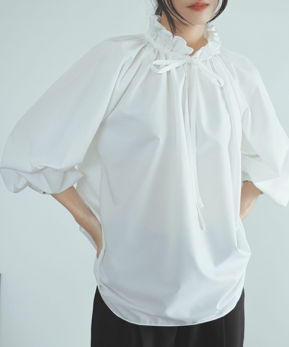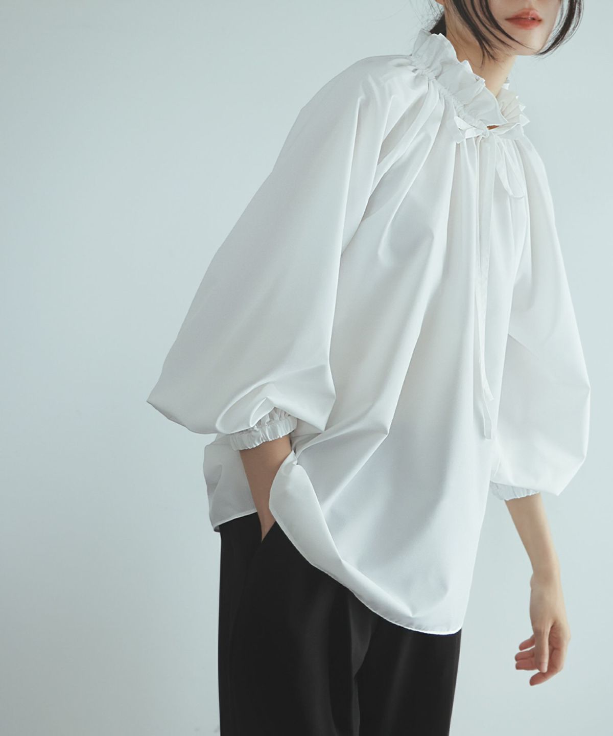 華やかさと軽さを感じられる、襟元が目を惹くギャザーフリルブラウス。