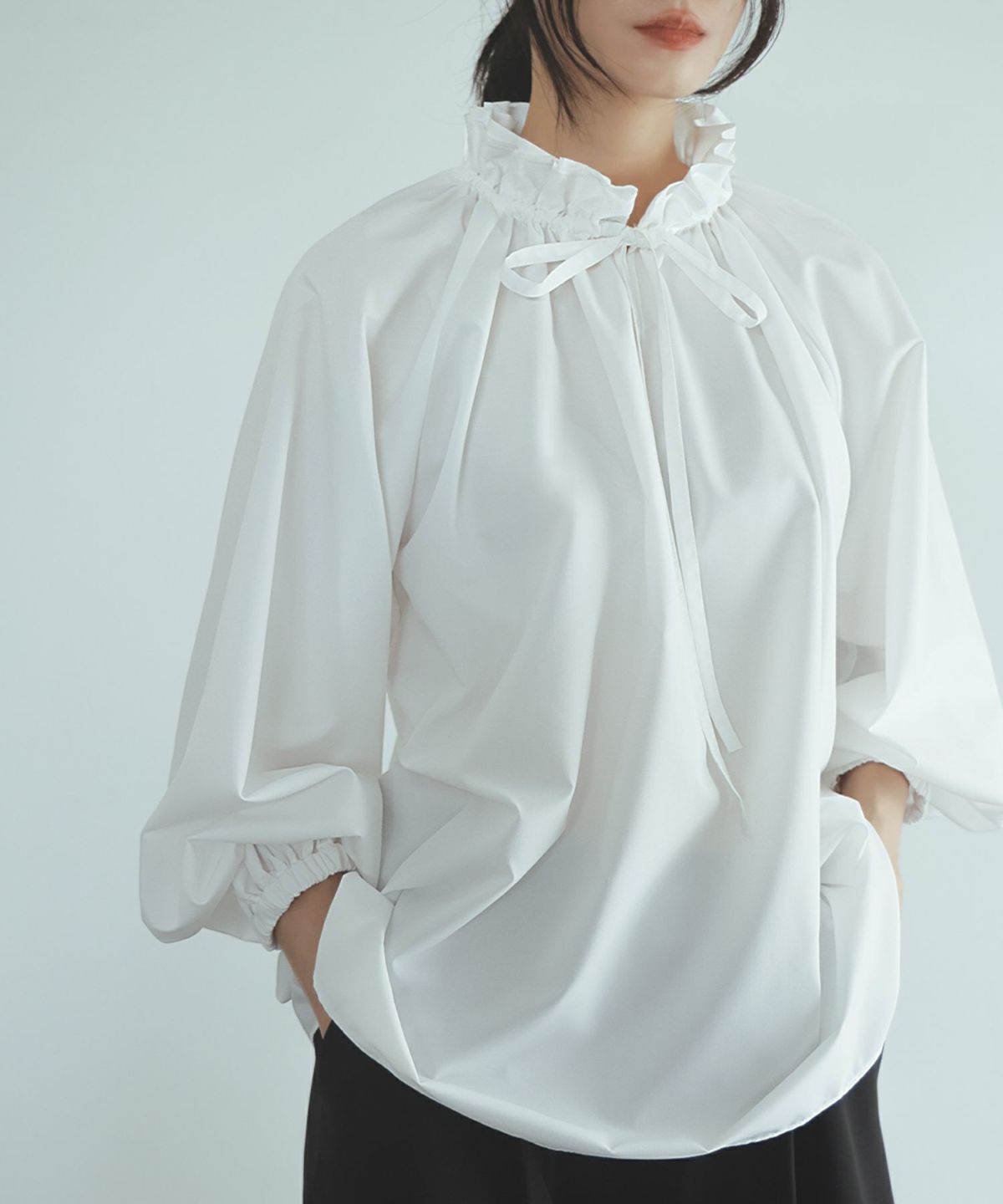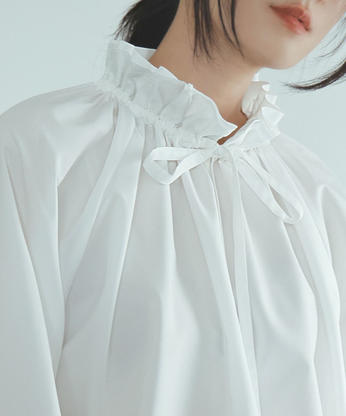 オーガンジーを重ね、たっぷりとギャザーを寄せた襟が特徴的なブラウス。